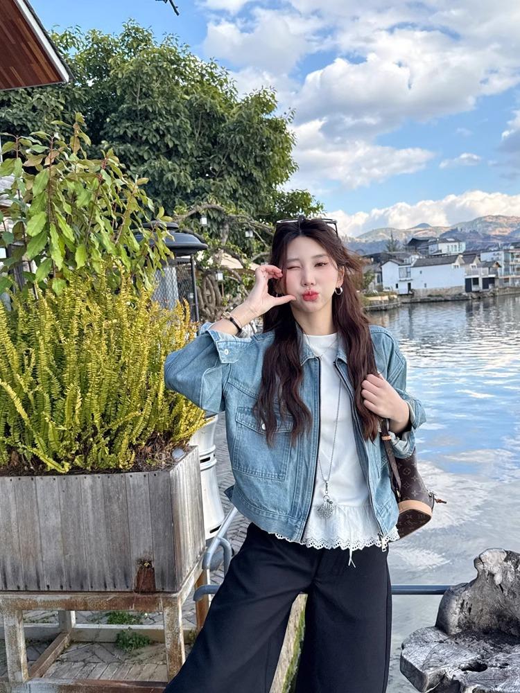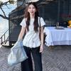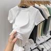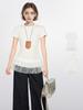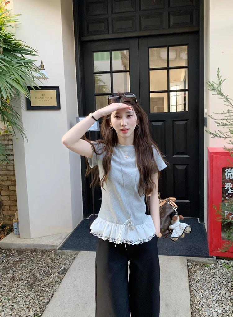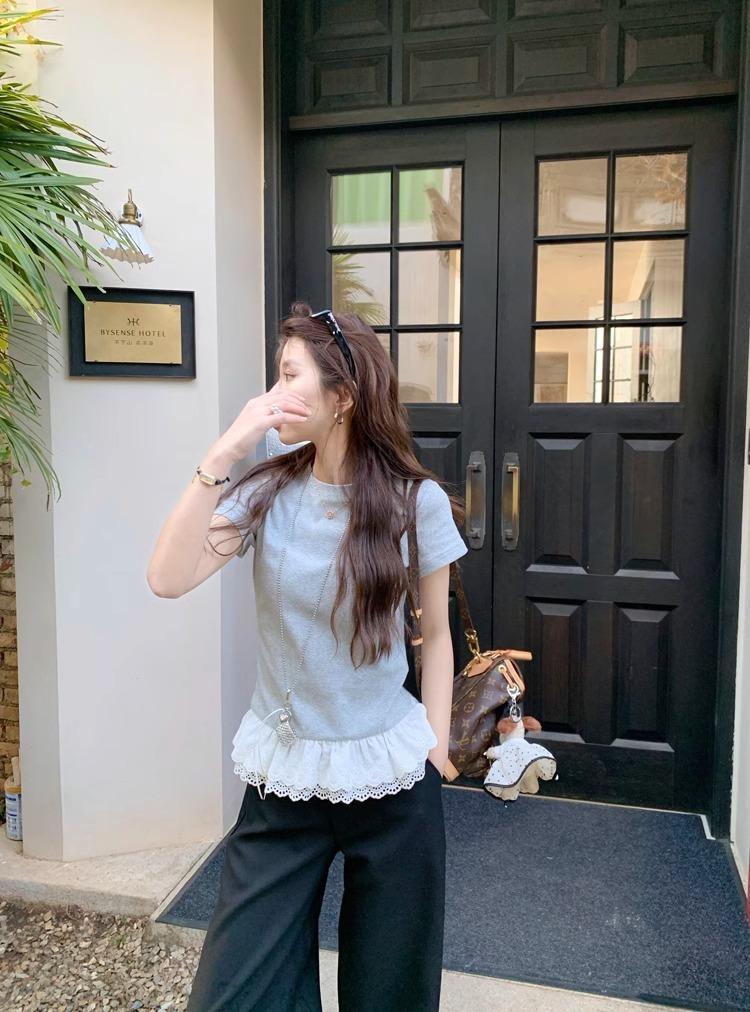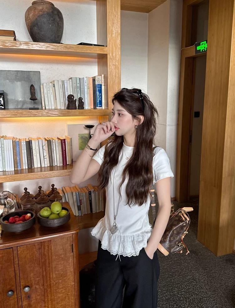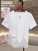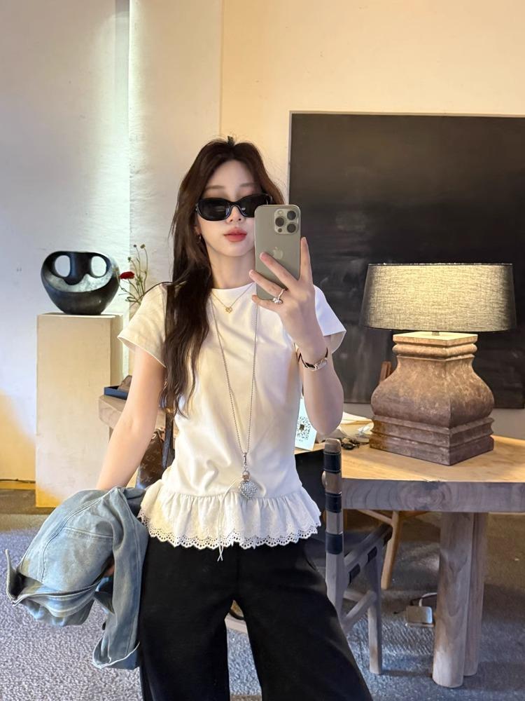 2025 nueva camiseta blanca de manga corta con ribete de encaje patchwork para mujer, verano, sentido del diseño, corta, hombro regular pequeño, camiseta top