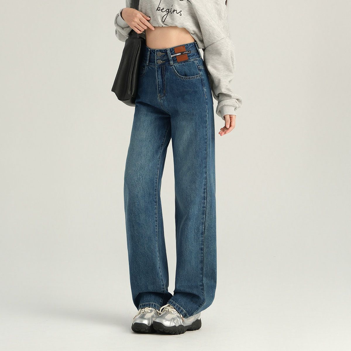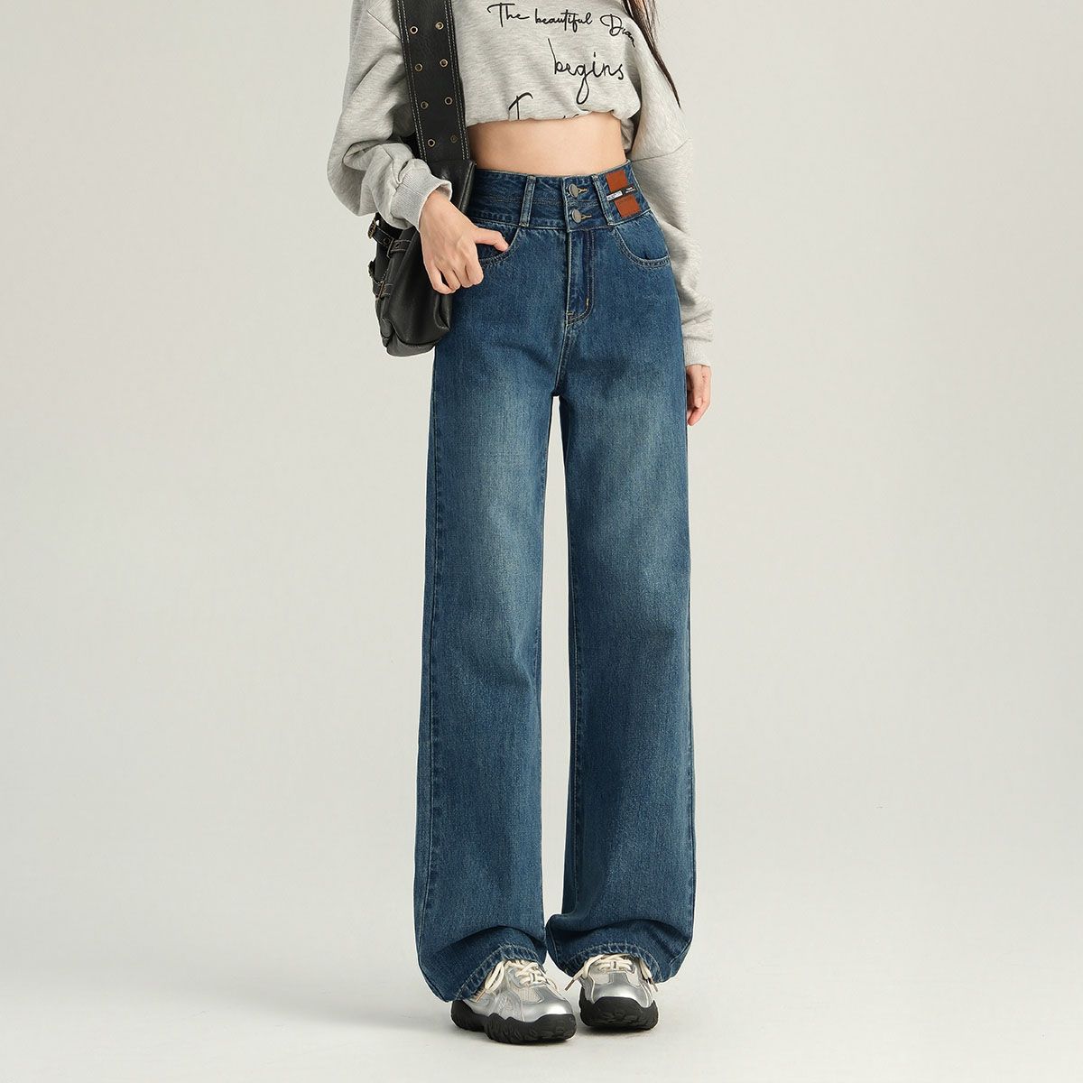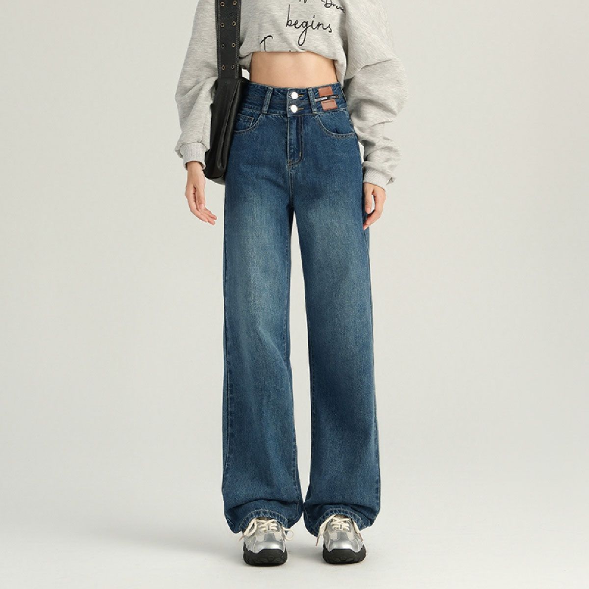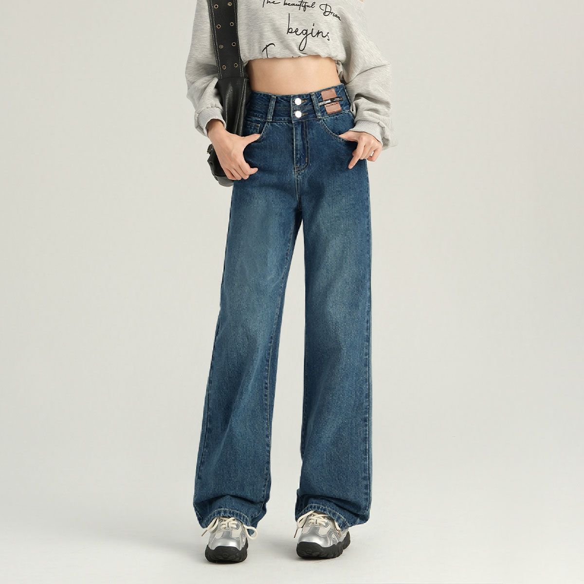 Pantalones Adelgazantes de Cintura Alta y Pierna Ancha Verano Mujer 2025 Retro Azul Drapeado Versátiles Jeans Largos hasta el Piso Dos Botones