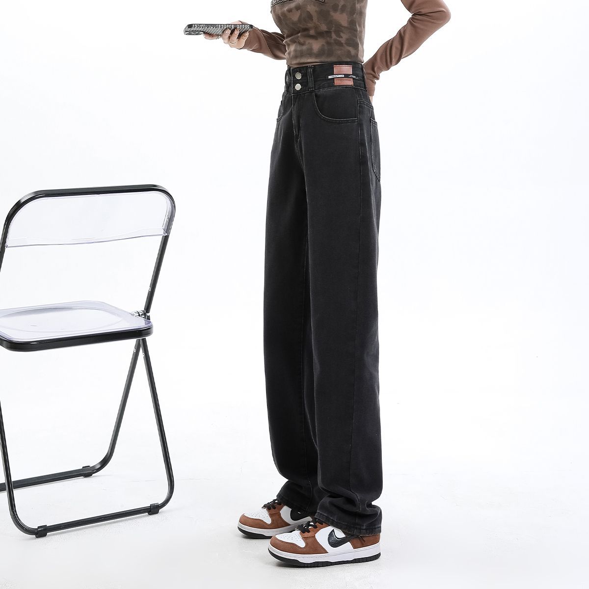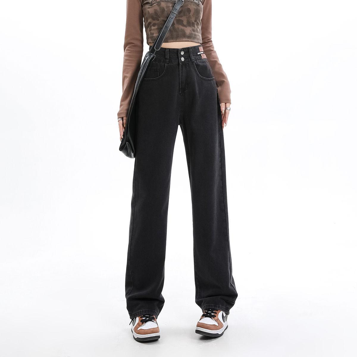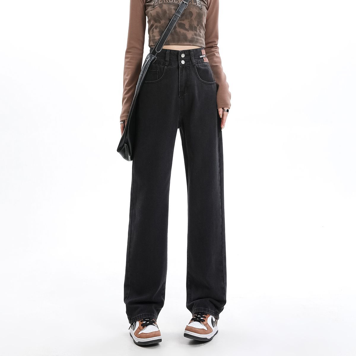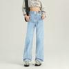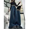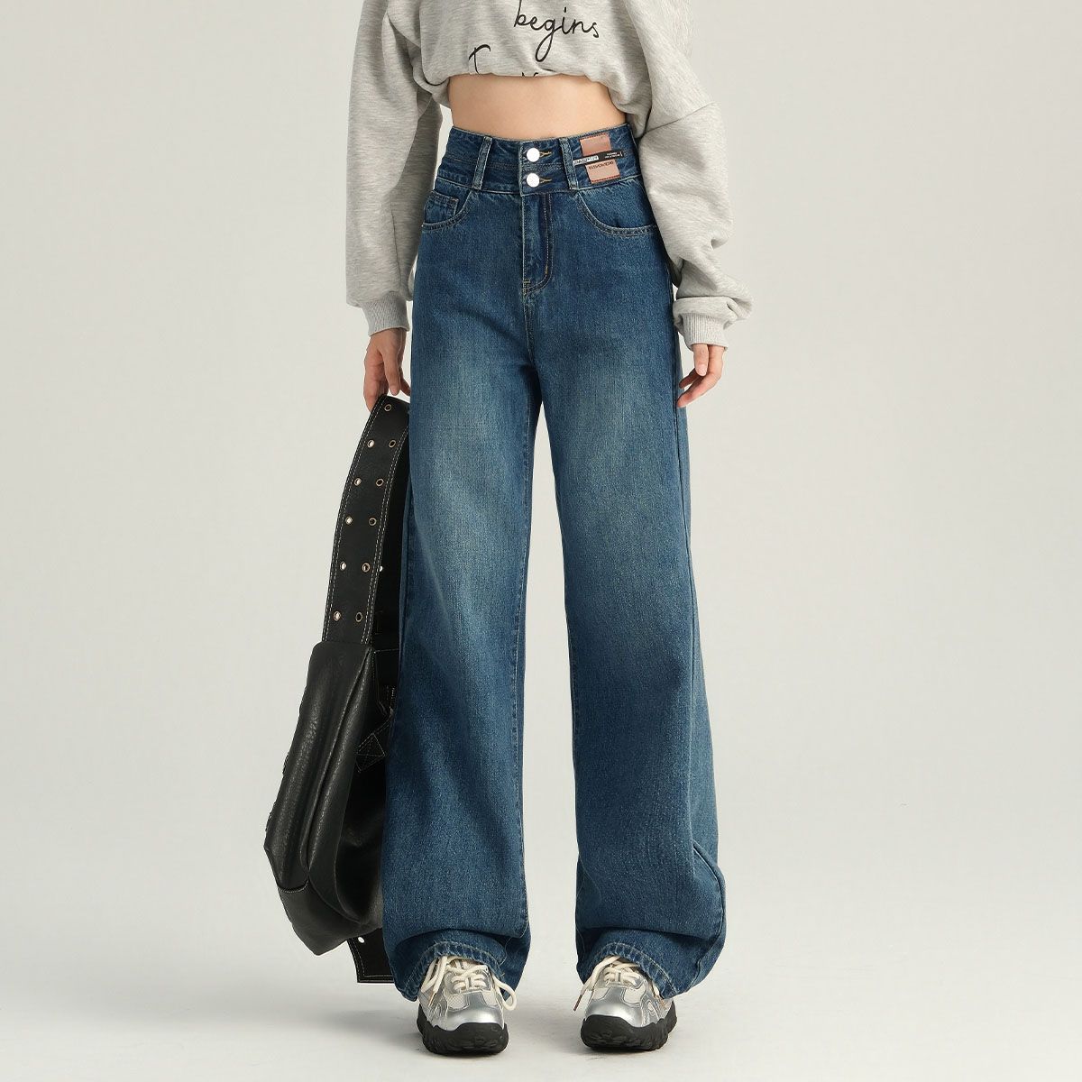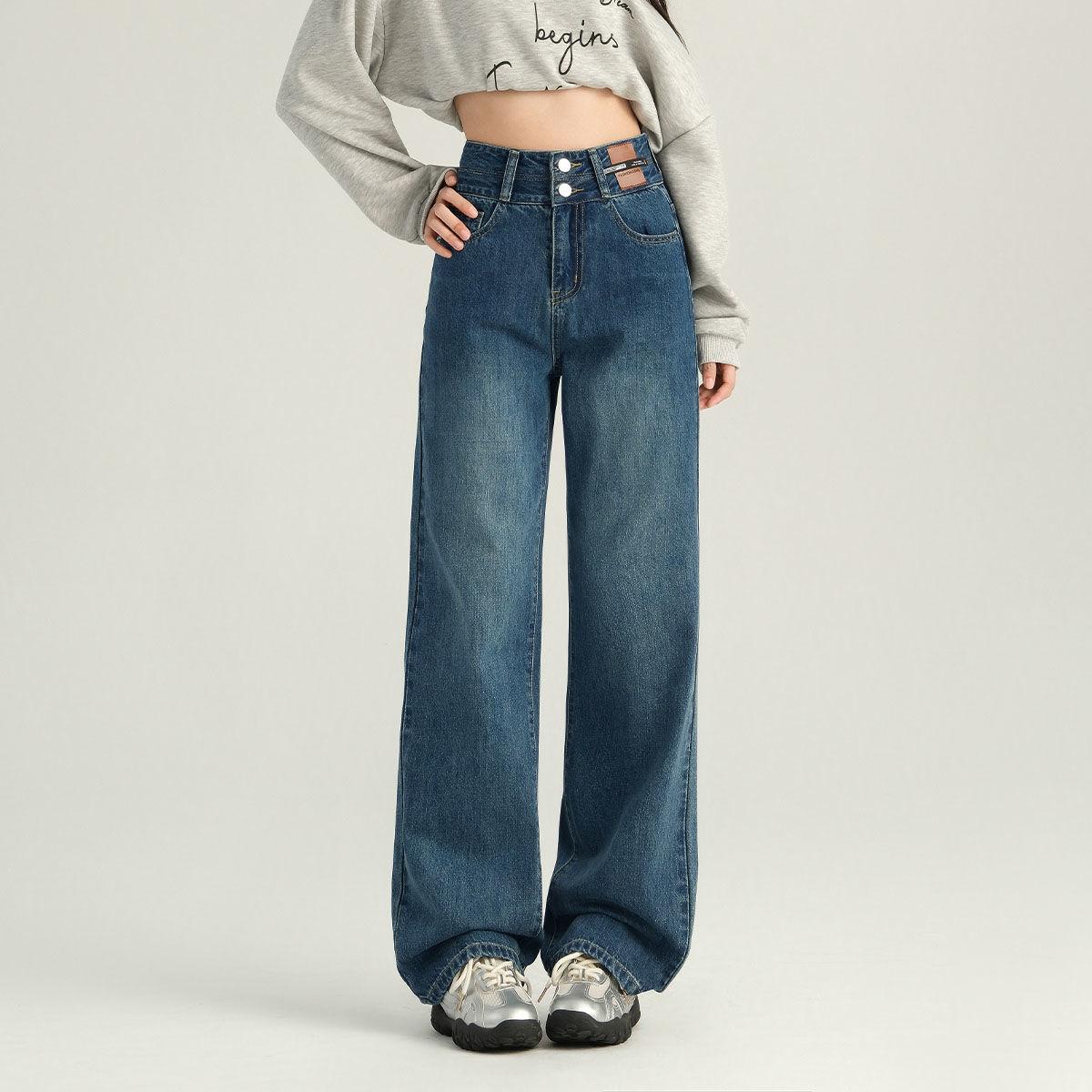 Pantalones Adelgazantes de Cintura Alta y Pierna Ancha Verano Mujer 2025 Retro Azul Drapeado Versátiles Jeans Largos hasta el Piso Dos Botones