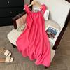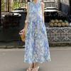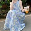 Vestido de Tirantes Azul Floral Vacaciones Junto al Mar para Mujer Verano Nuevo Estilo Suave Elegante Dobladillo Grande Línea A Falda Larga