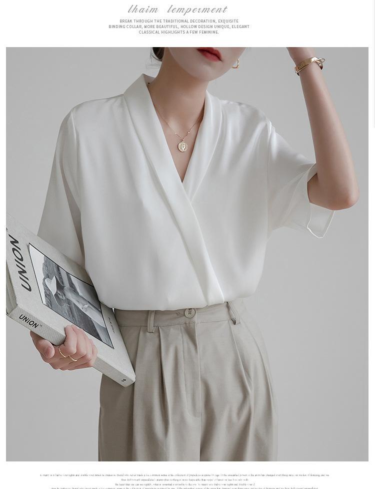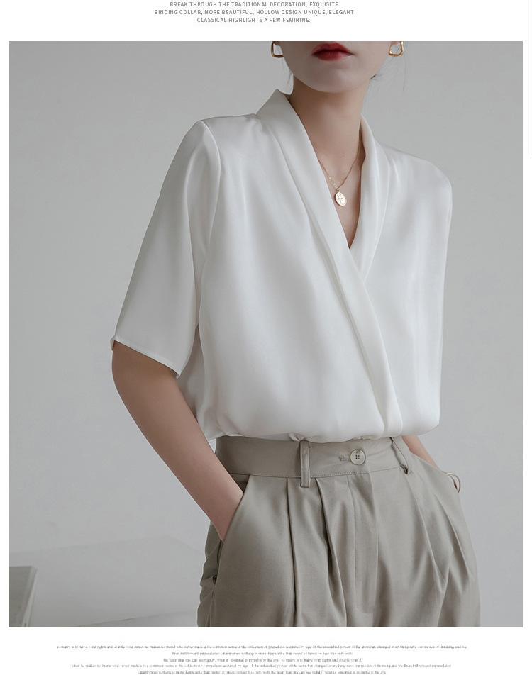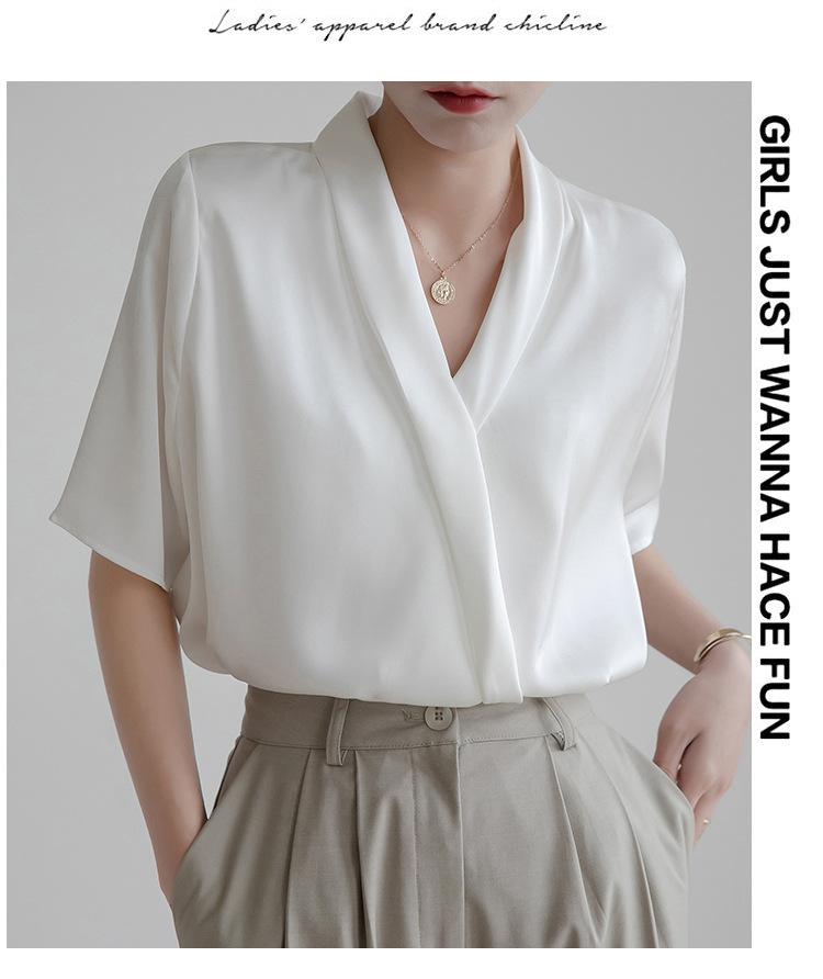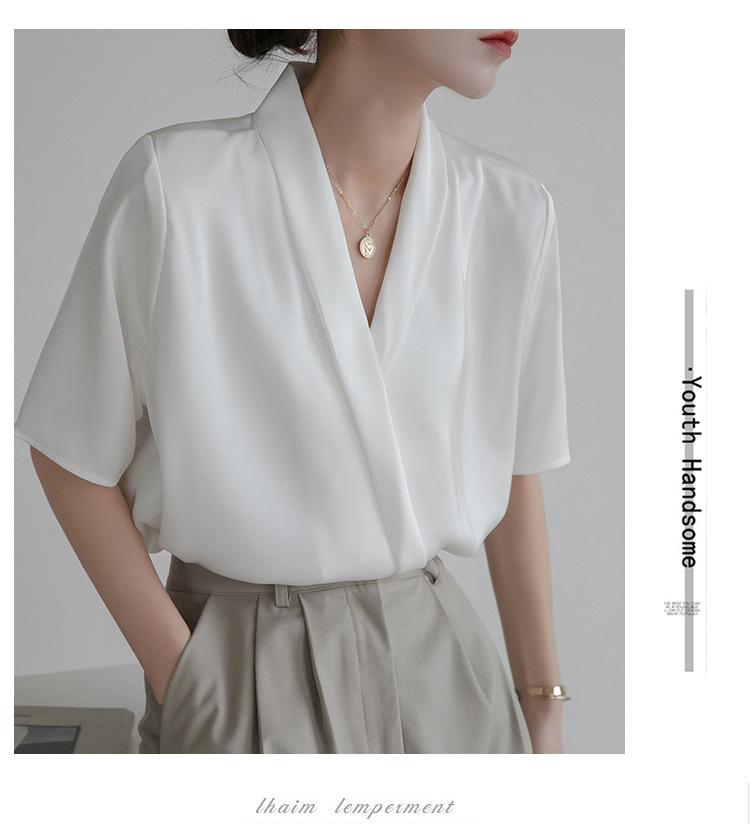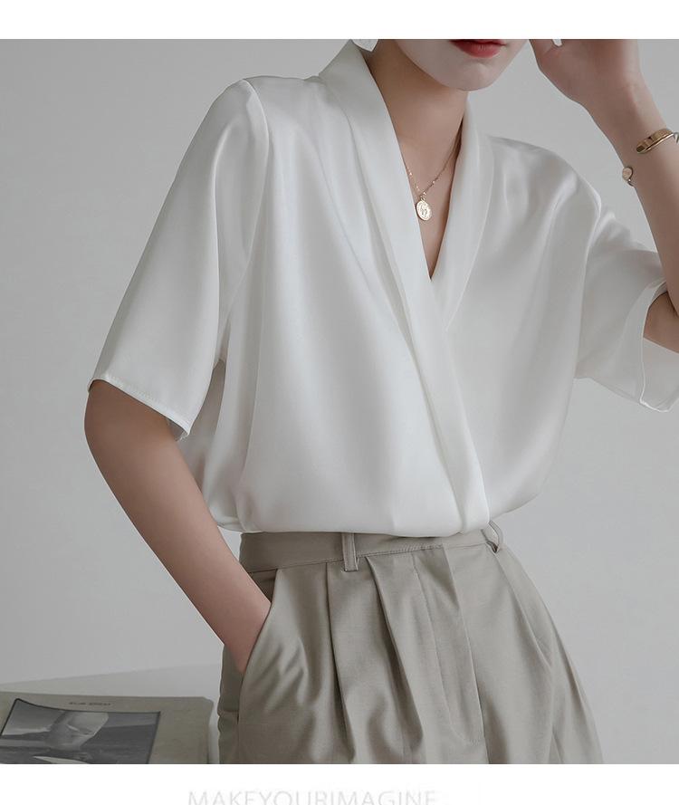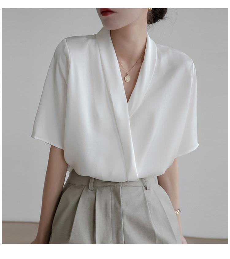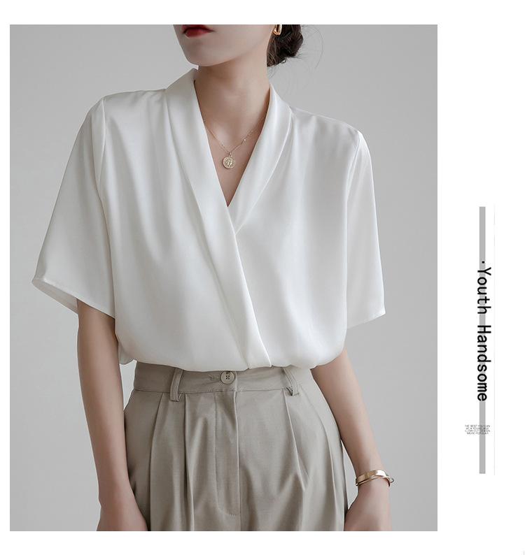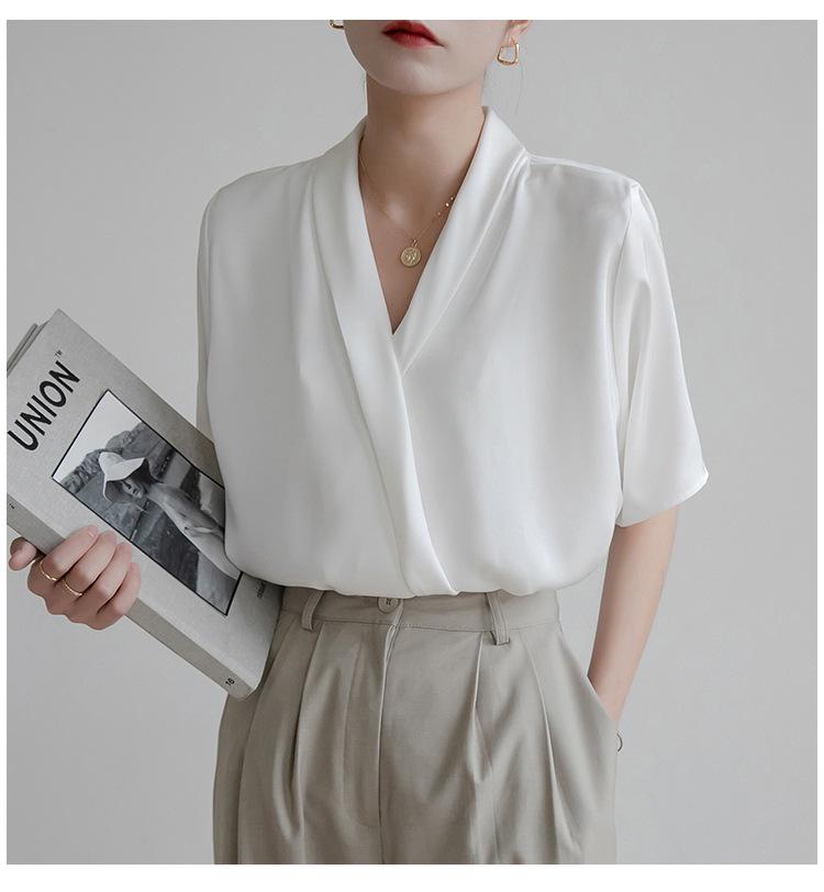 Camisa Blanca de Manga Corta de Verano 2023 para Mujer, Diseño Versátil Suelto de Satén con Sentido del Estilo, Top Nicho con Cuello en V