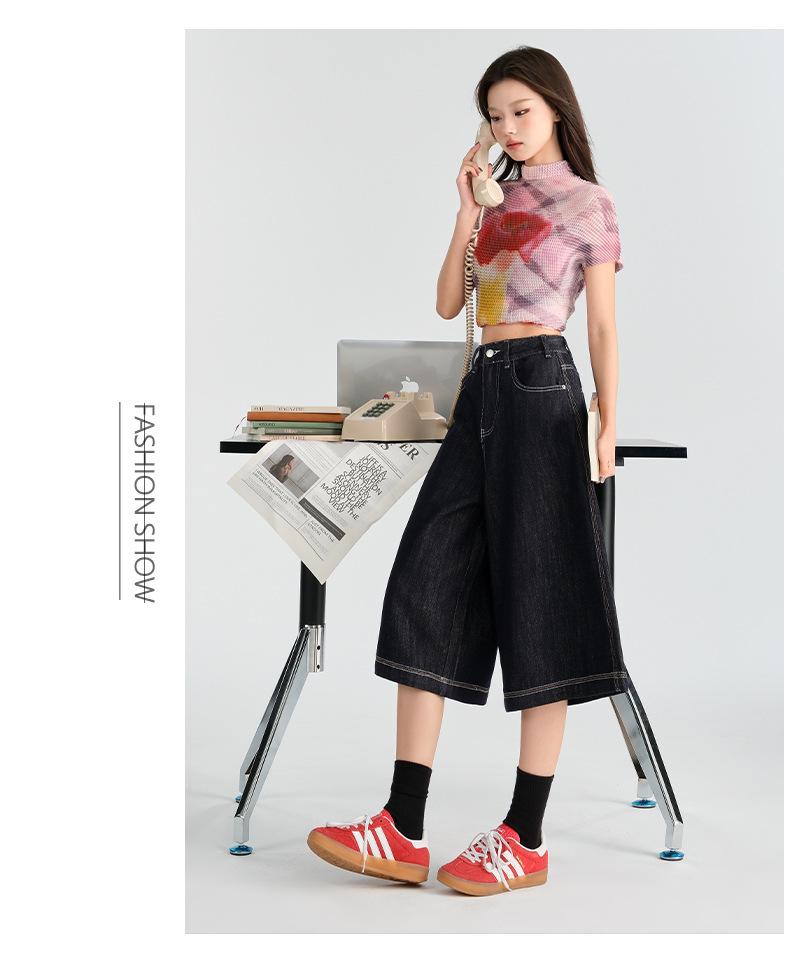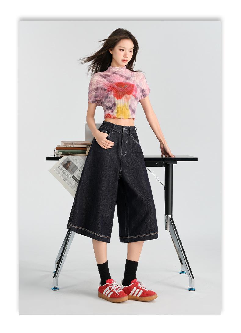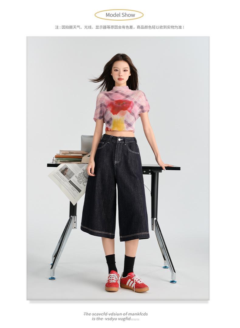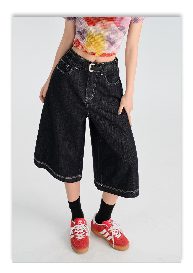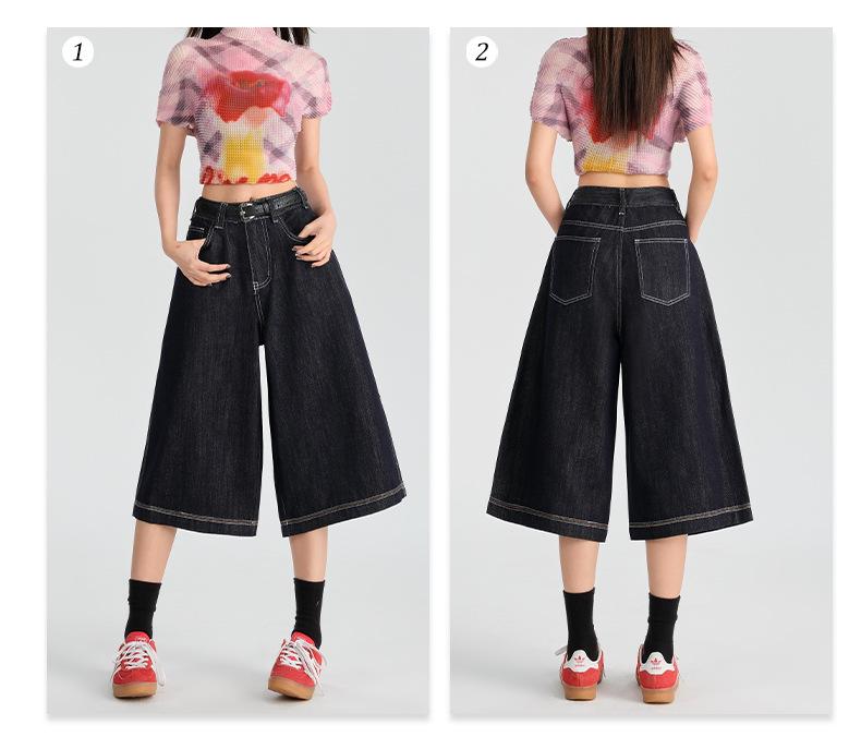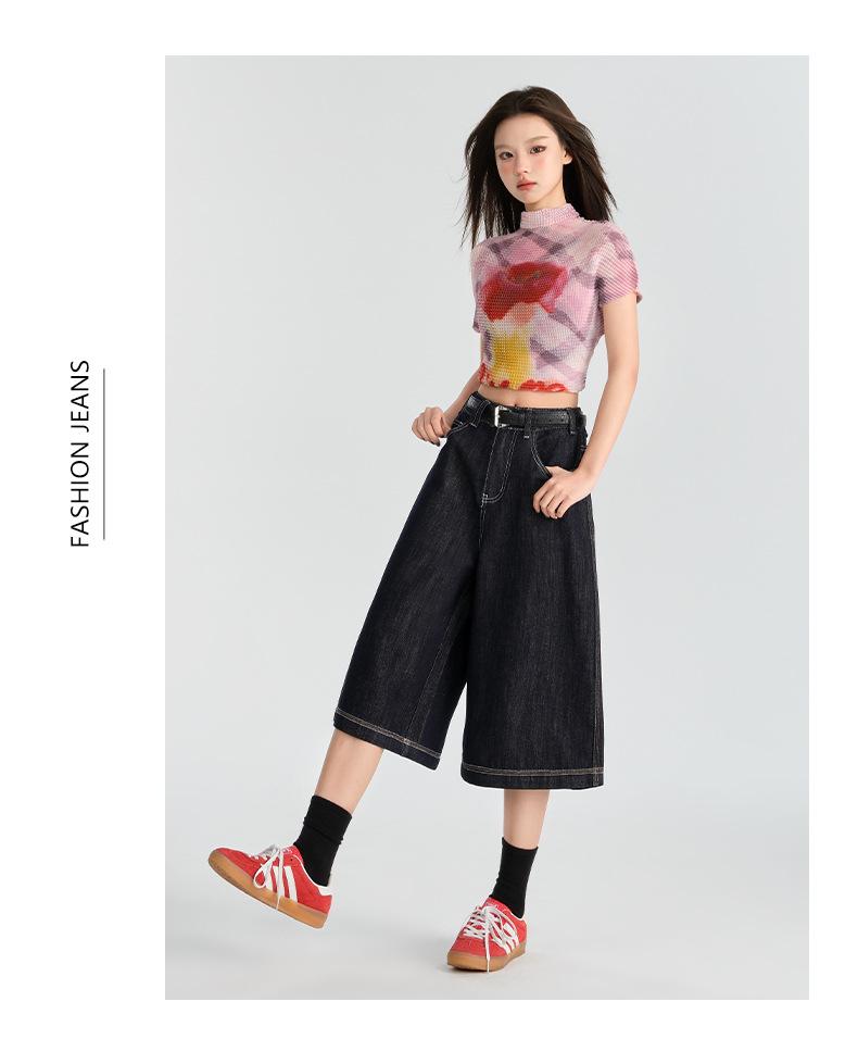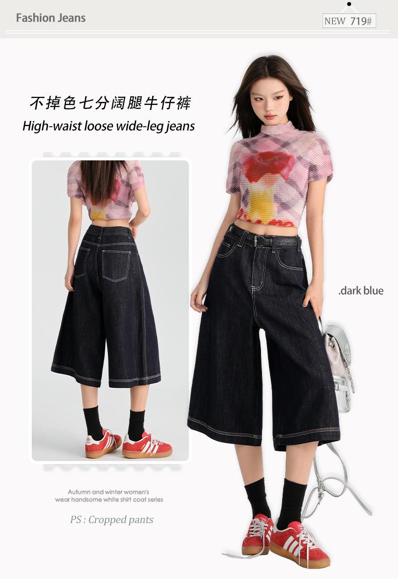 Jeans capri de pierna ancha azul denim oscuro que no se decoloran para mujer 2025 Verano Nuevo Tiro Alto Sueltos Drapeados