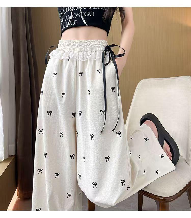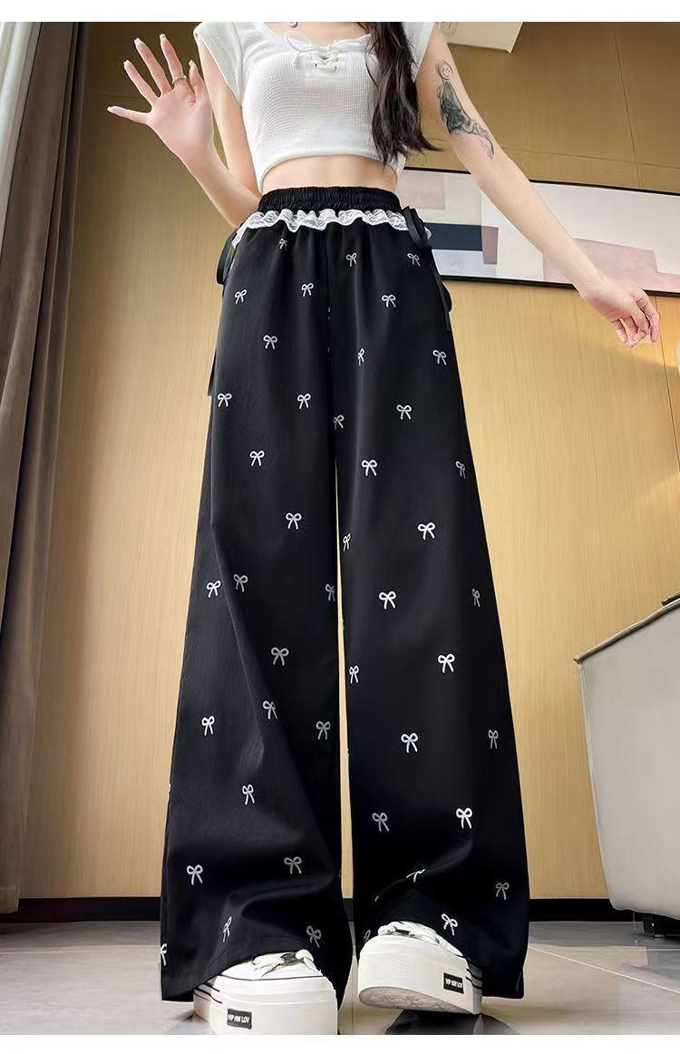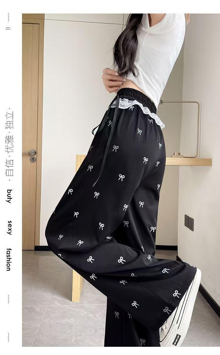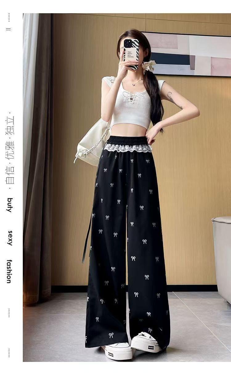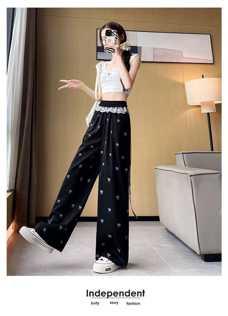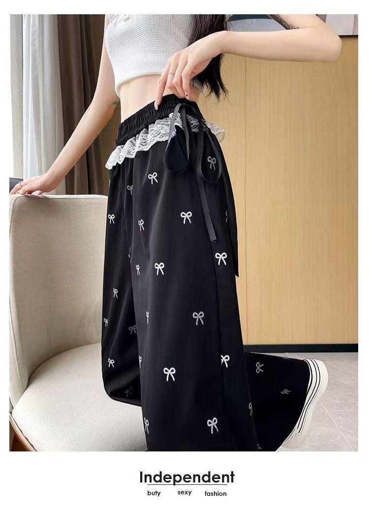 Pantalones Versátiles Adelgazantes de Cintura Alta con Estampado de Lazo para Mujer, Ribete de Encaje, Patchwork, Estilo Coreano, Verano, Anudados, Pierna Ancha, Tendencia