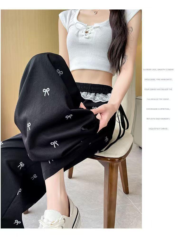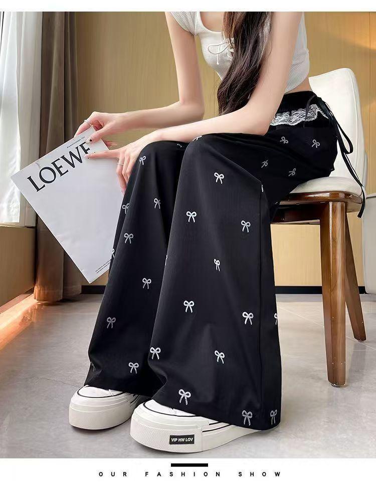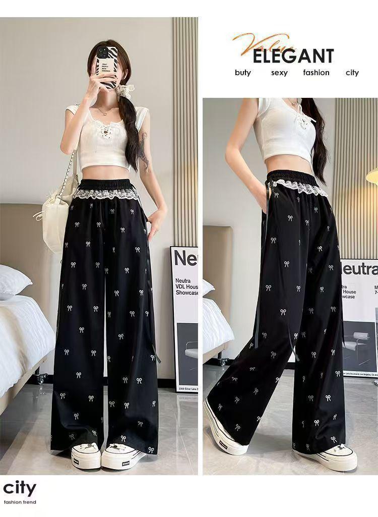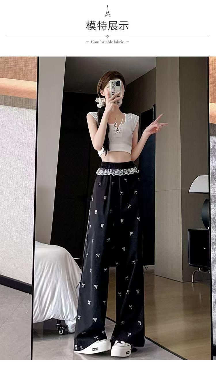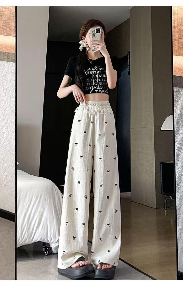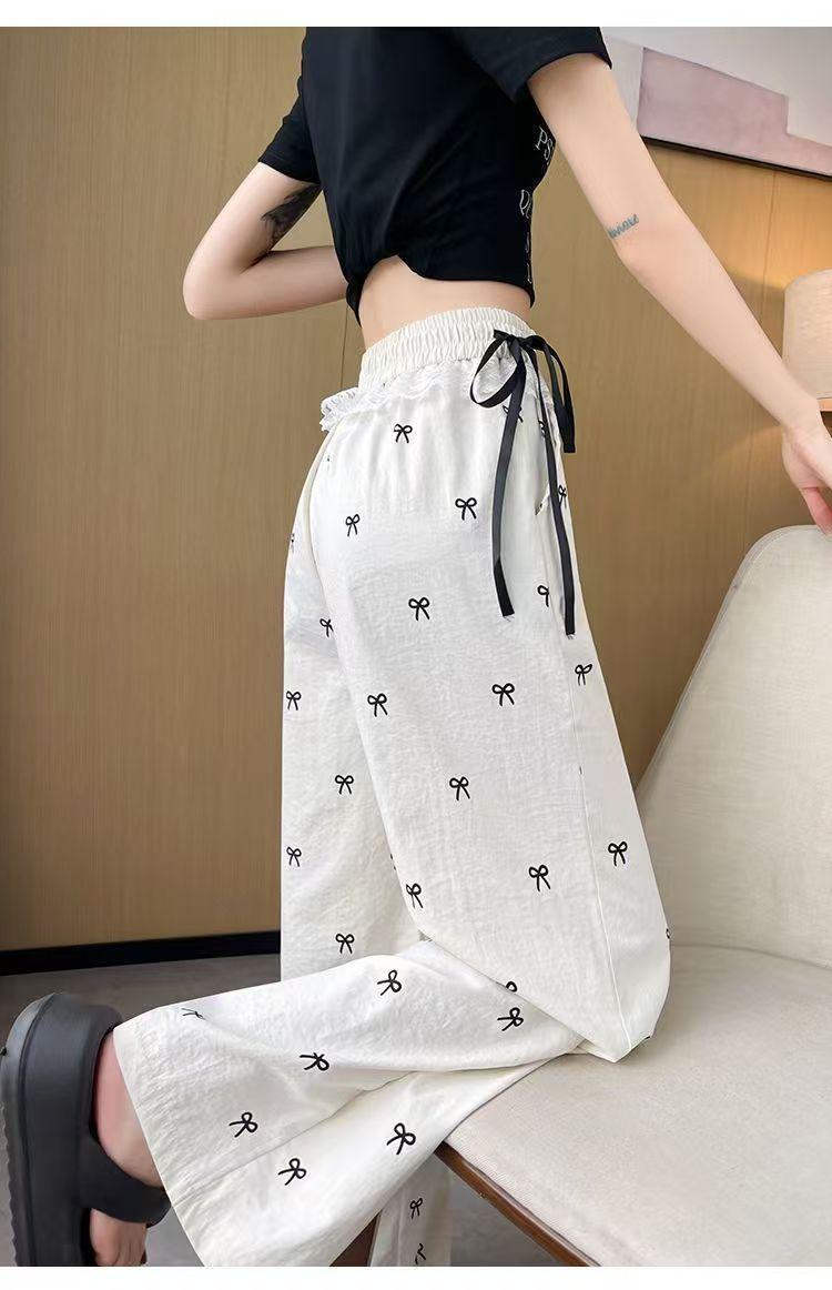 Pantalones Versátiles Adelgazantes de Cintura Alta con Estampado de Lazo para Mujer, Ribete de Encaje, Patchwork, Estilo Coreano, Verano, Anudados, Pierna Ancha, Tendencia
