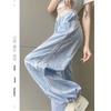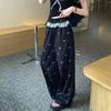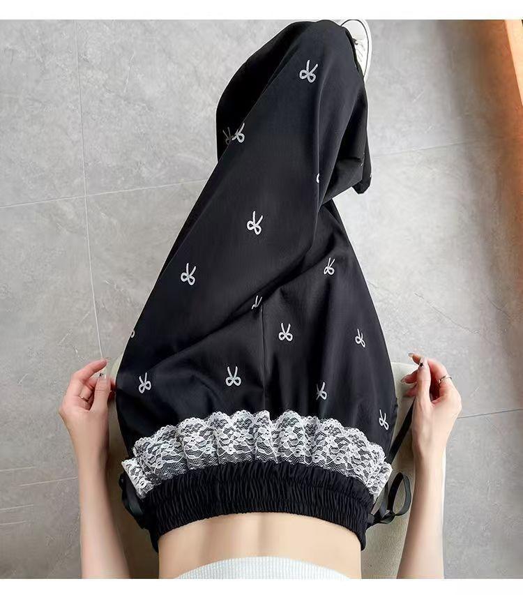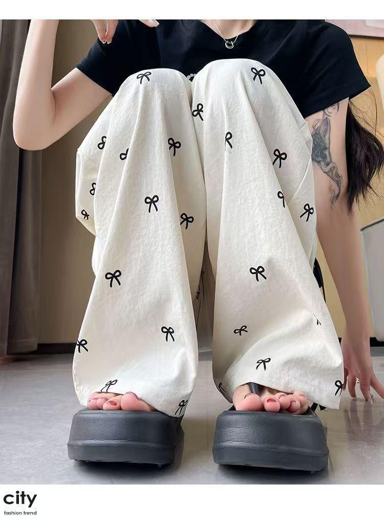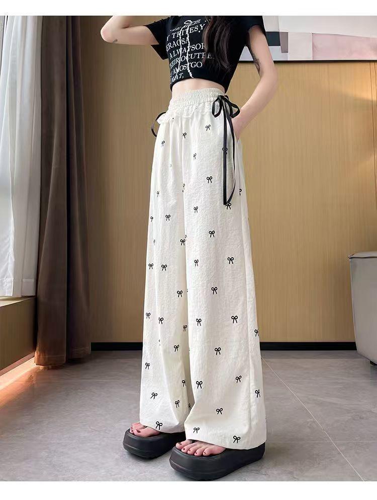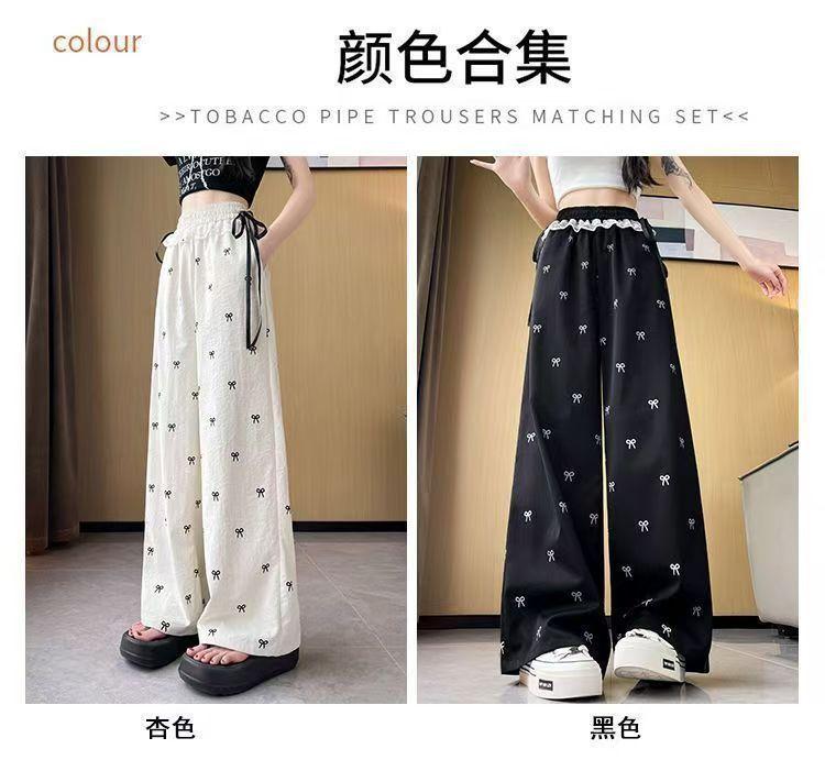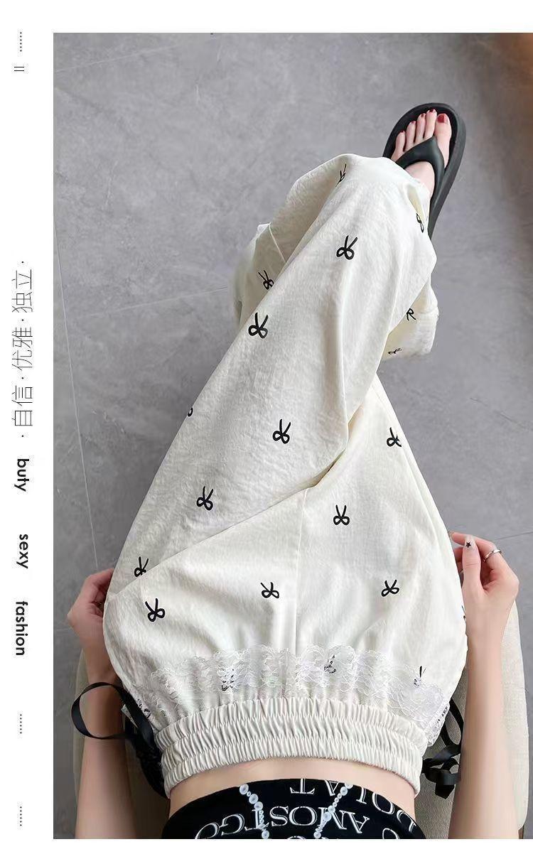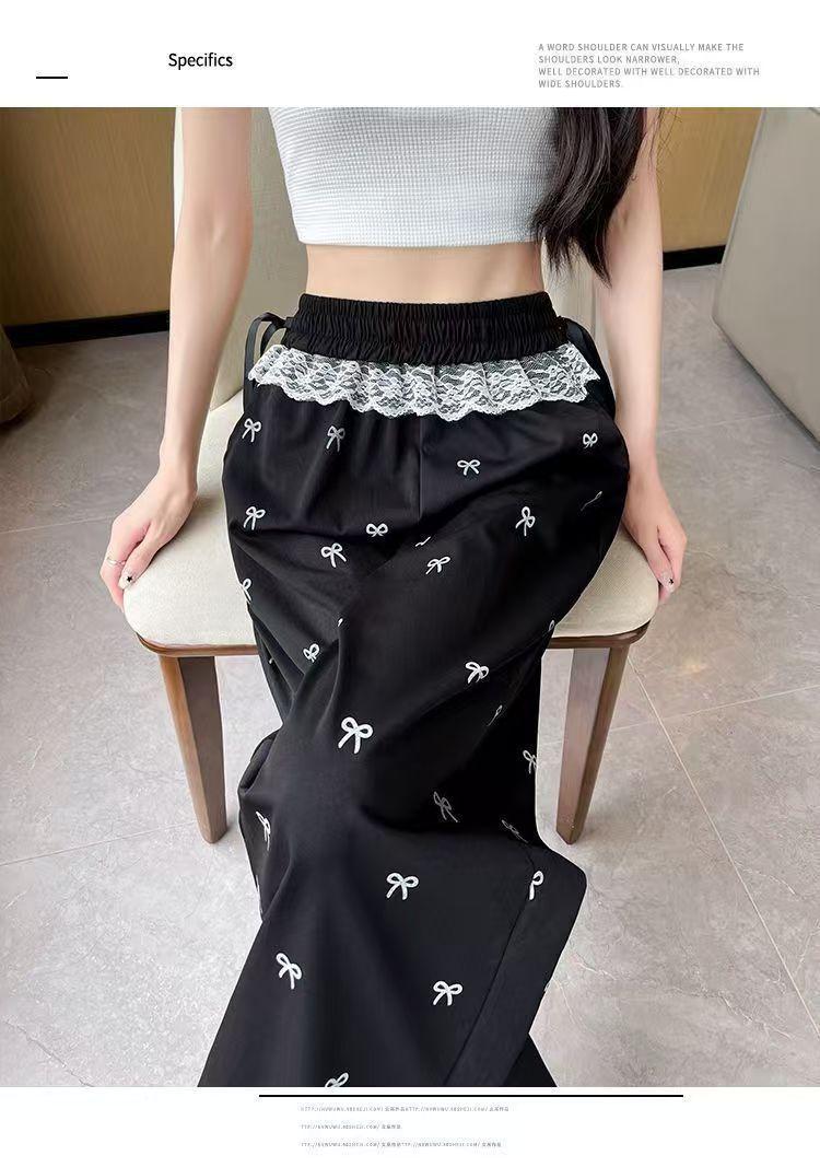 Pantalones Versátiles Adelgazantes de Cintura Alta con Estampado de Lazo para Mujer, Ribete de Encaje, Patchwork, Estilo Coreano, Verano, Anudados, Pierna Ancha, Tendencia