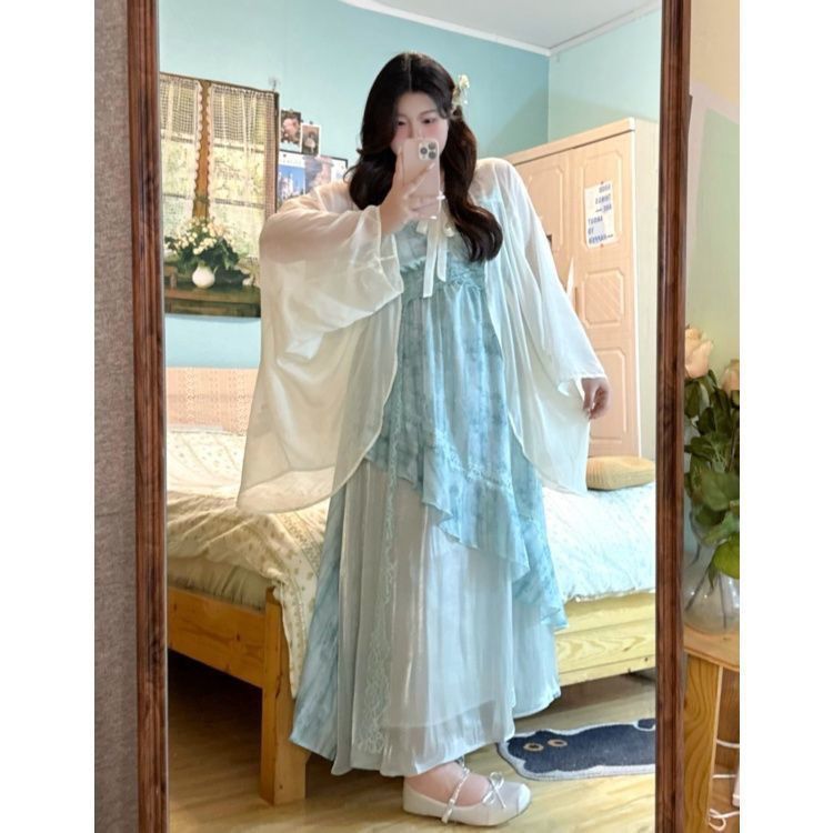 Vestido de Tirantes Espagueti con Estampado Irregular Sweet Vacation Nuevo Primavera Talla Grande Rellenita MM Adelgazante Set de Cárdigan para Mujer