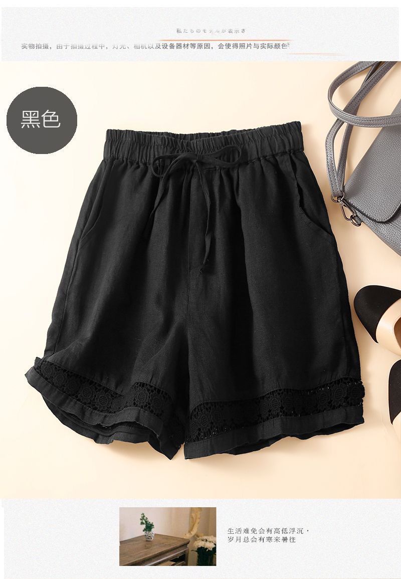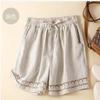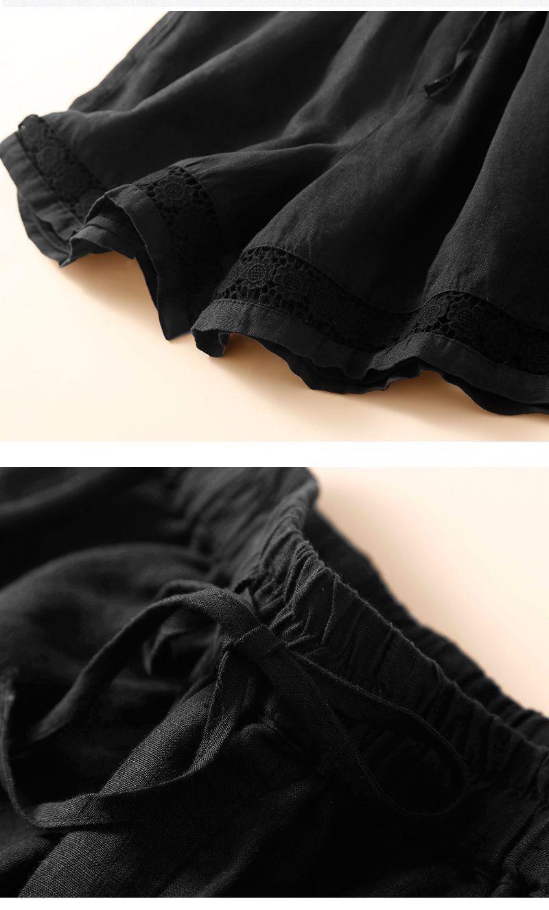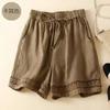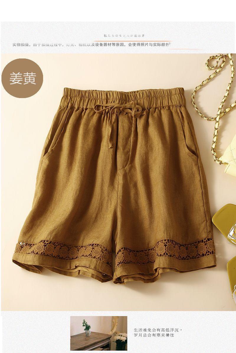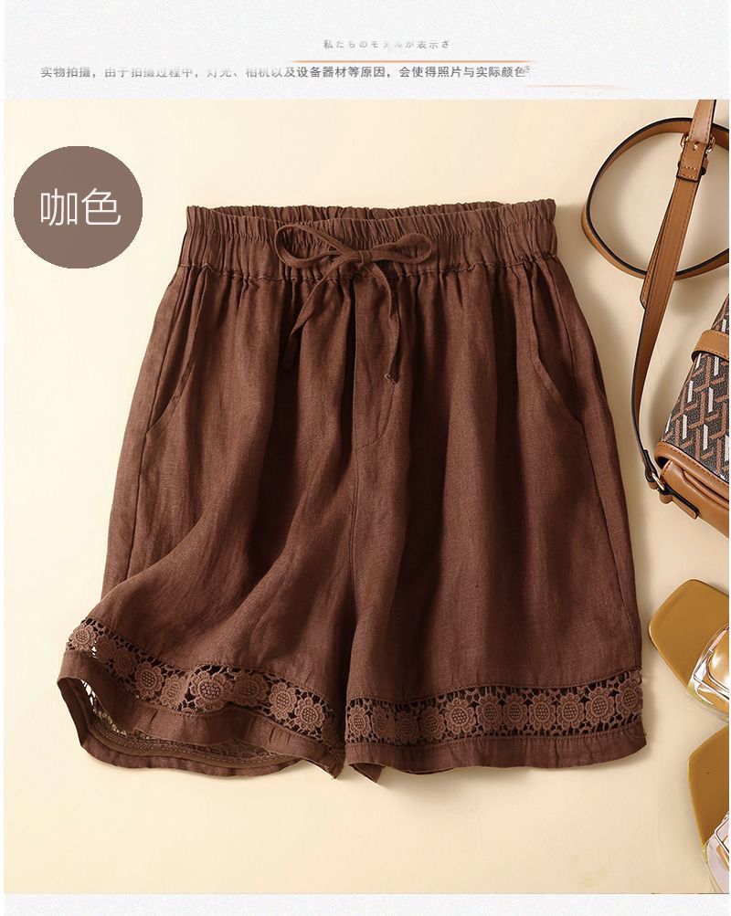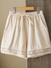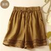 Shorts de Verano de Algodón y Lino para Mujer Retro Encaje Calado Cintura Alta Sueltos Pierna Ancha Cintura Elástica con Lazo Tendencia Casual