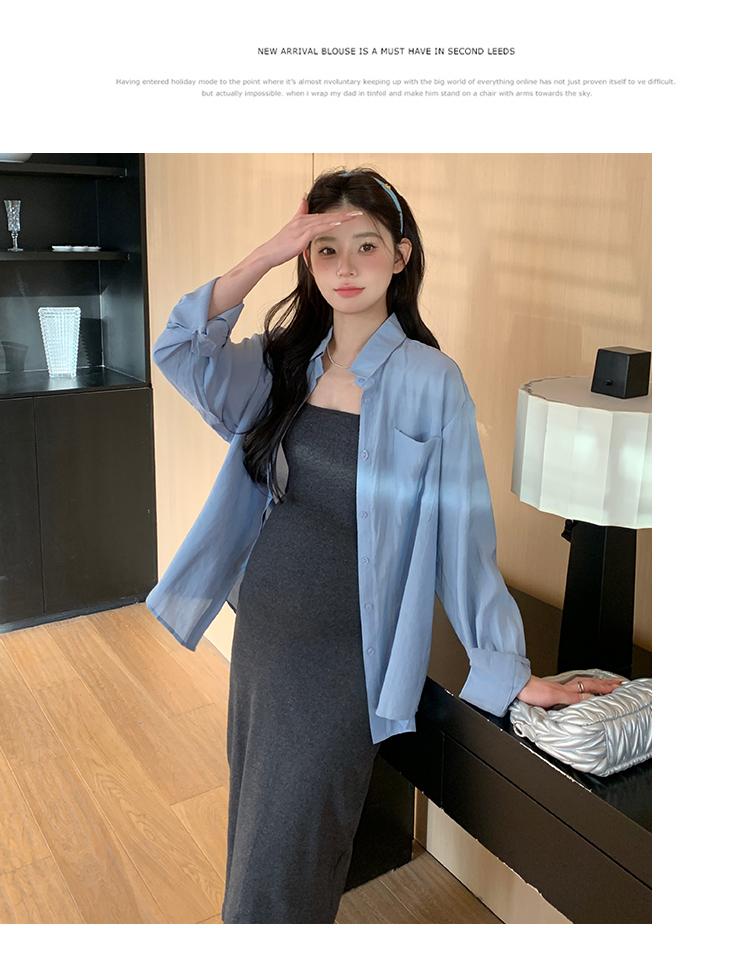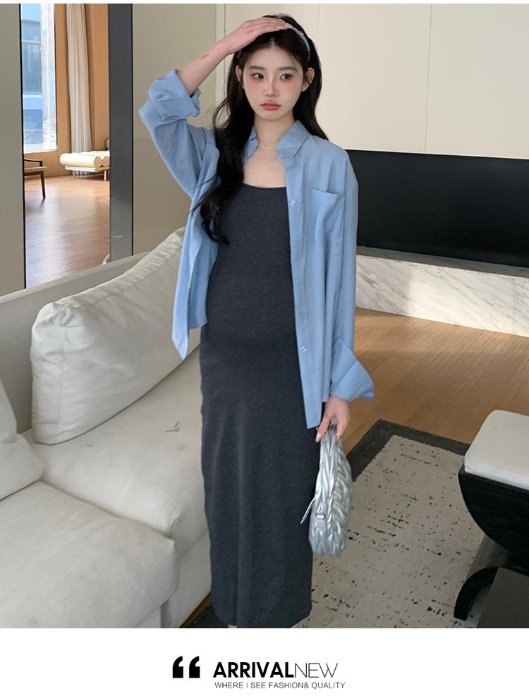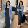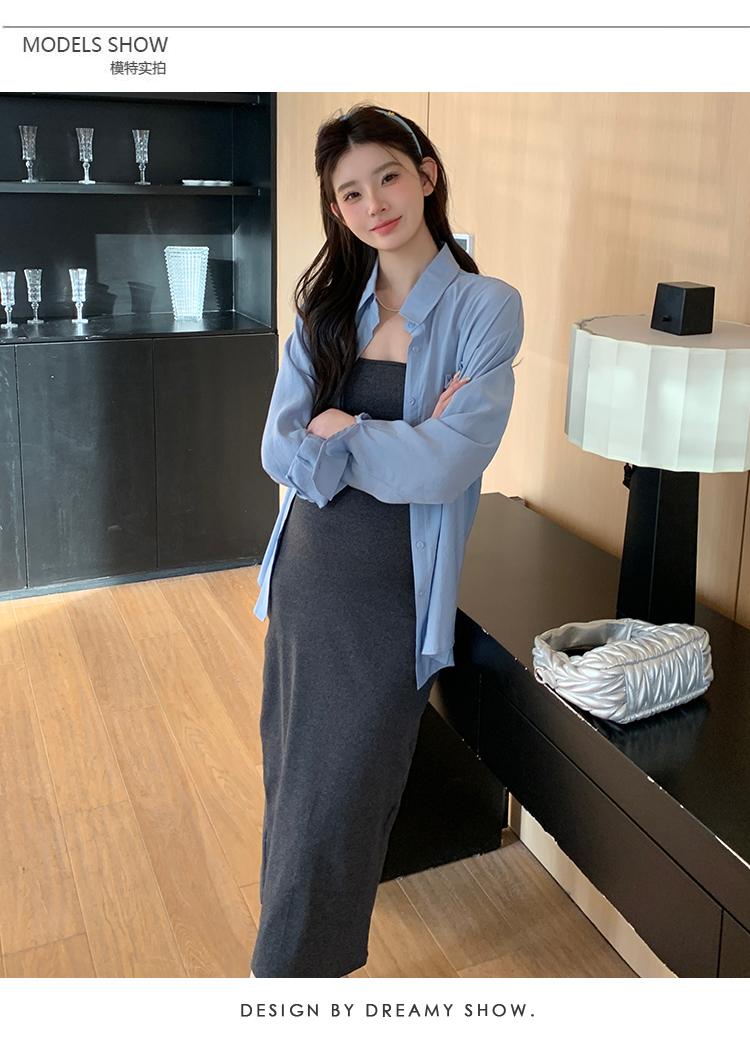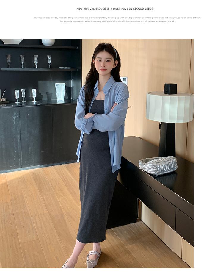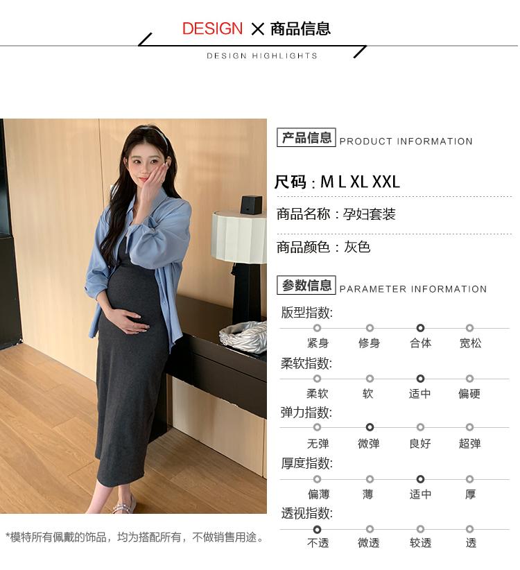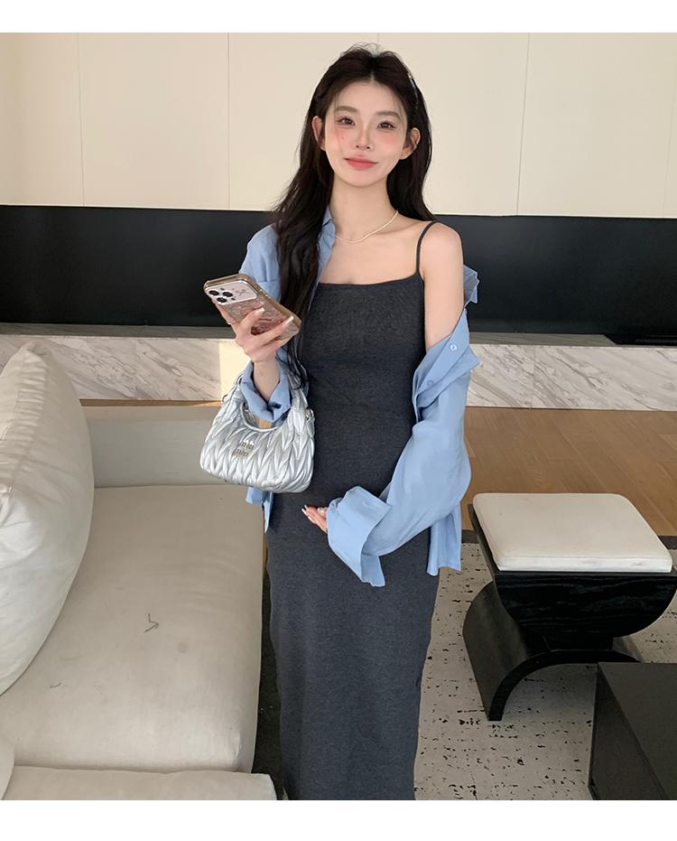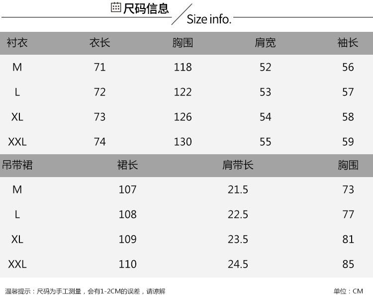 Blue shirt [single piece], Gray suspender skirt [single piece], Blue shirt + gray suspender skirt [suit]