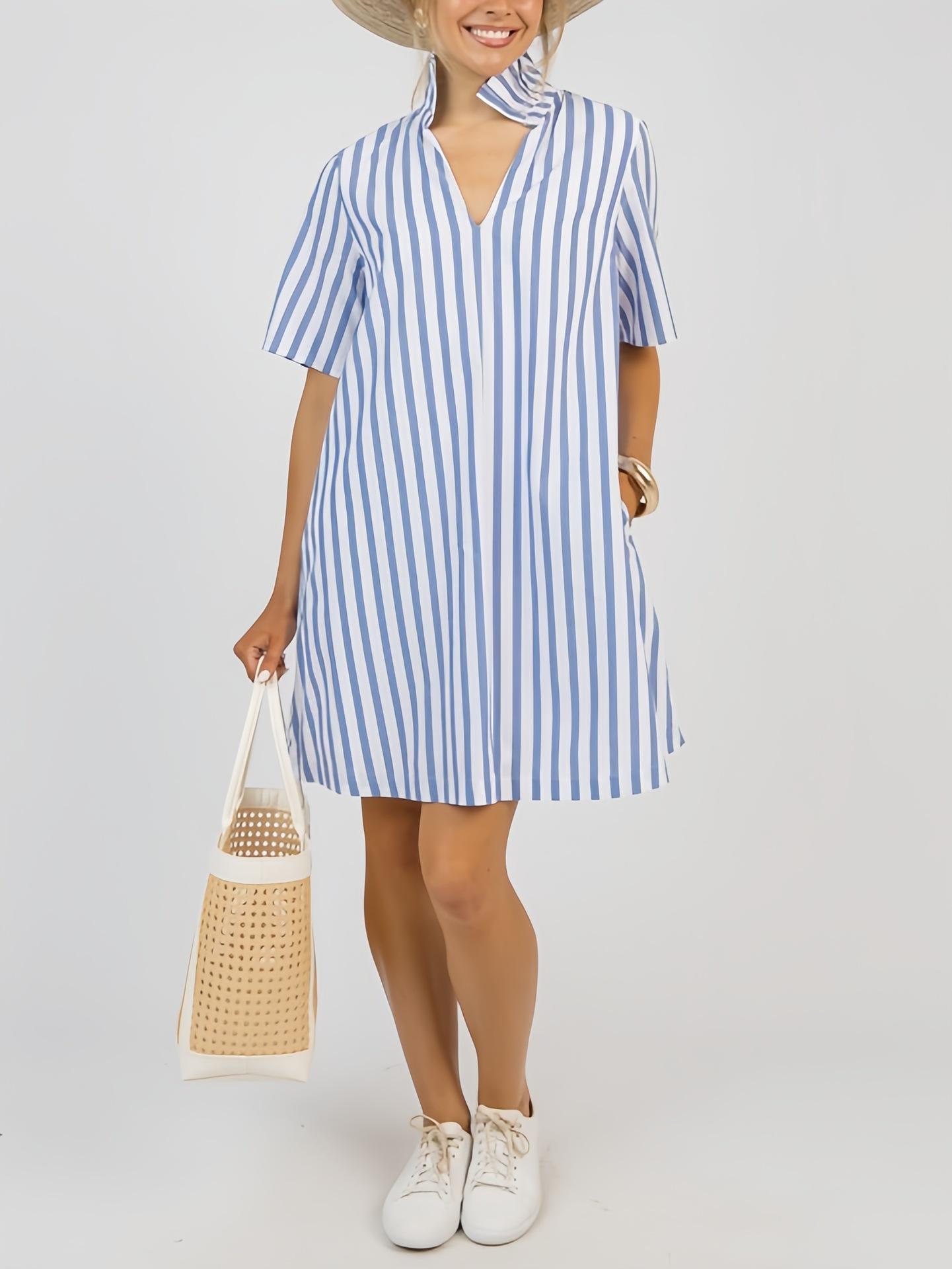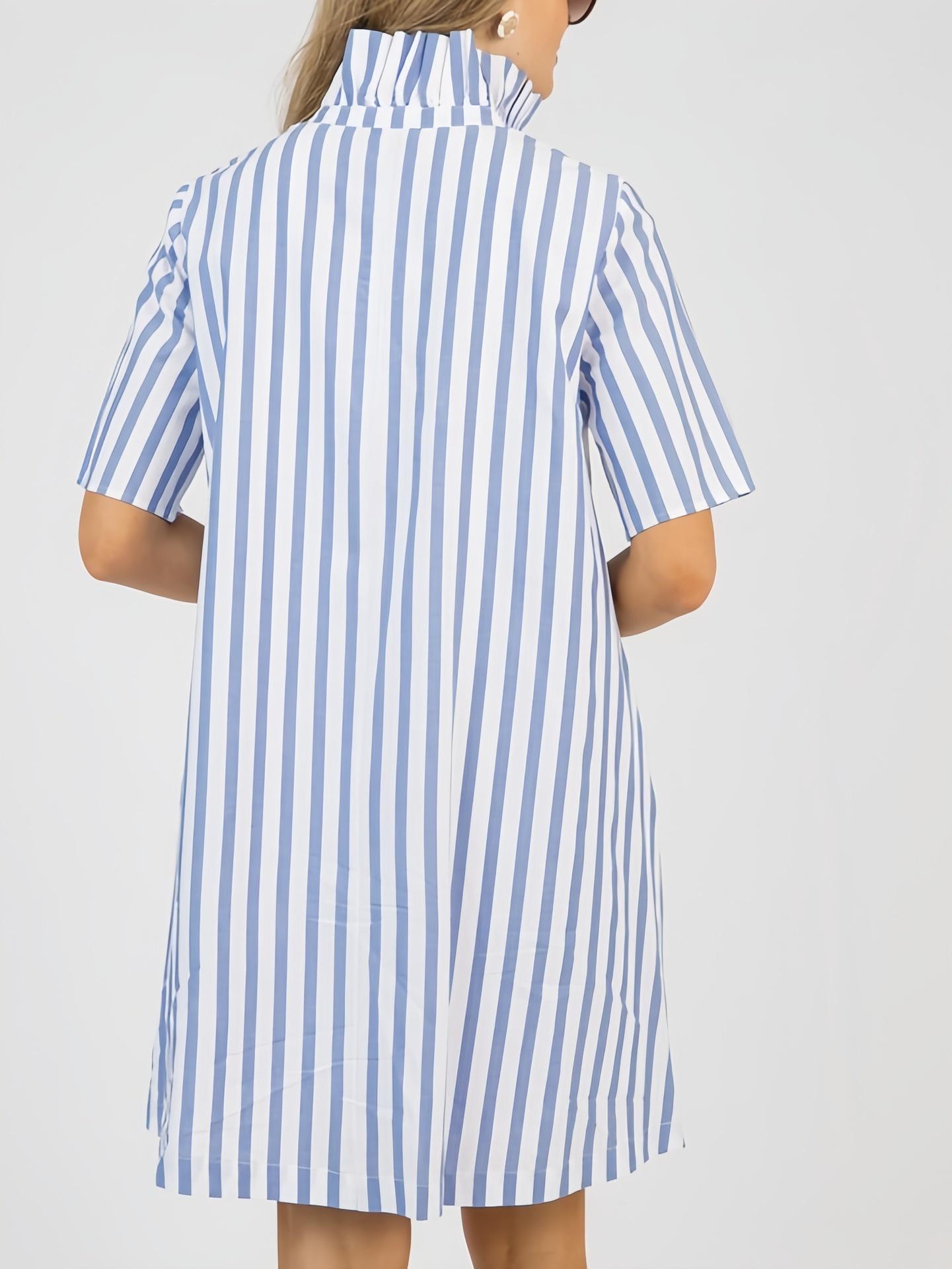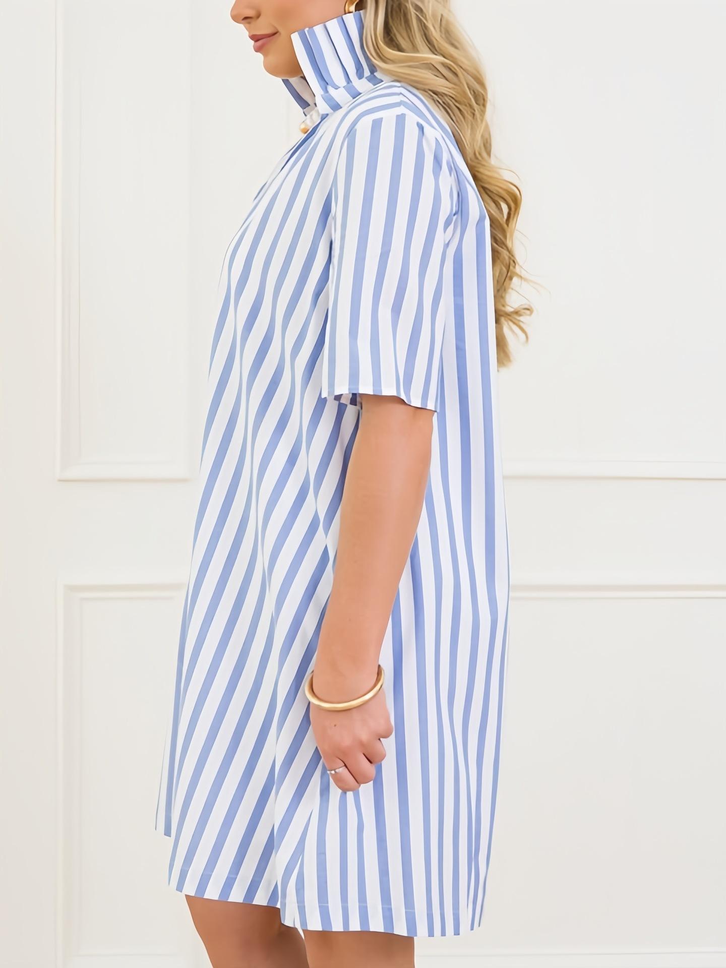 Nuevo Vestido Camisero Rayado de Cuello Medio Alto para Mujer, Estilo de Verano de Alta Gama 2025 Europeo y Americano Transfronterizo A-Line Elegante Vestido Corto