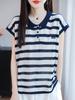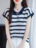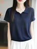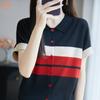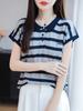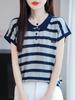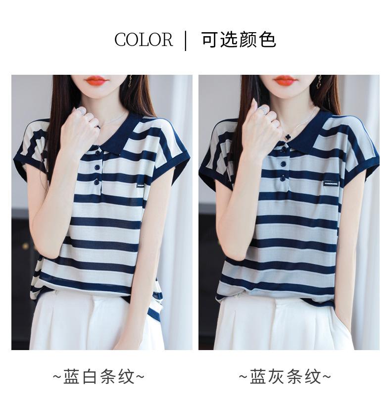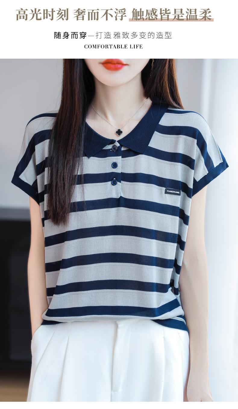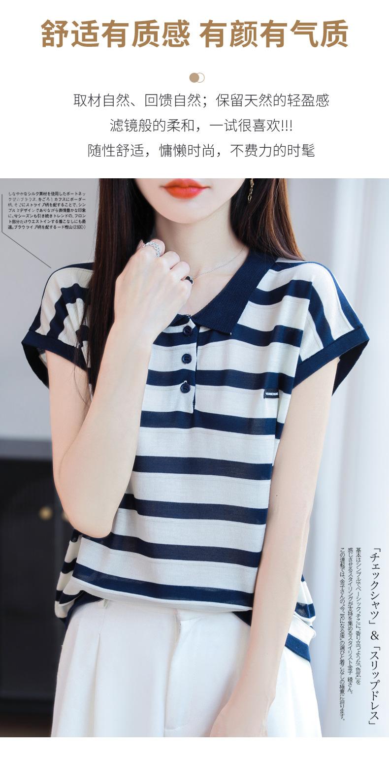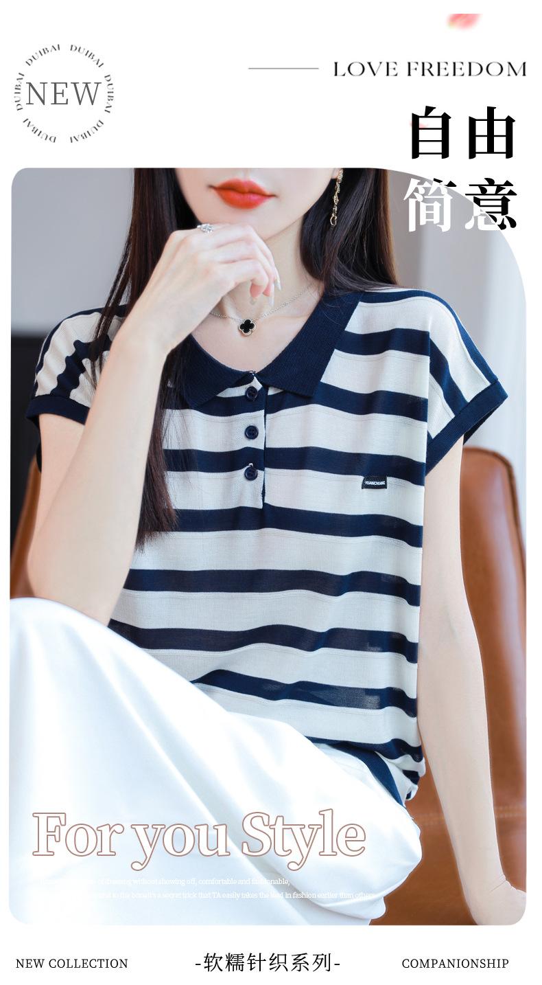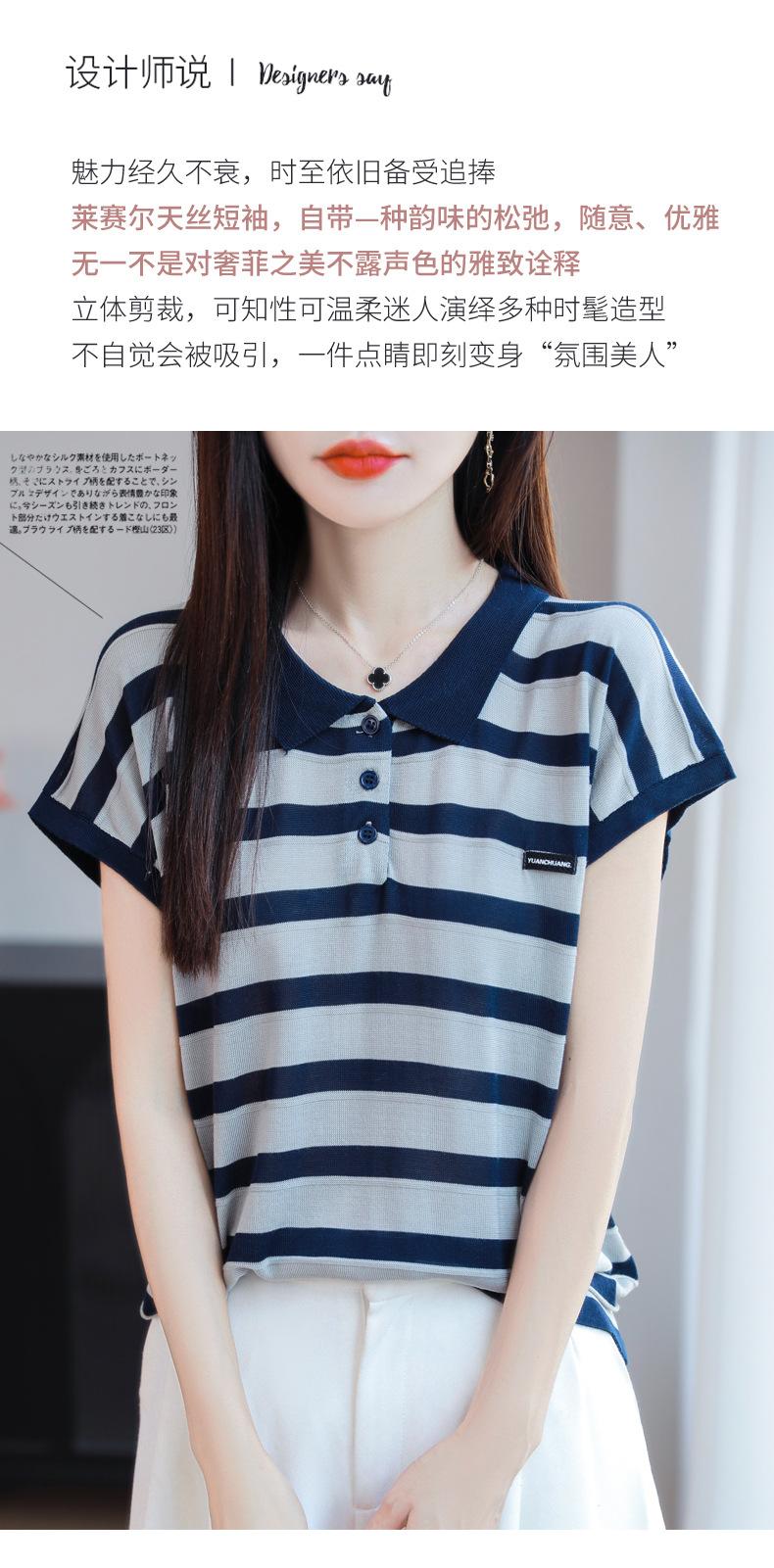 Playera de Manga Corta a Rayas con Cuello Polo para Mujer Verano Nueva Lyocell Tencel para Fondo Talla Grande para Mujer Top de Punto de Seda Helada