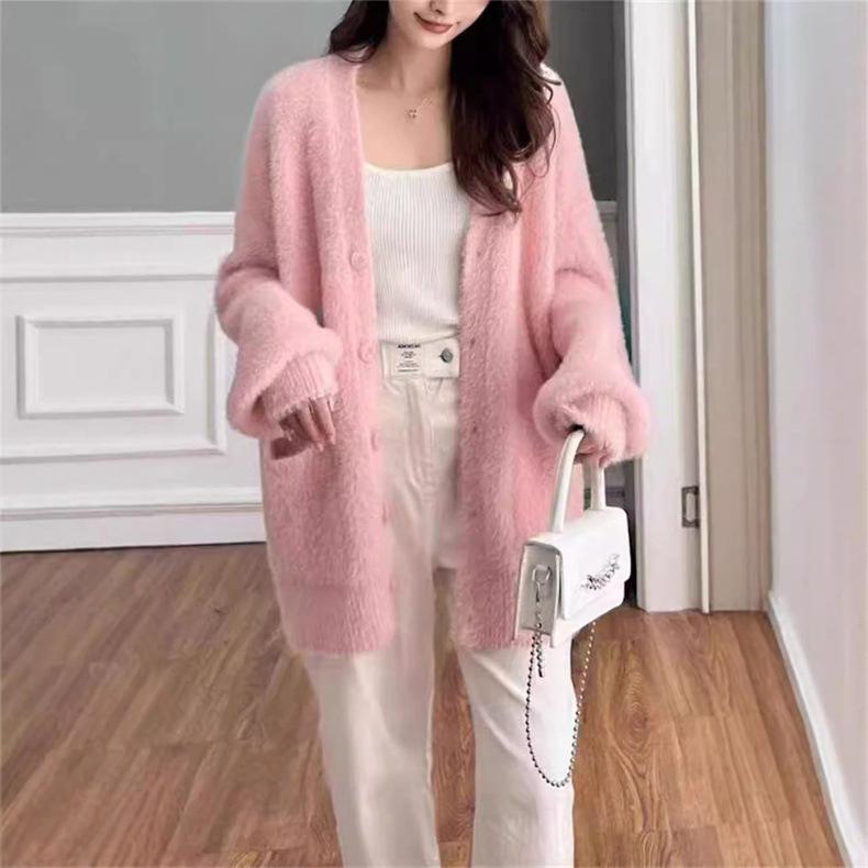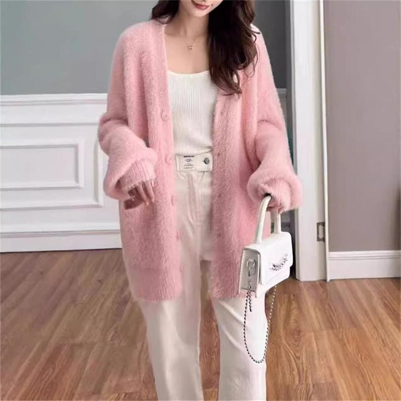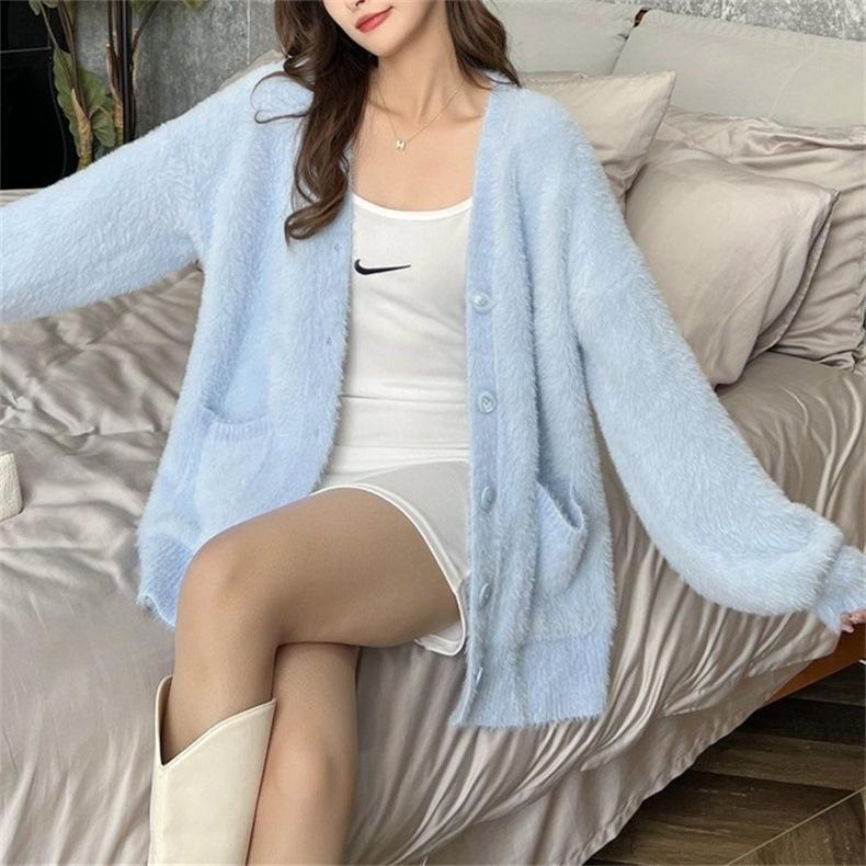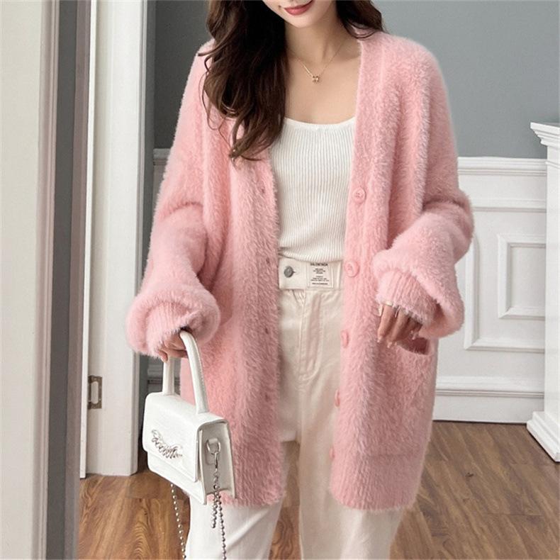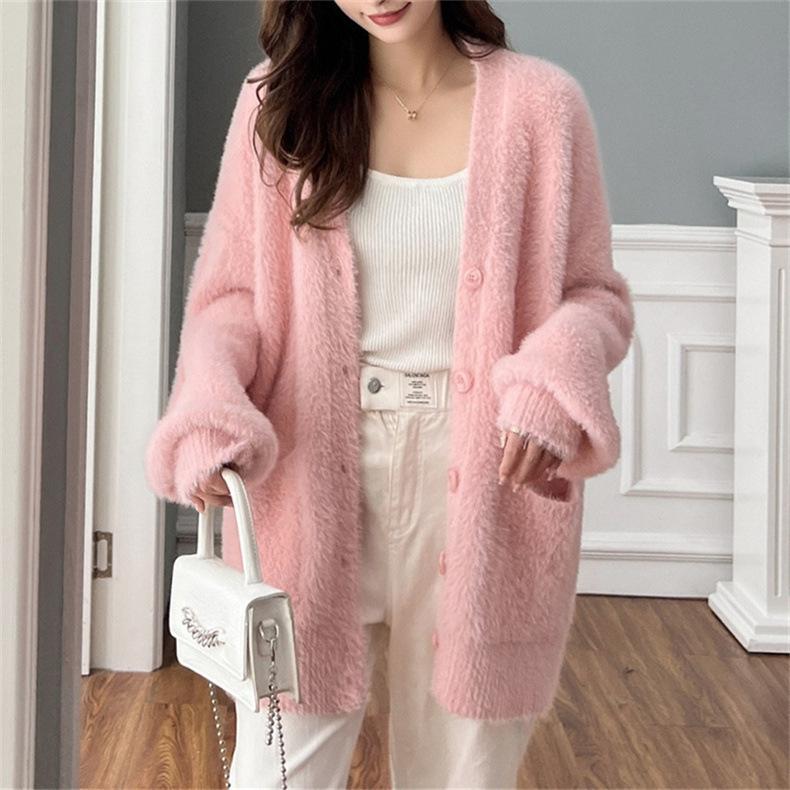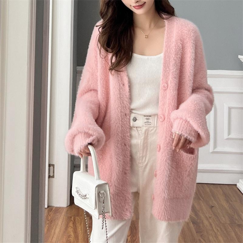Cárdigan de Terciopelo de Visón para Mujer Primavera y Otoño Estilo Coreano Nuevo Estilo Lazy Suéter Suave Ceroso Engrosado Chaqueta Tejida Holgada de Largo Medio
