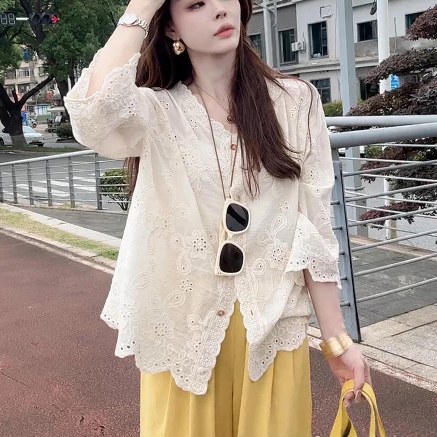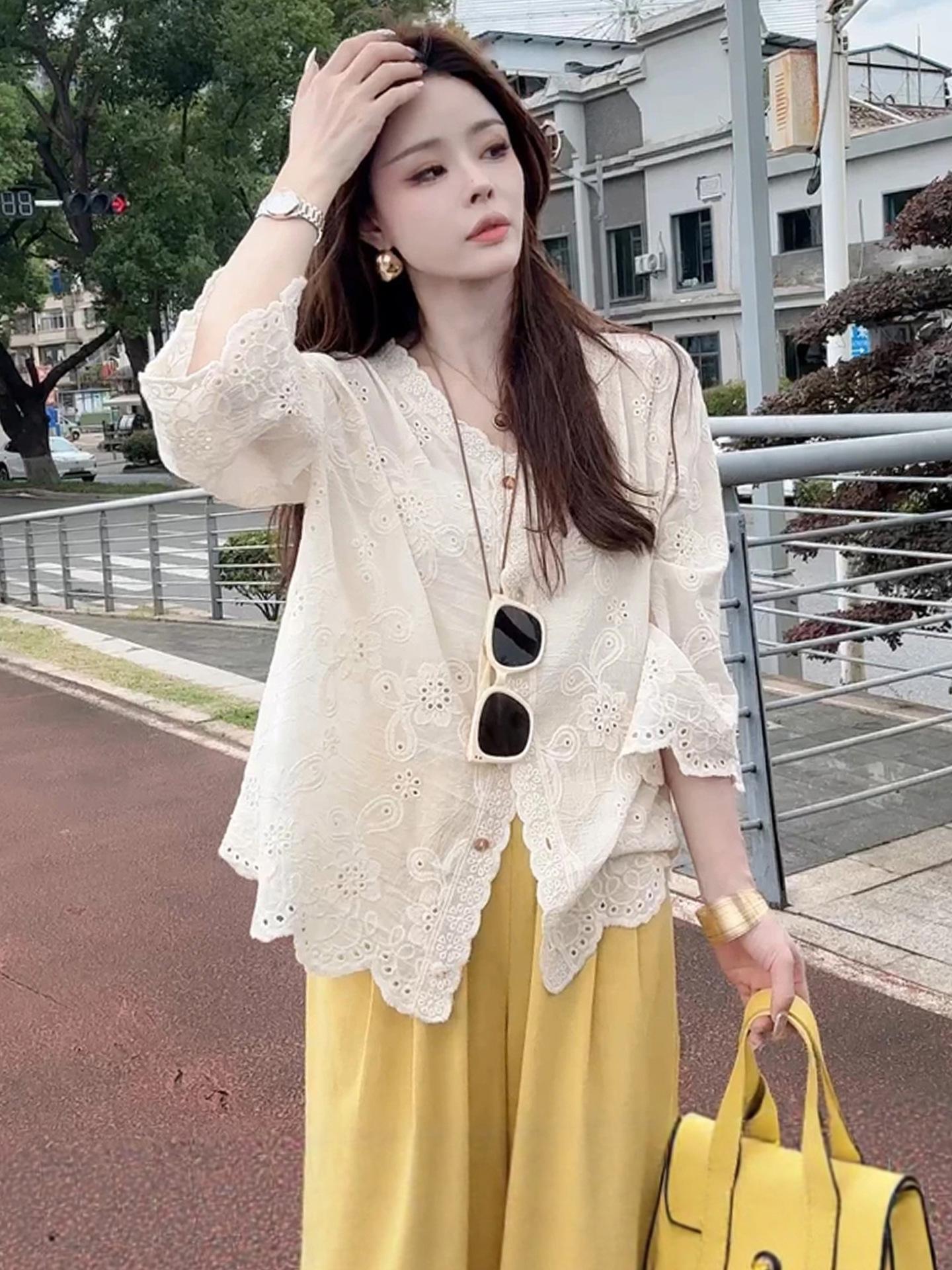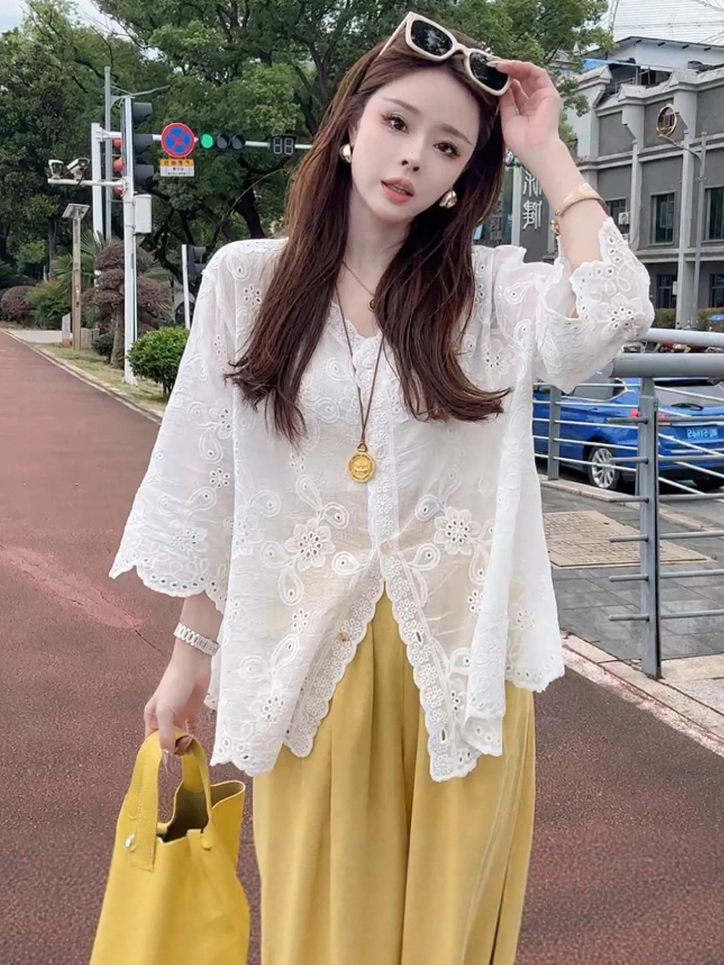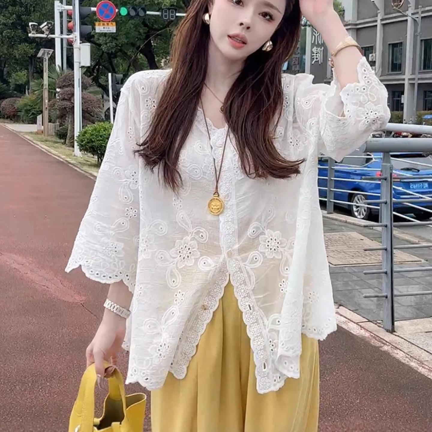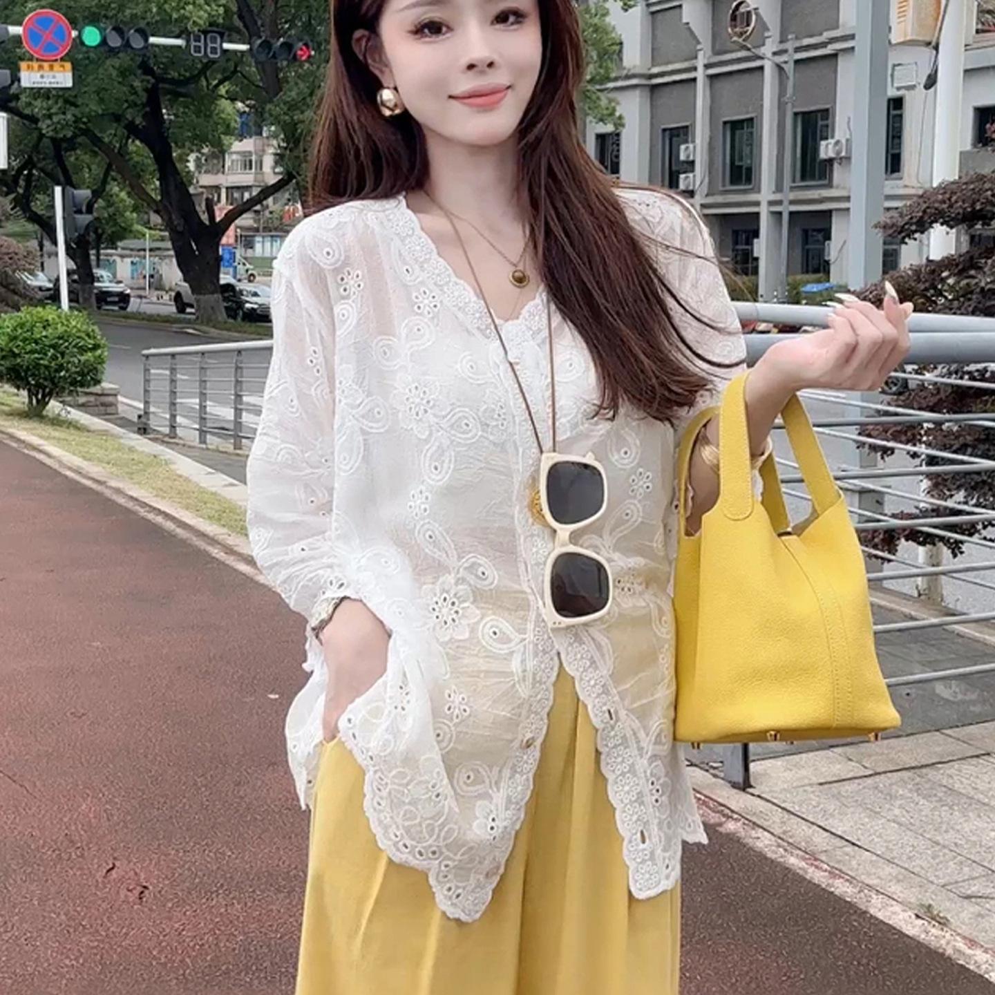 Chaqueta Camisa Fina de Protección Solar con Cuello en V Francés para Mujer 2025 Nuevo Verano Encaje de Alta Gama Ganchillo Recorte Top
