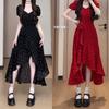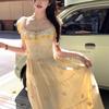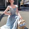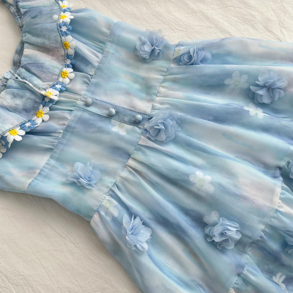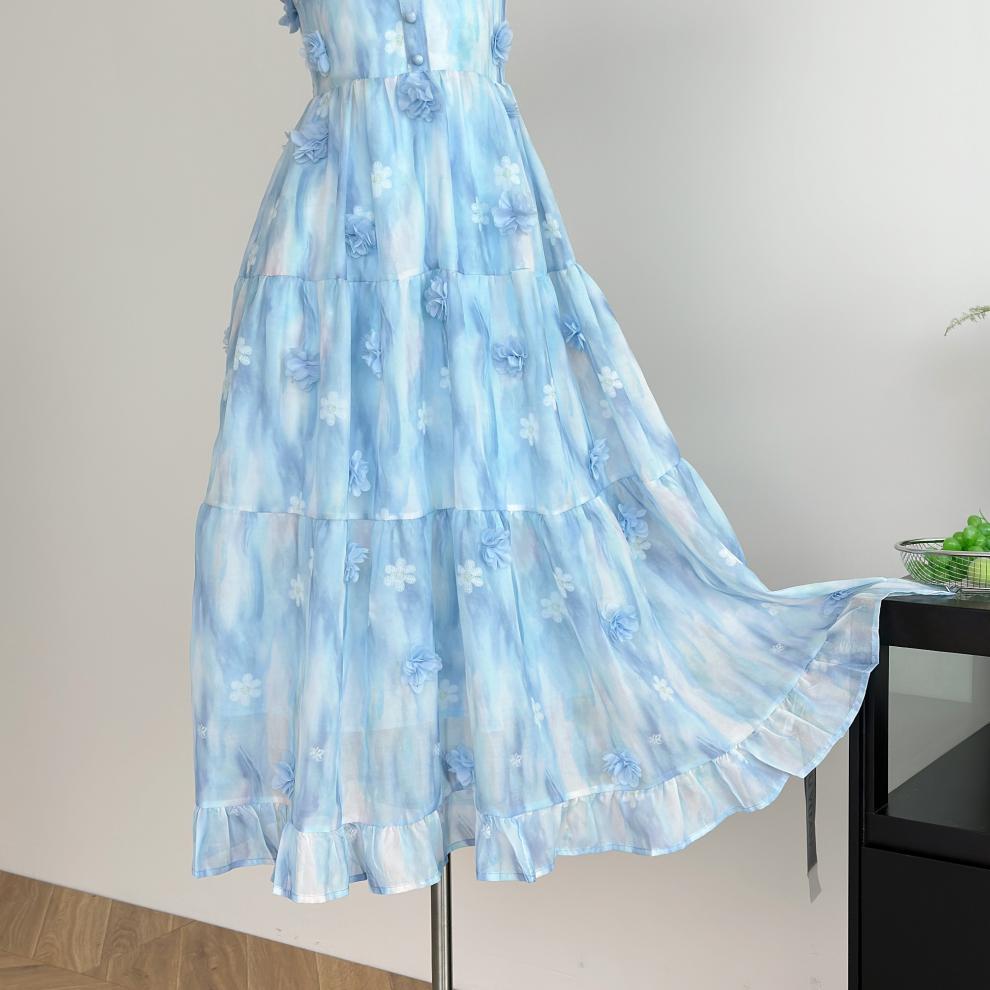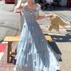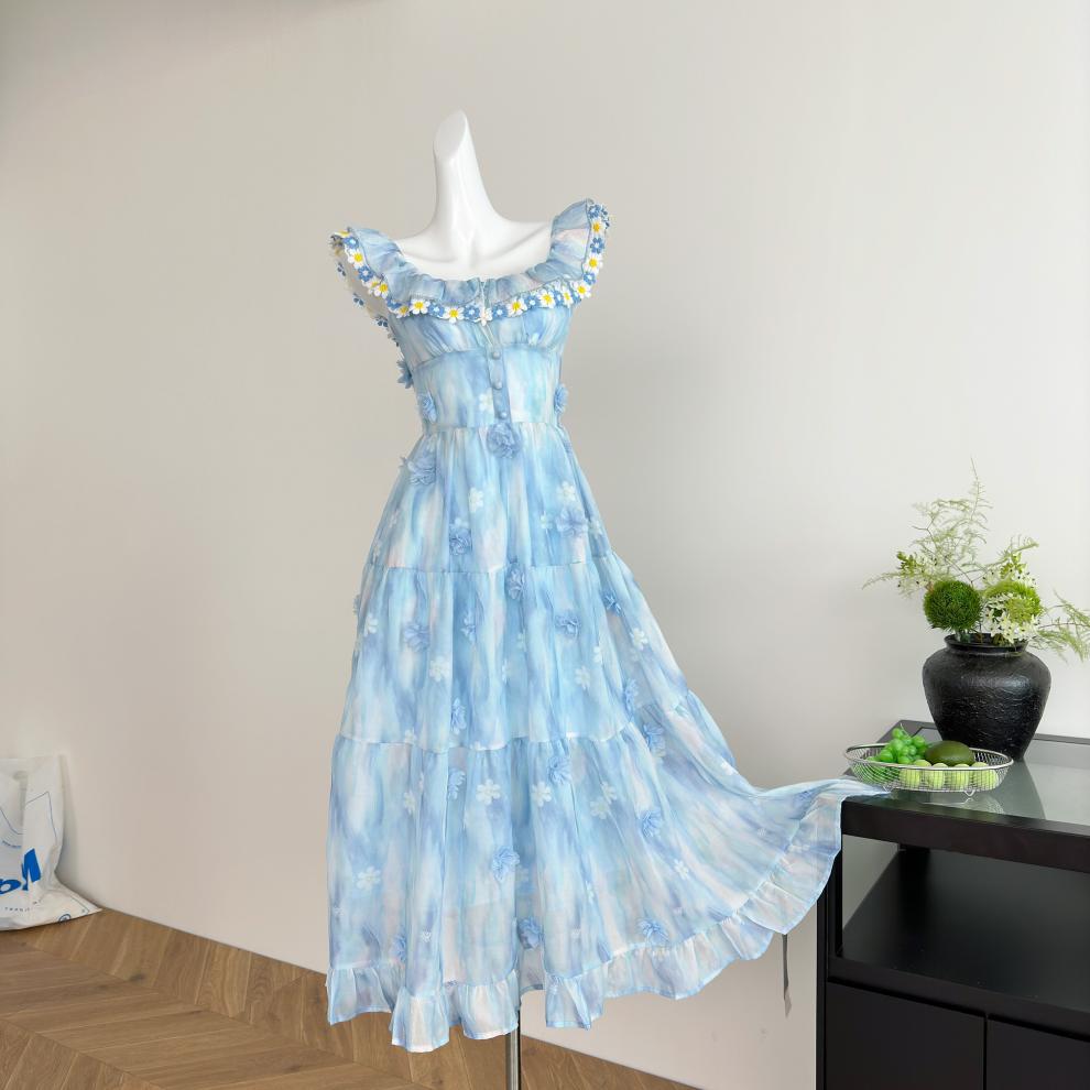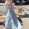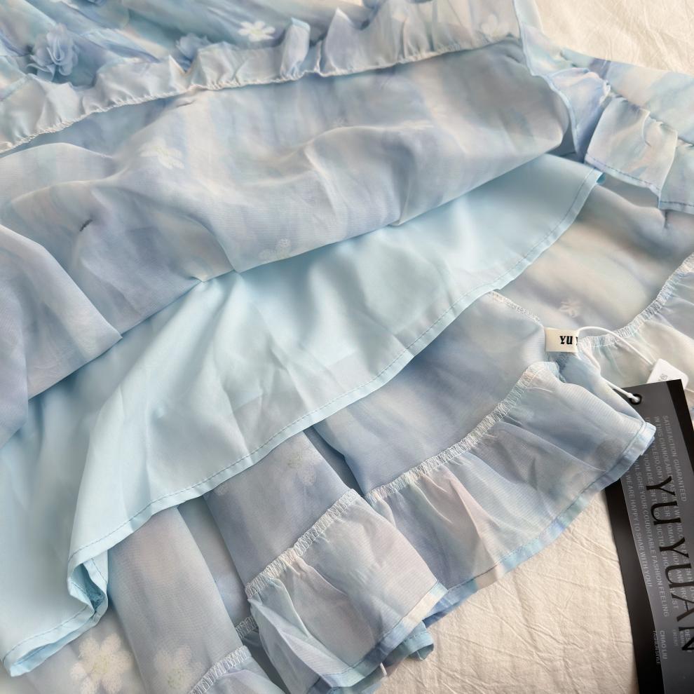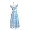 Vestido Azul Largo de Chifón Estampado con Manga Mariposa para Primavera para Mujer Dulce Francés Adelgazante