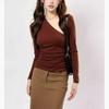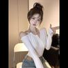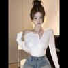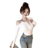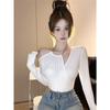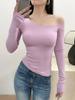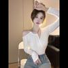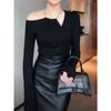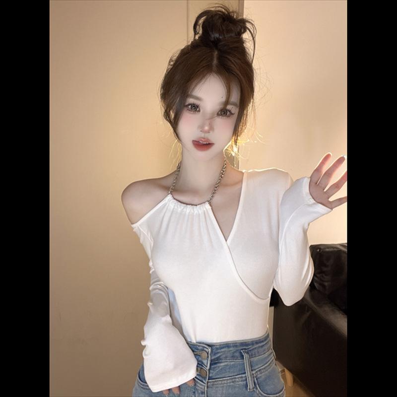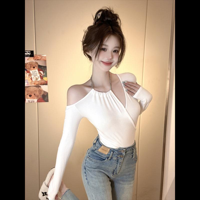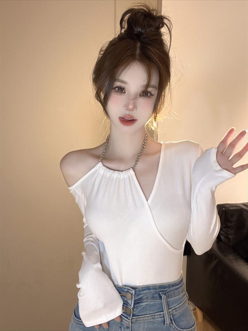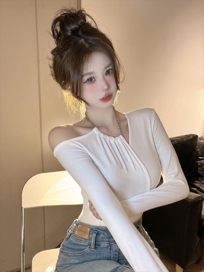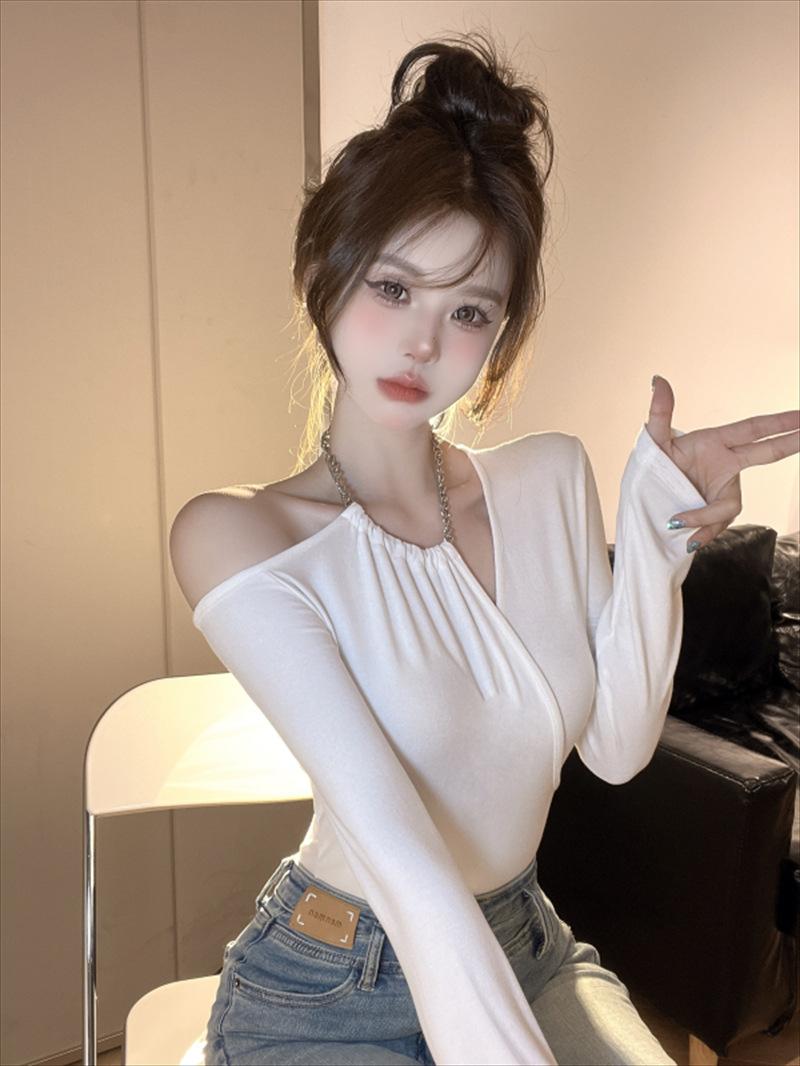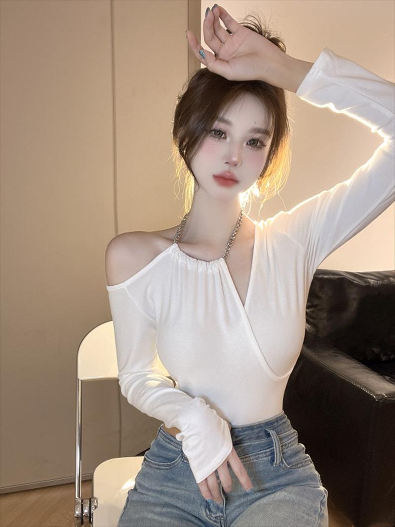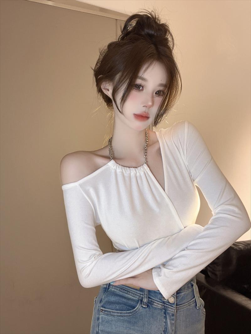 Deseo Puro Chica Caliente Hombro Clavícula Cadena Cuello Camiseta Irregular Elegante Combinable Ajustado Adelgazante Manga Larga Top