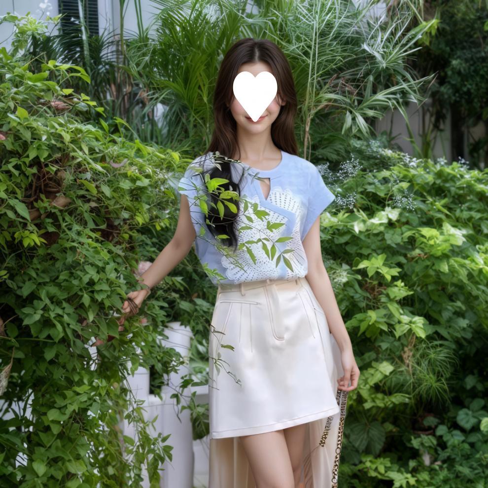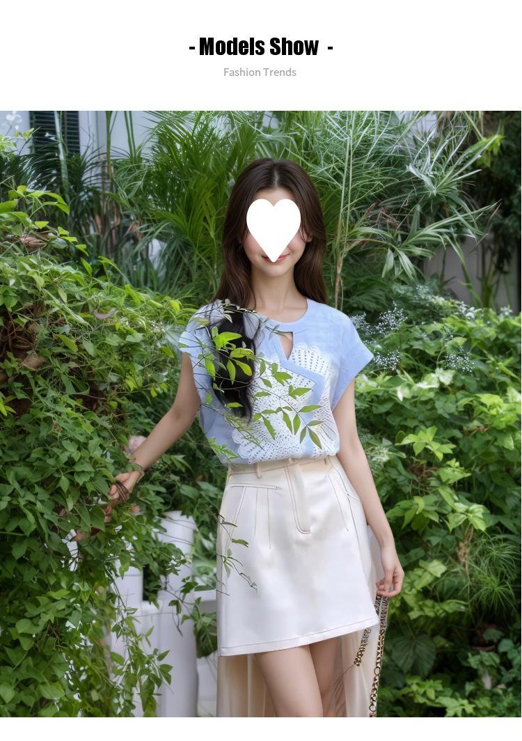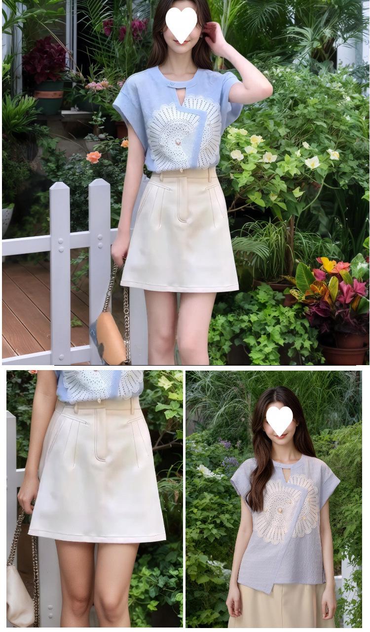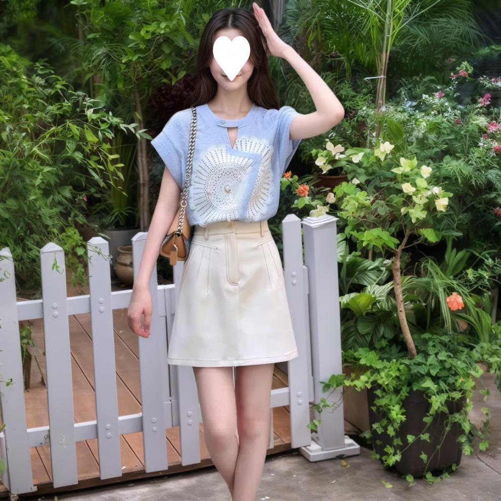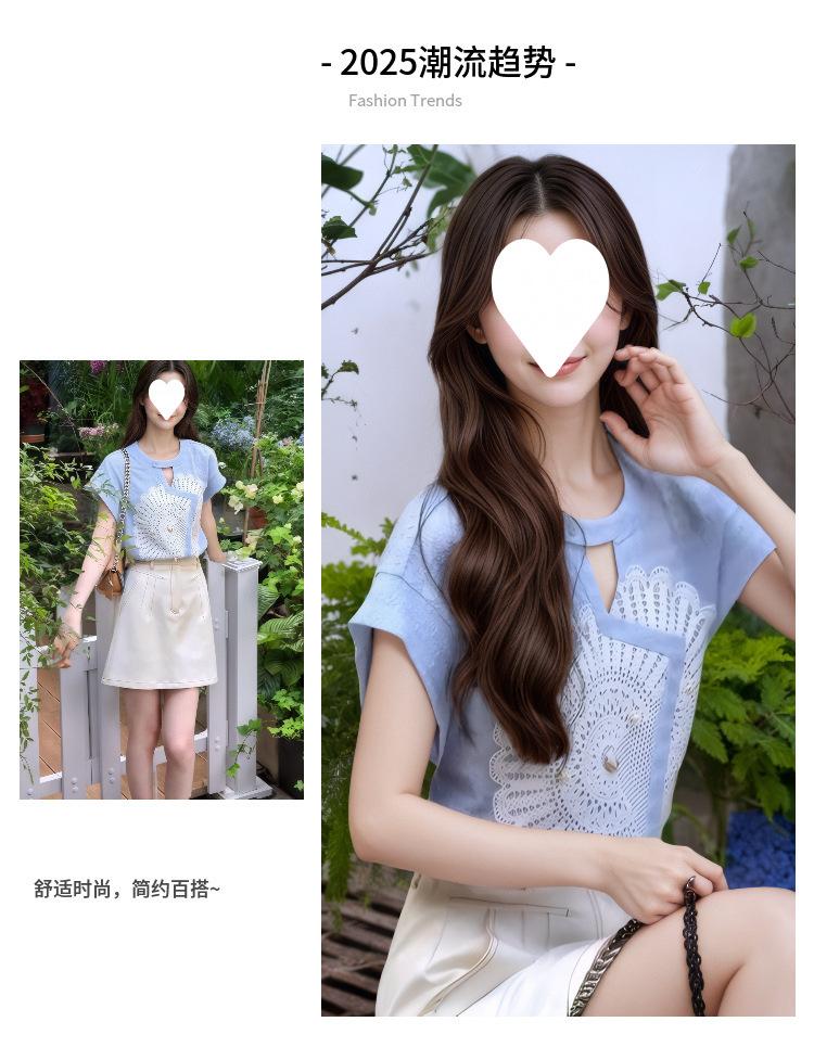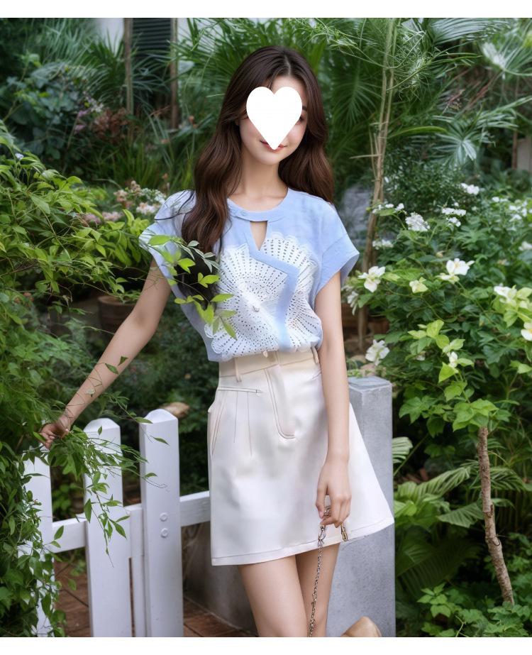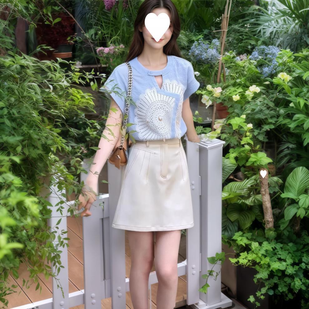 Verano 2025 Nuevo Conjunto de Dos Piezas para Mujer Azul Fresco Calado Anti-Brillo Manga al Hombro Top Falda de Mezclilla