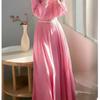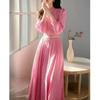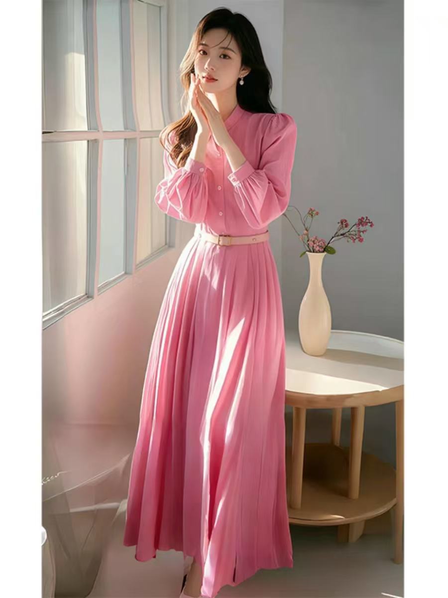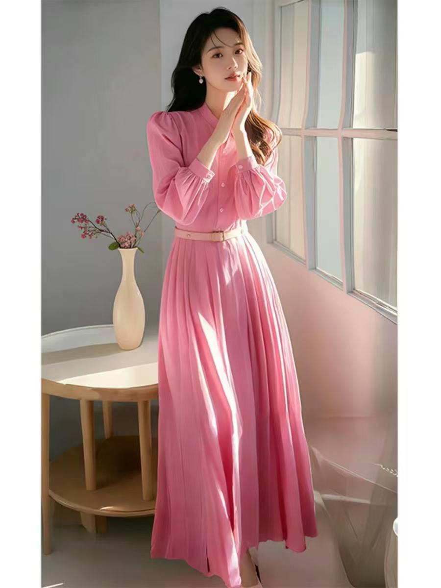 Vestido camisero rosa de manga larga Primavera Mujer Estilo francés Suave y hermoso Elegante Estilo Vacacional junto al mar Cintura ajustada Falda