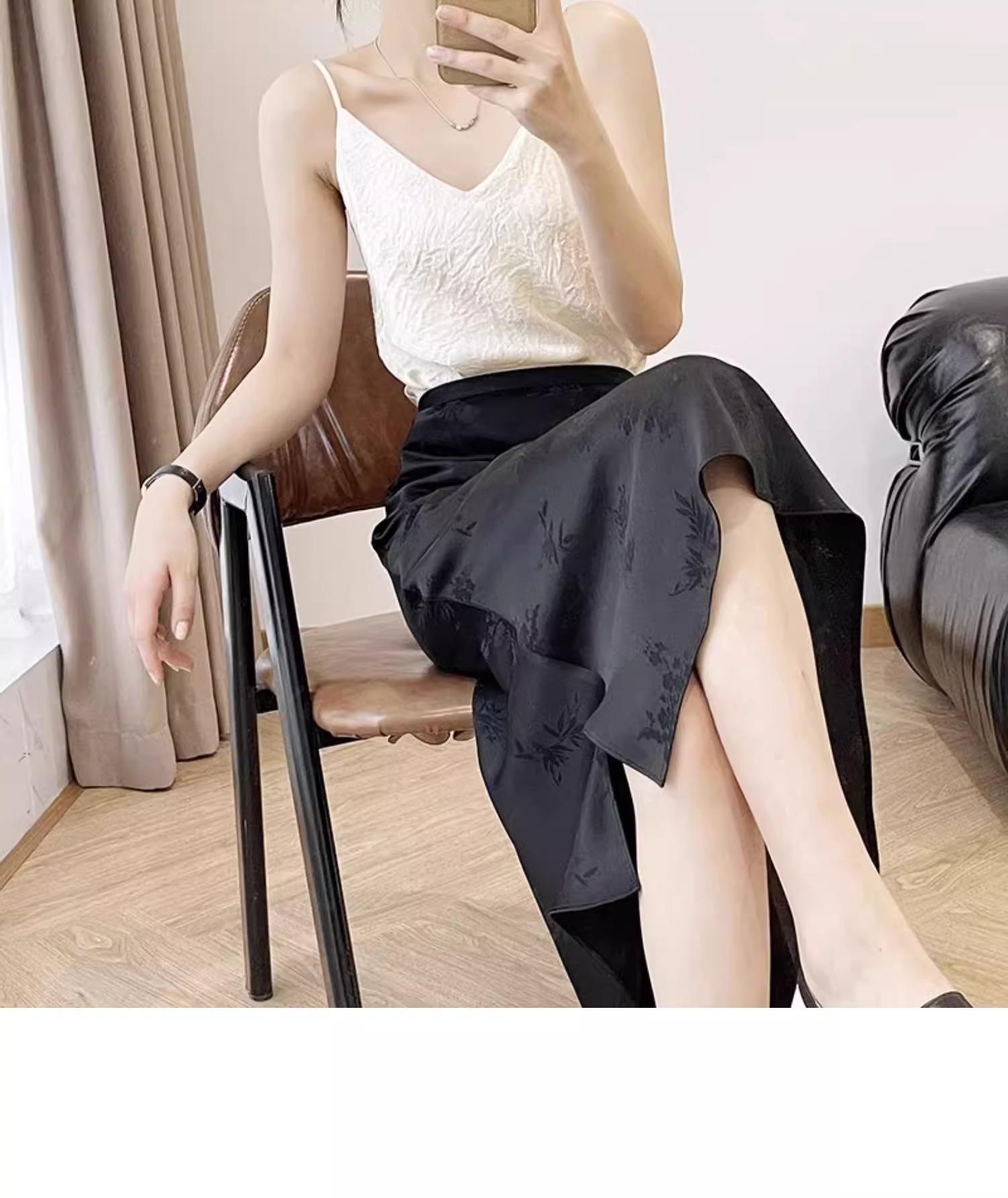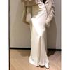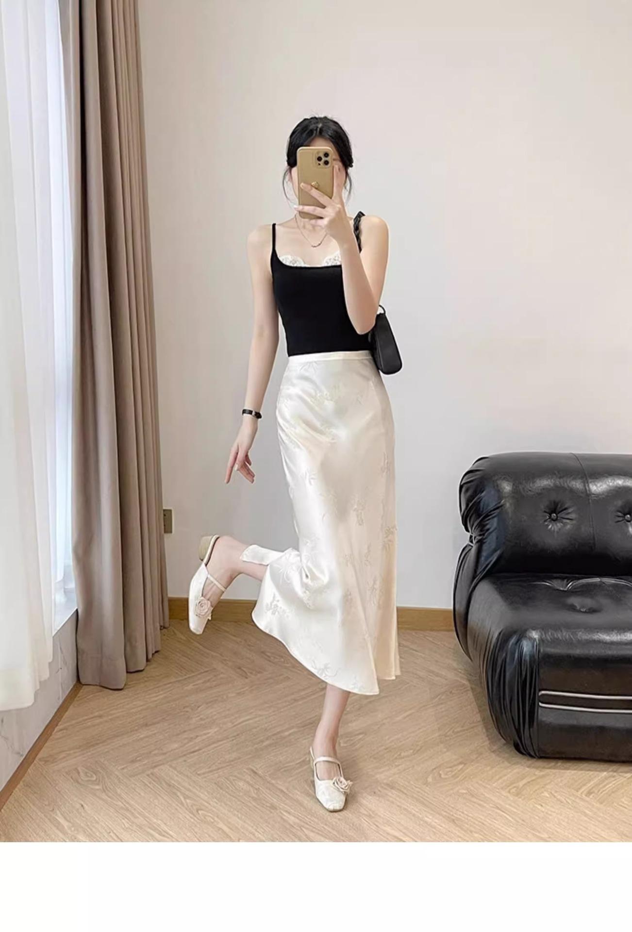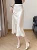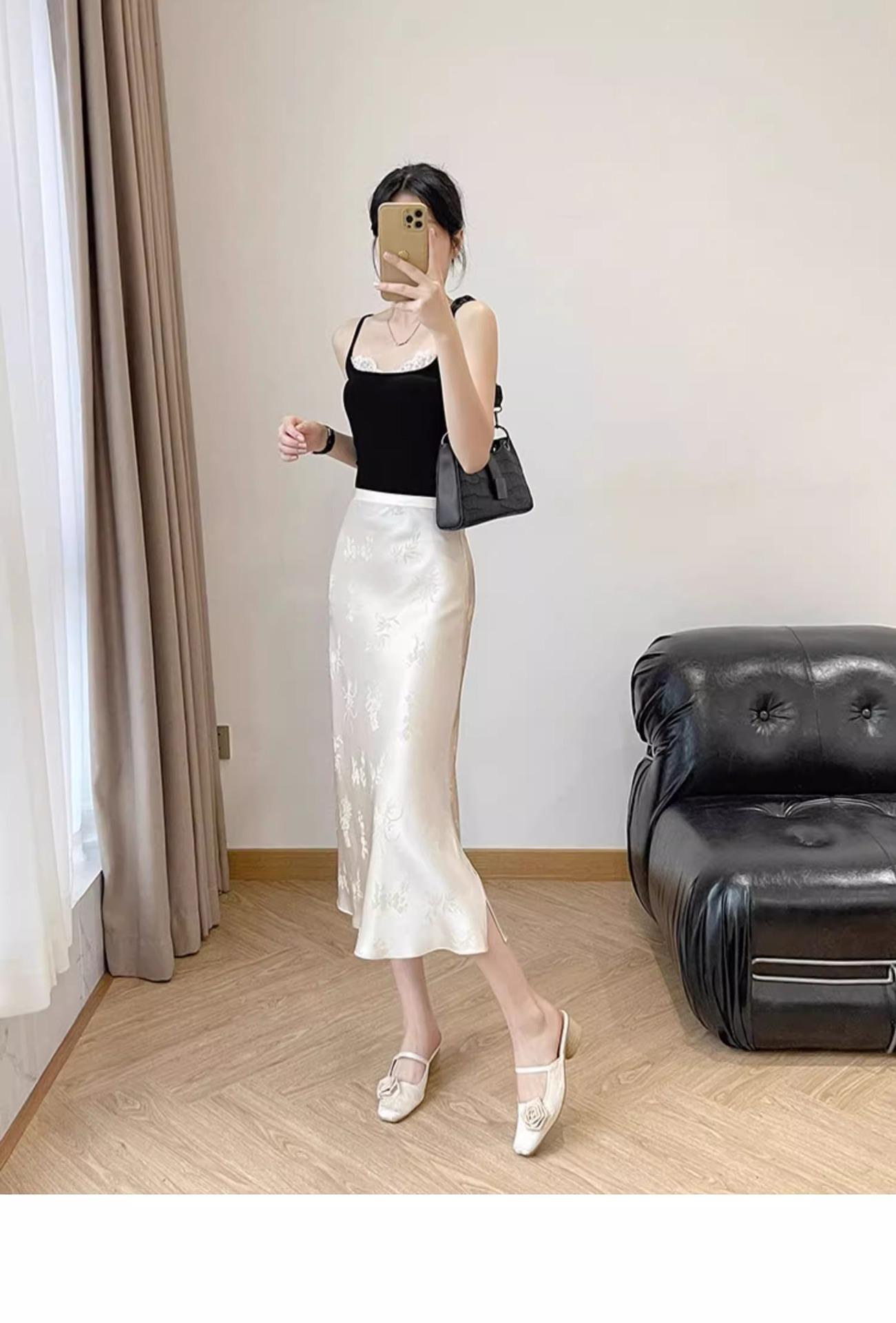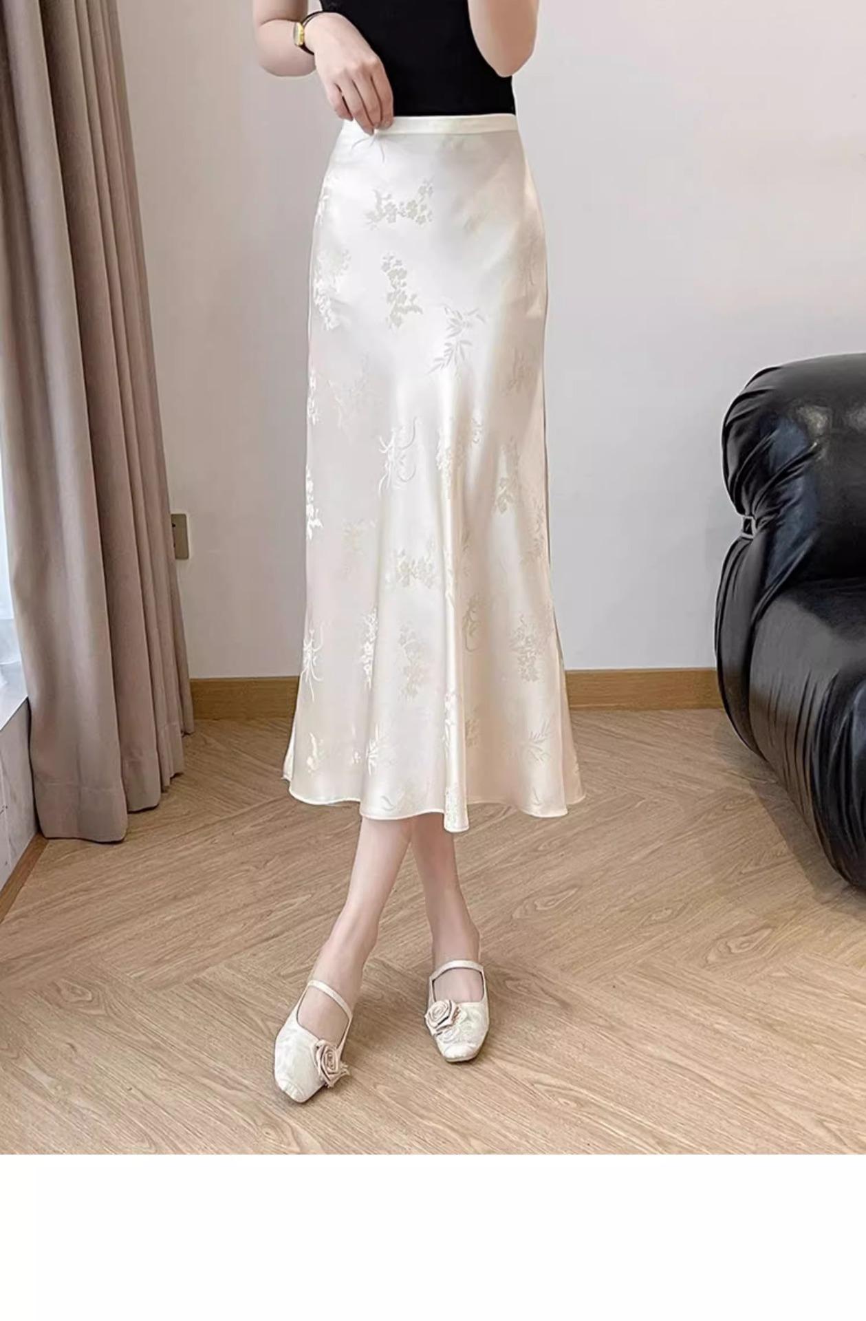 Falda de Cadera de Satén Acetato Imitación para Personas Pequeñas, Jacquard Brillante Cintura Alta Look Adelgazante Línea A Largo Medio A4502