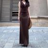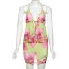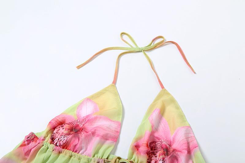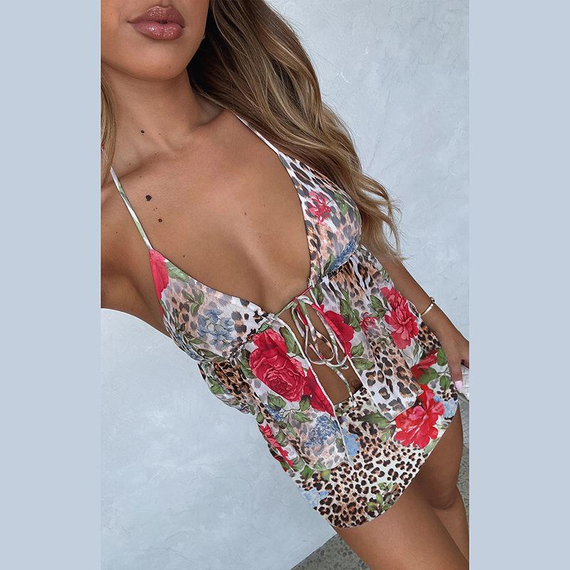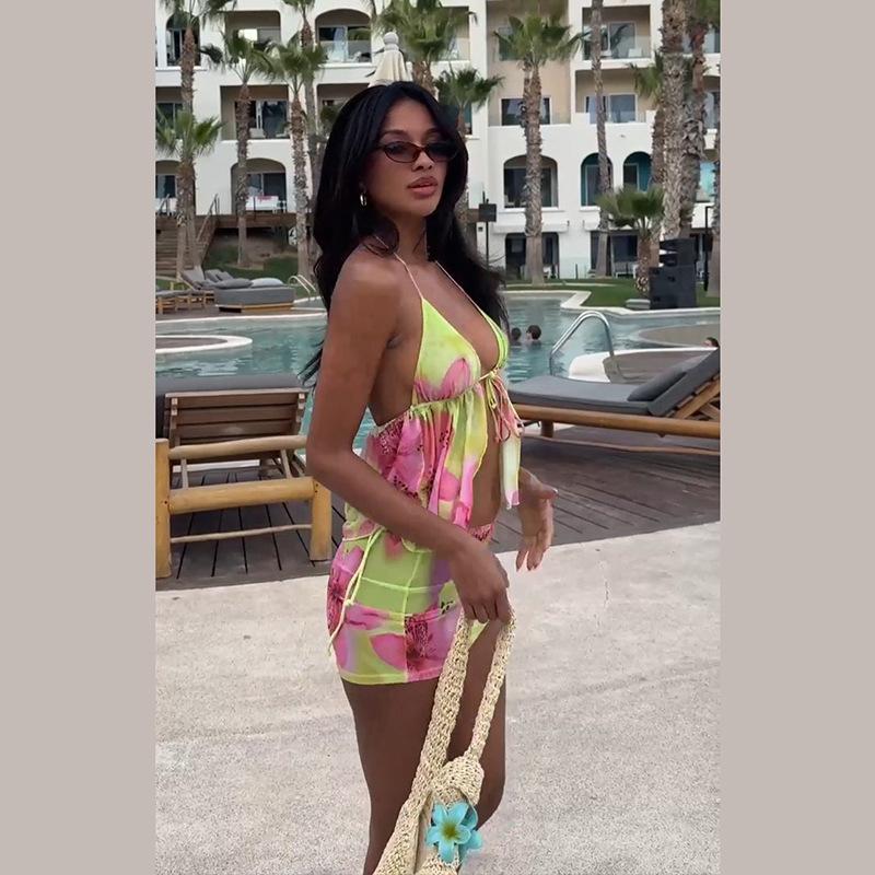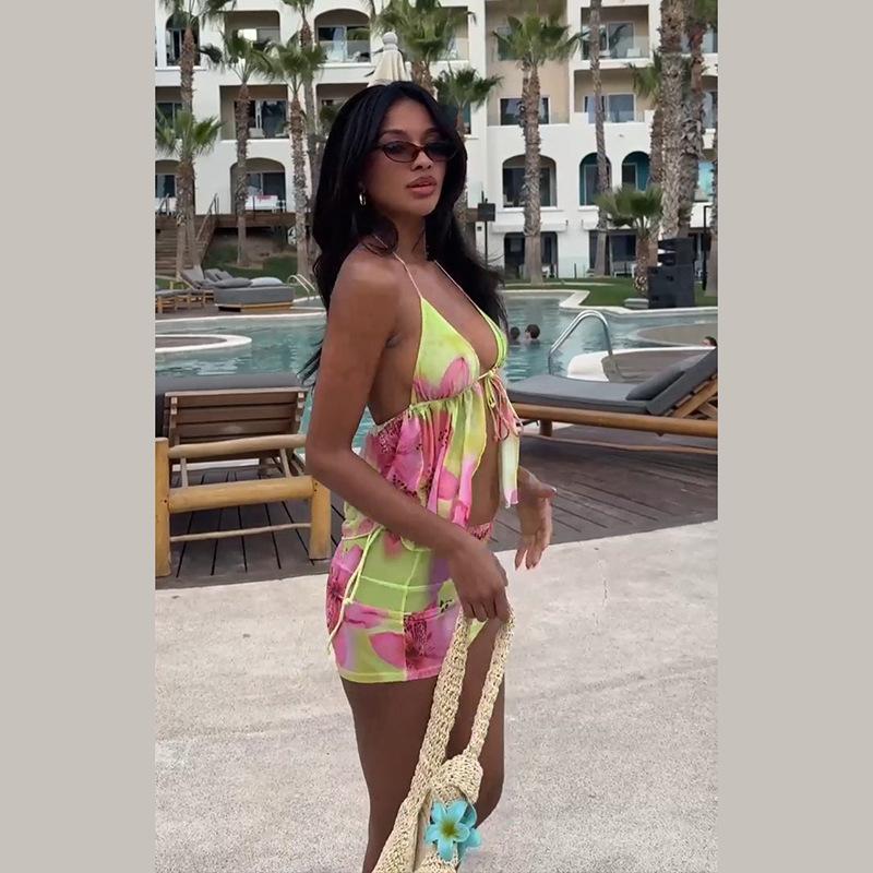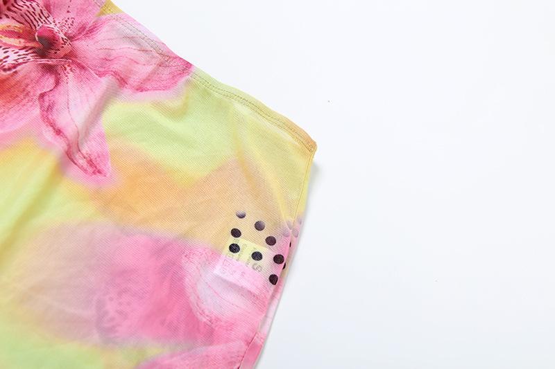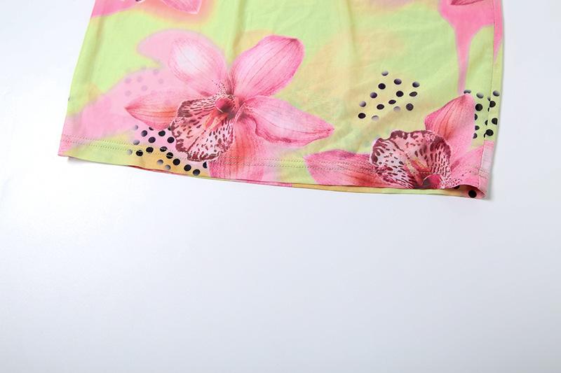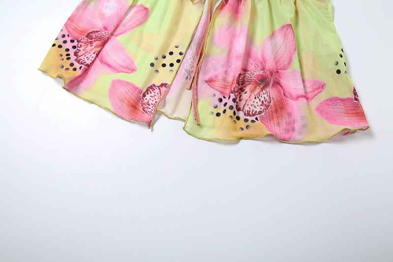 Europeo y Americano 2025 Nuevo Verano para Mujer Chaleco Estampado con Abertura y Empalme de Malla Traje de Falda a la Cadera de Cintura Baja
