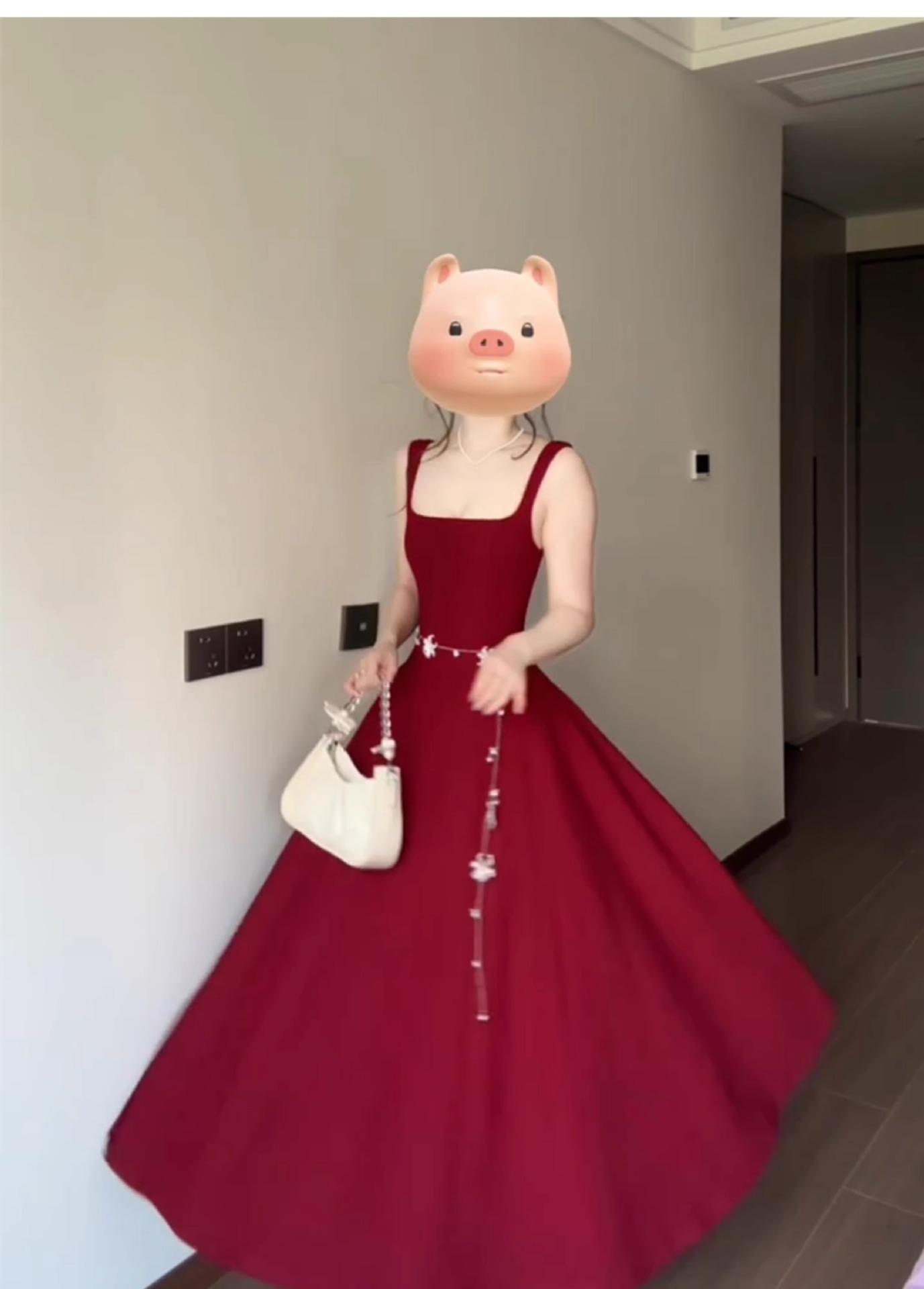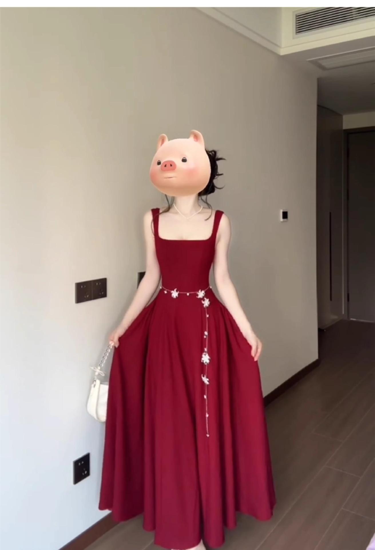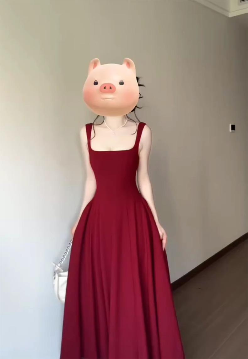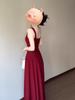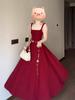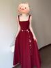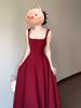 2025 Nuevo Estilo Francés de Alta Gama Vestido Rojo de Tirantes Estilo Hepburn para Mujer Verano Cintura Línea A Falda Larga