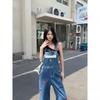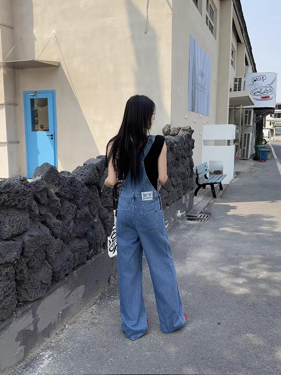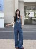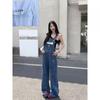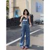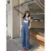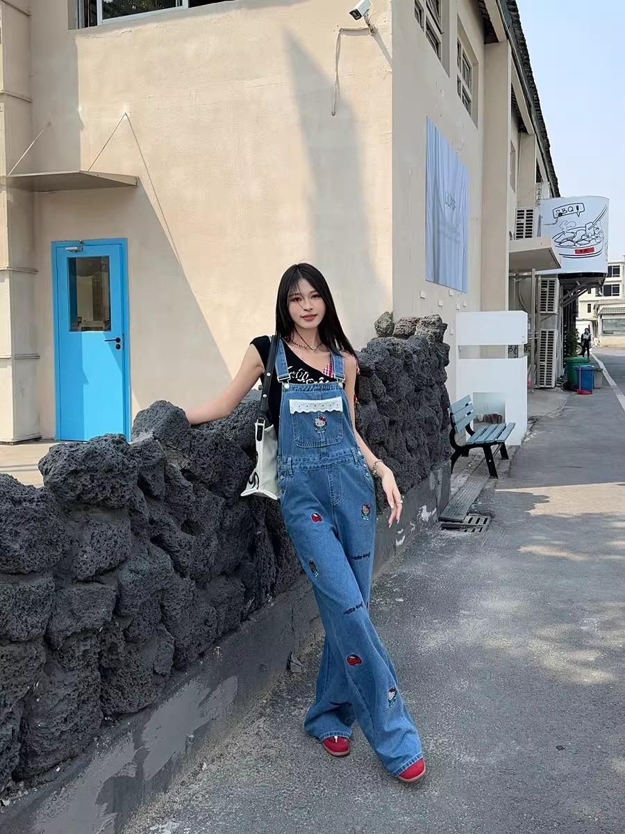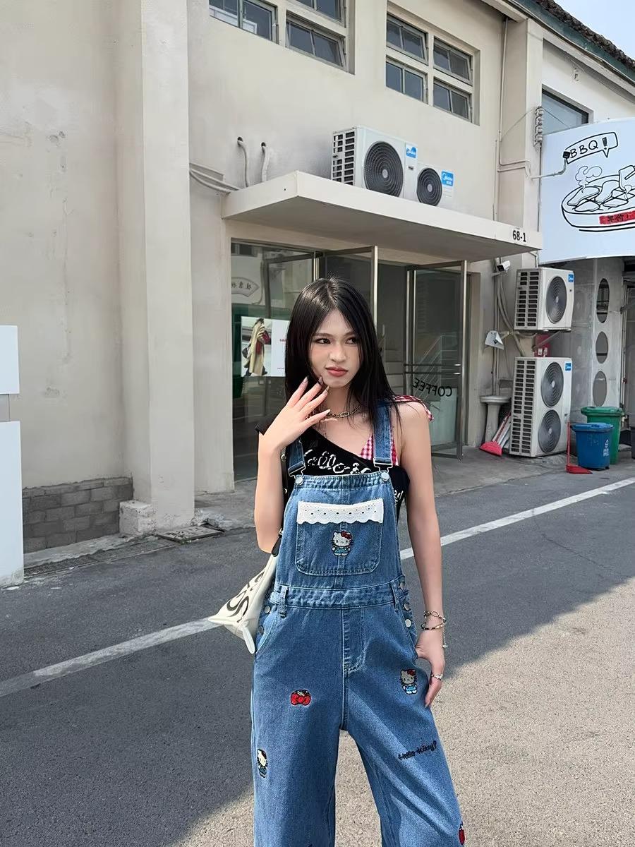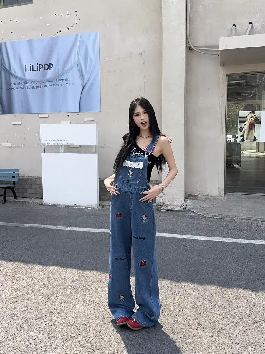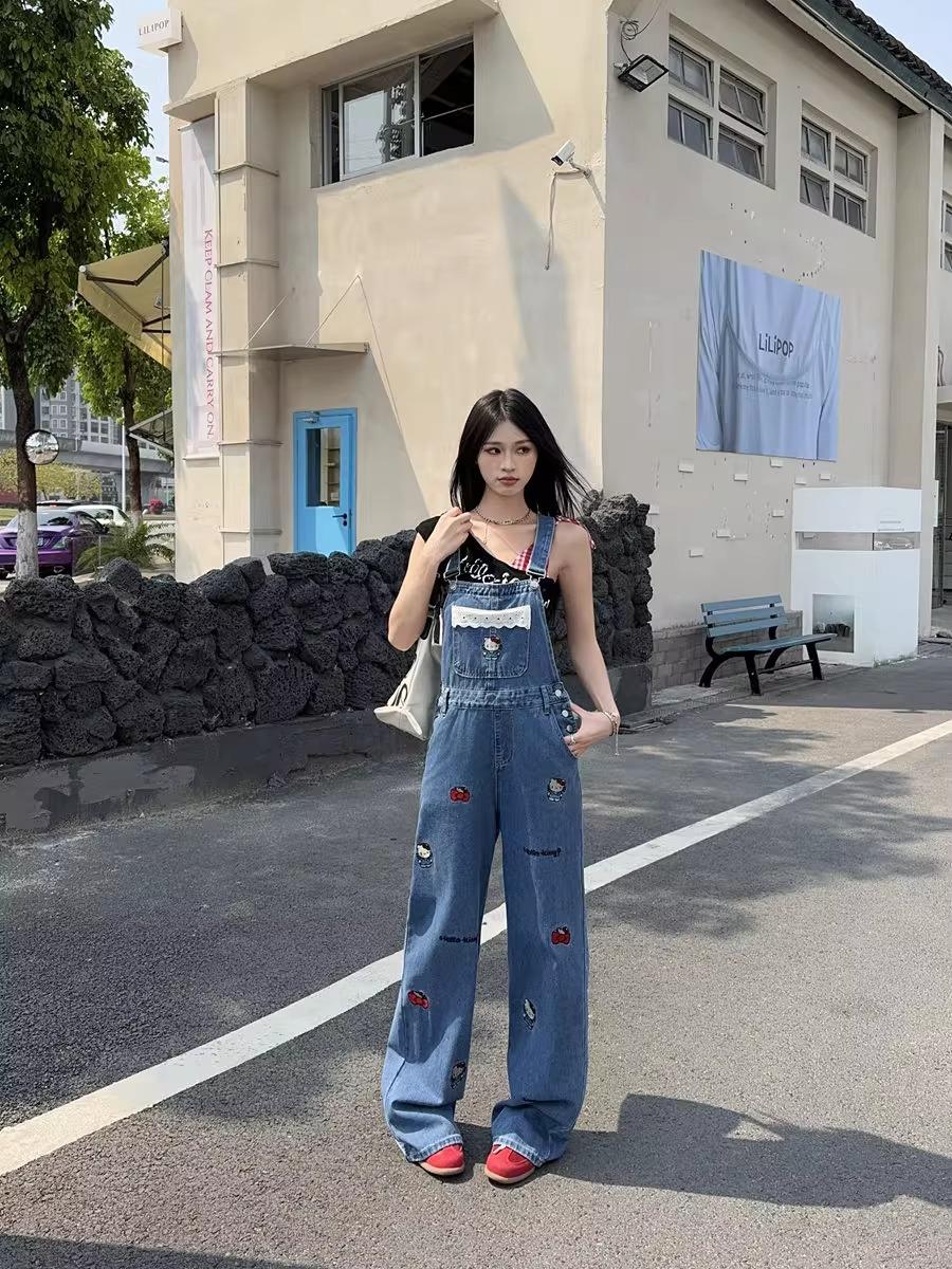 Overol de mezclilla bordado de estilo dulce Kt Cat para mujer 2025 Nuevo Reductor de edad Versátil Cintura alta Suelto Adelgazante Pantalones de pierna ancha