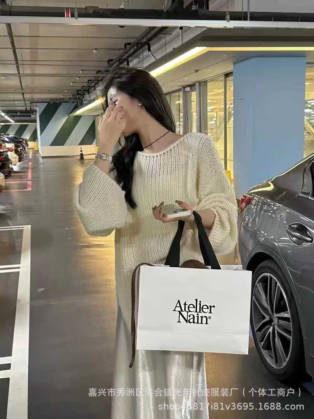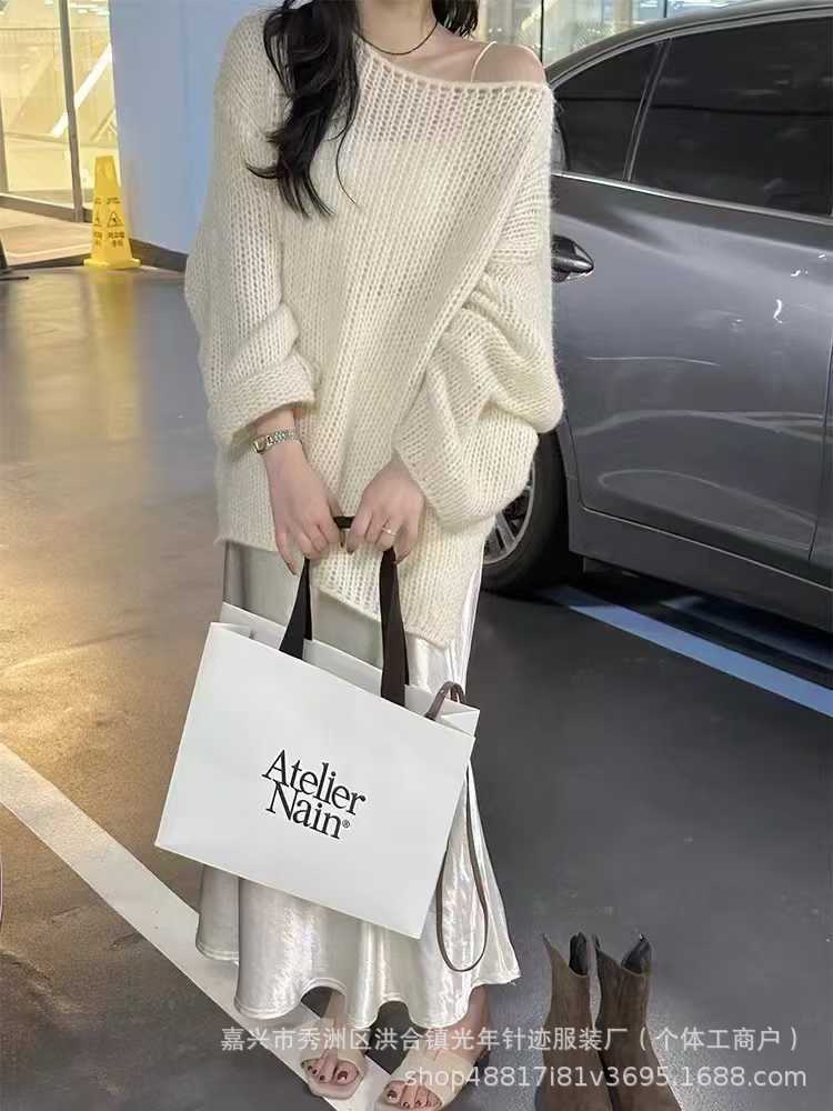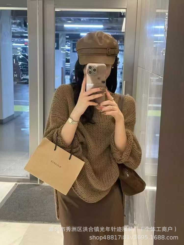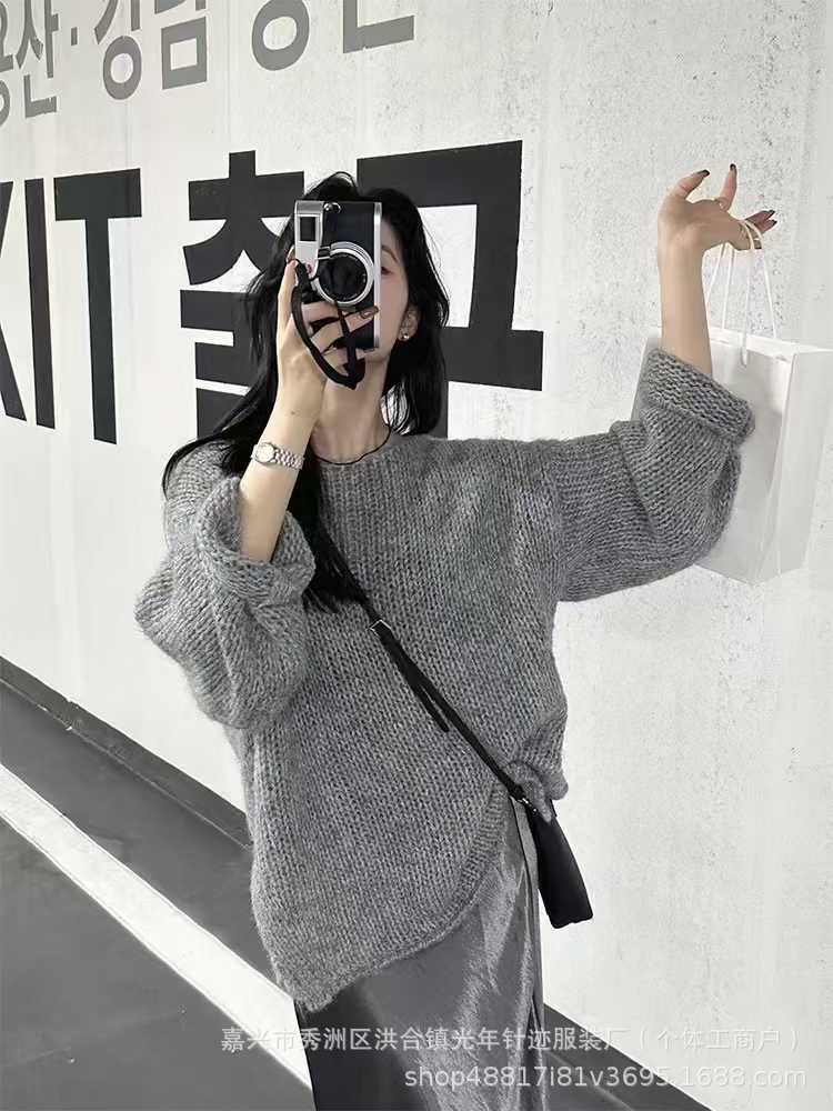 2025 Nuevo Otoño e Invierno Moda Elegante Versátil Sencillo Adelgazante Abertura Lateral Suelto Cuello Redondo Manga Larga Suéter