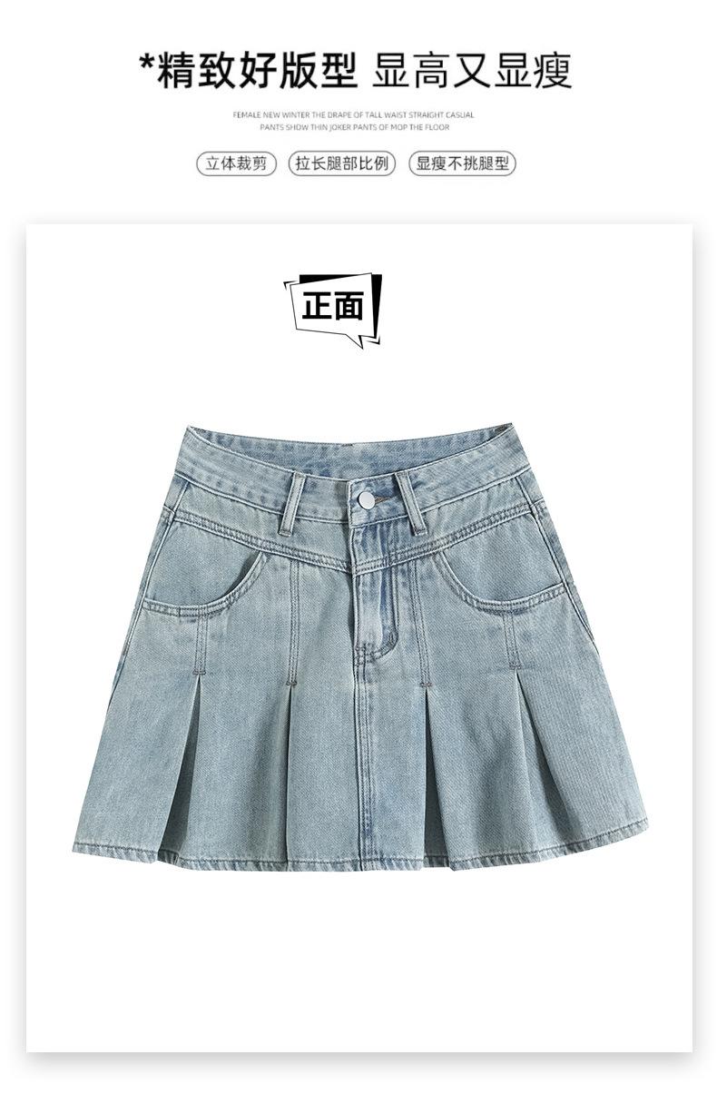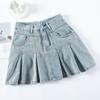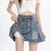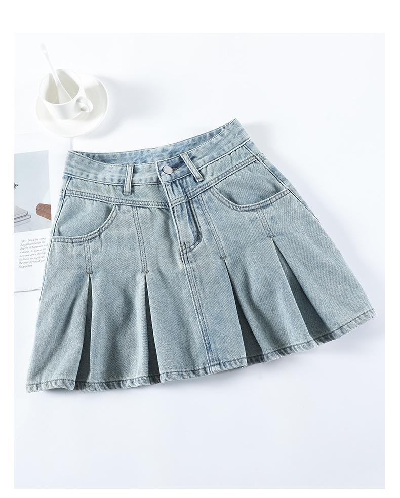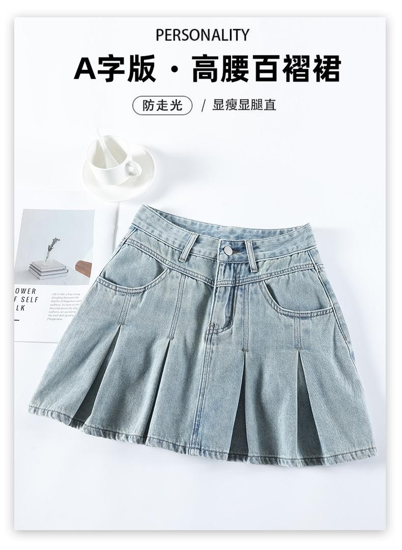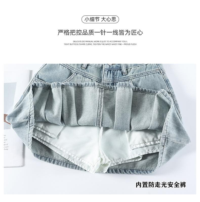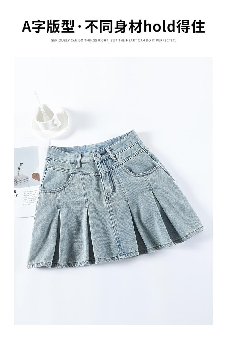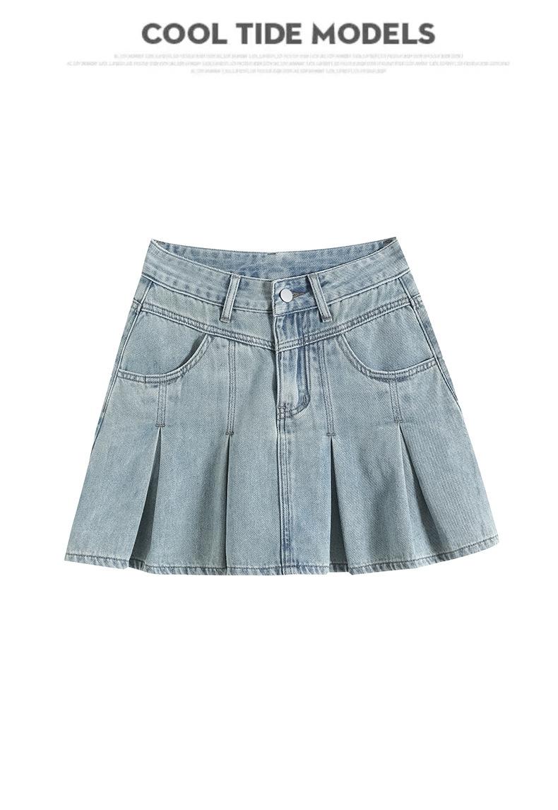 Falda de mezclilla retro americana para mujer verano 2025 nueva falda corta plisada acampanada de cintura alta y corte slim para personas pequeñas
