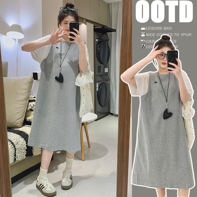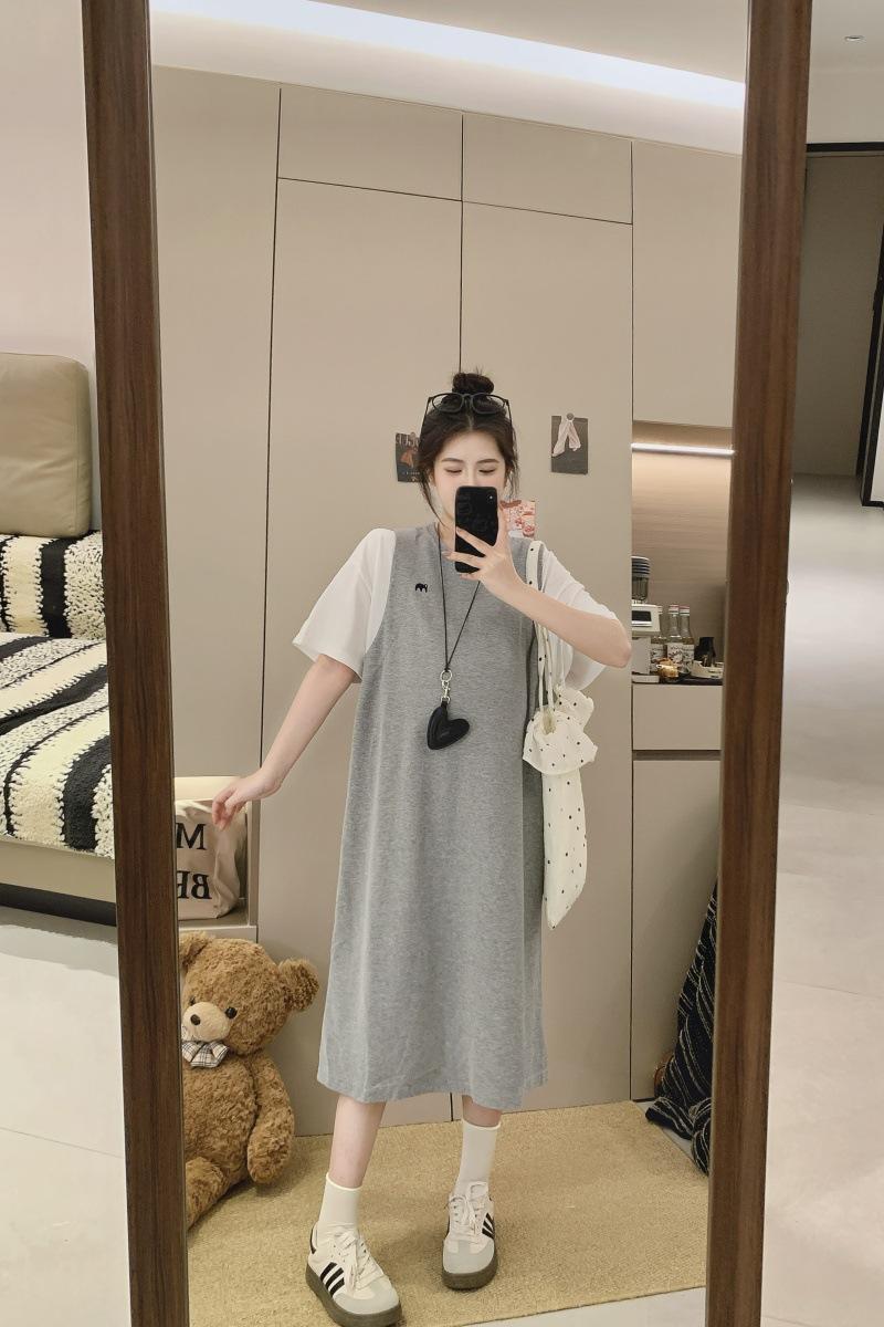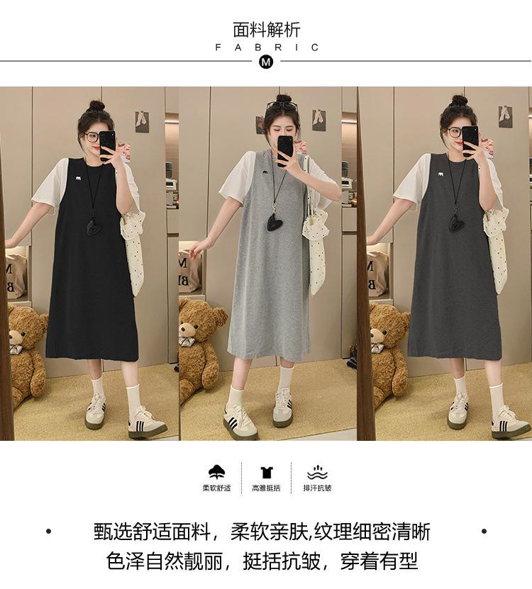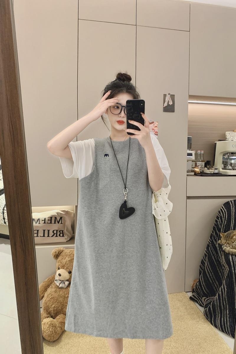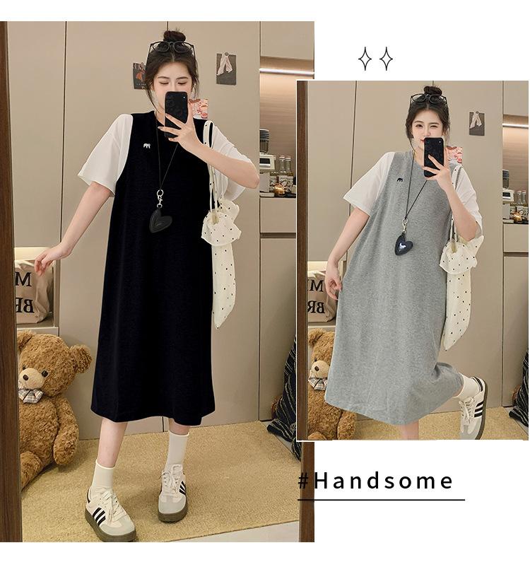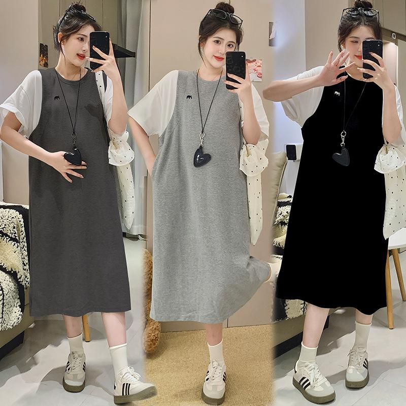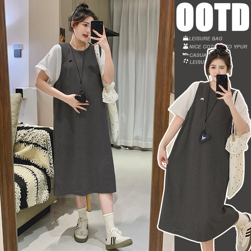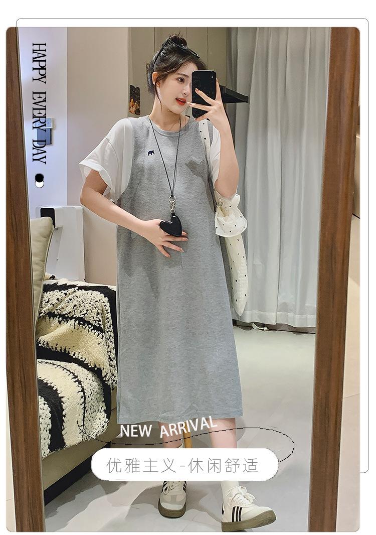 Ropa de Maternidad 2025 Verano Nuevo Estilo Coreano Moda Falso Dos Piezas Bordado Simple Look Adelgazante Talla Grande Vestido de Maternidad