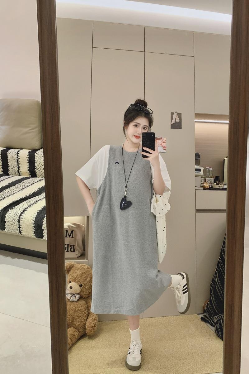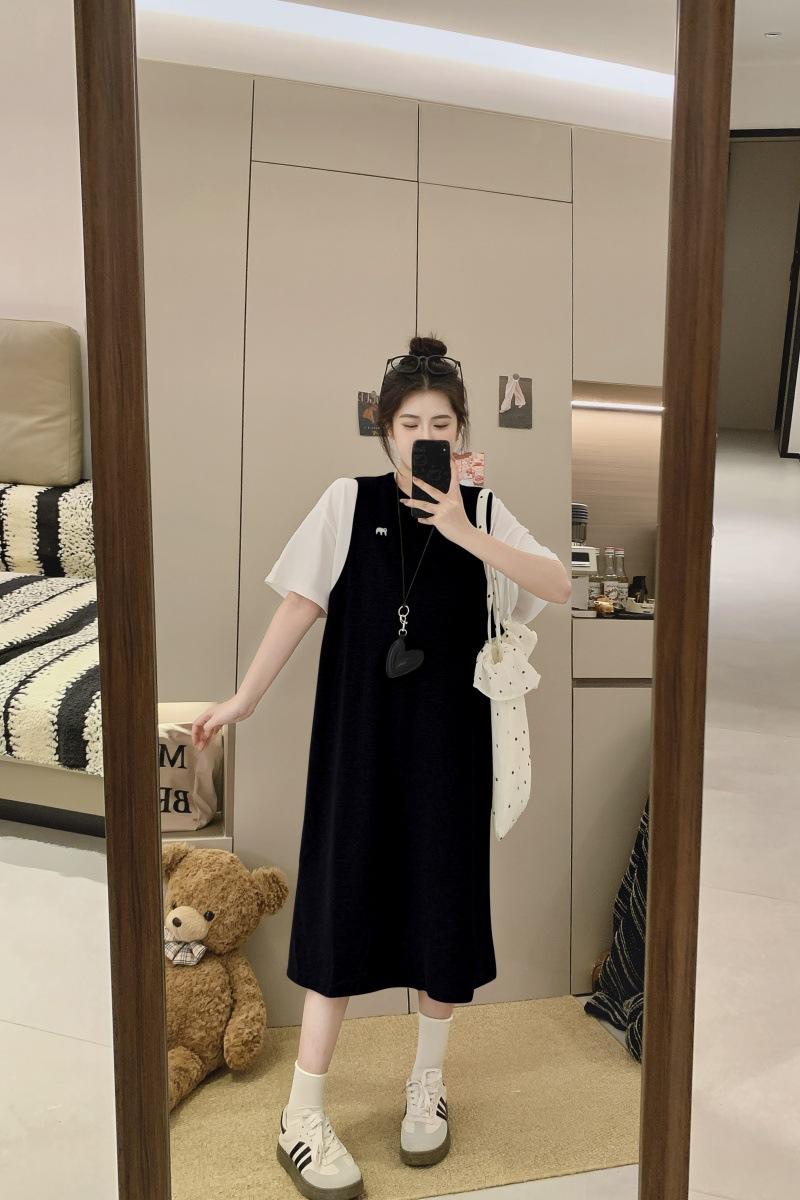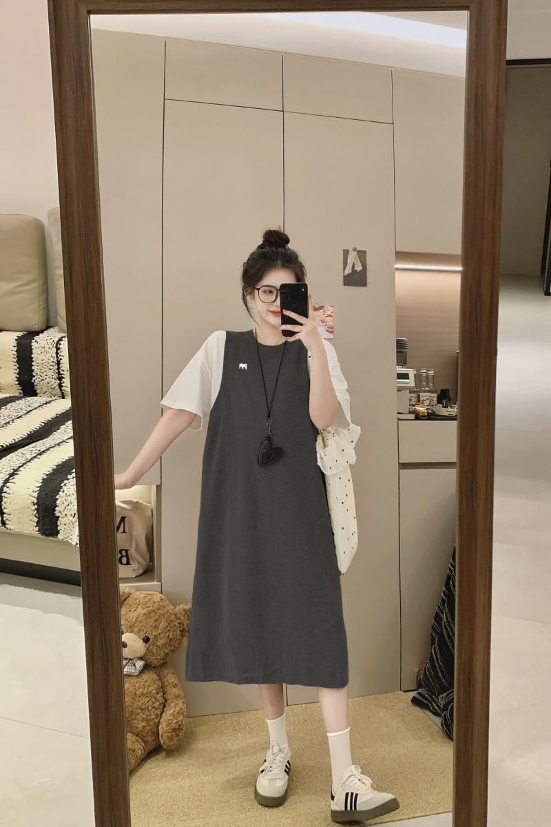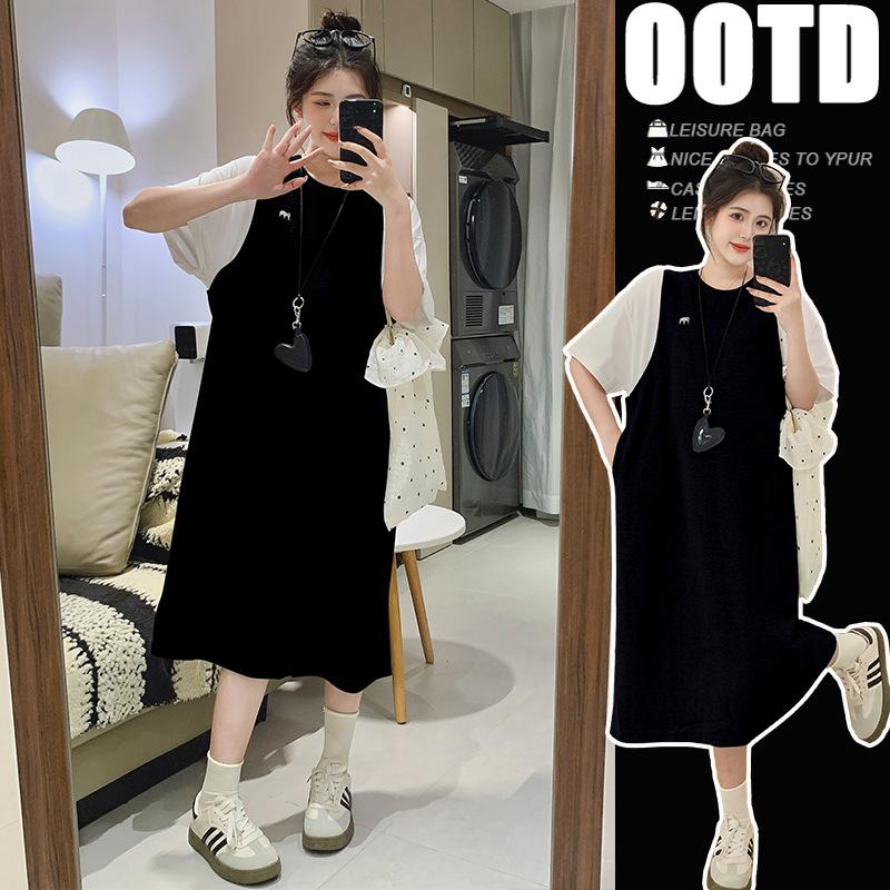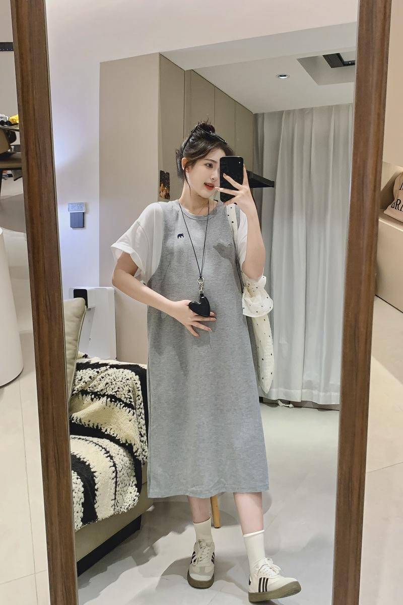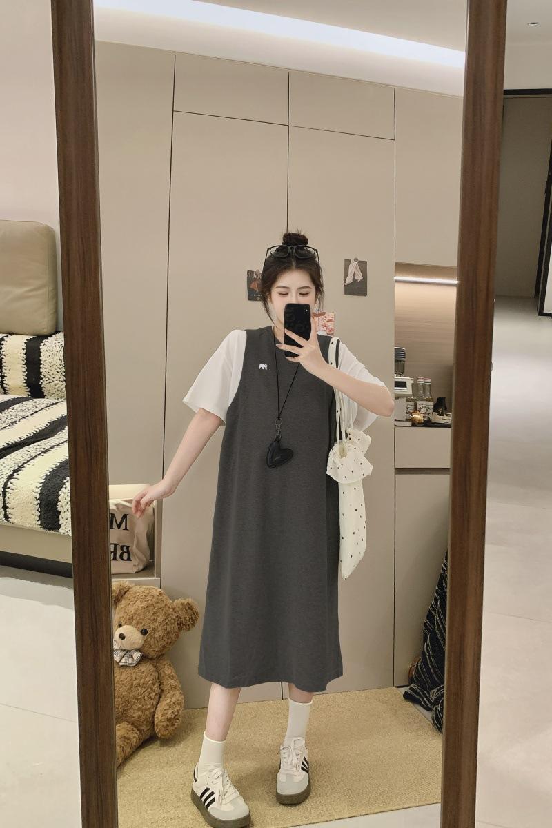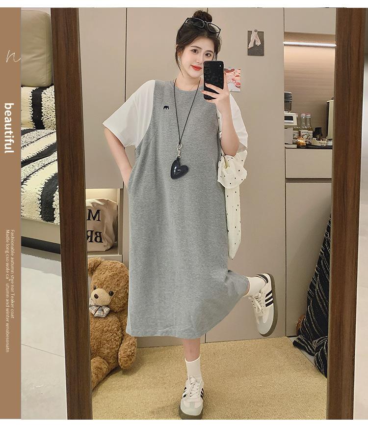 Ropa de Maternidad 2025 Verano Nuevo Estilo Coreano Moda Falso Dos Piezas Bordado Simple Look Adelgazante Talla Grande Vestido de Maternidad