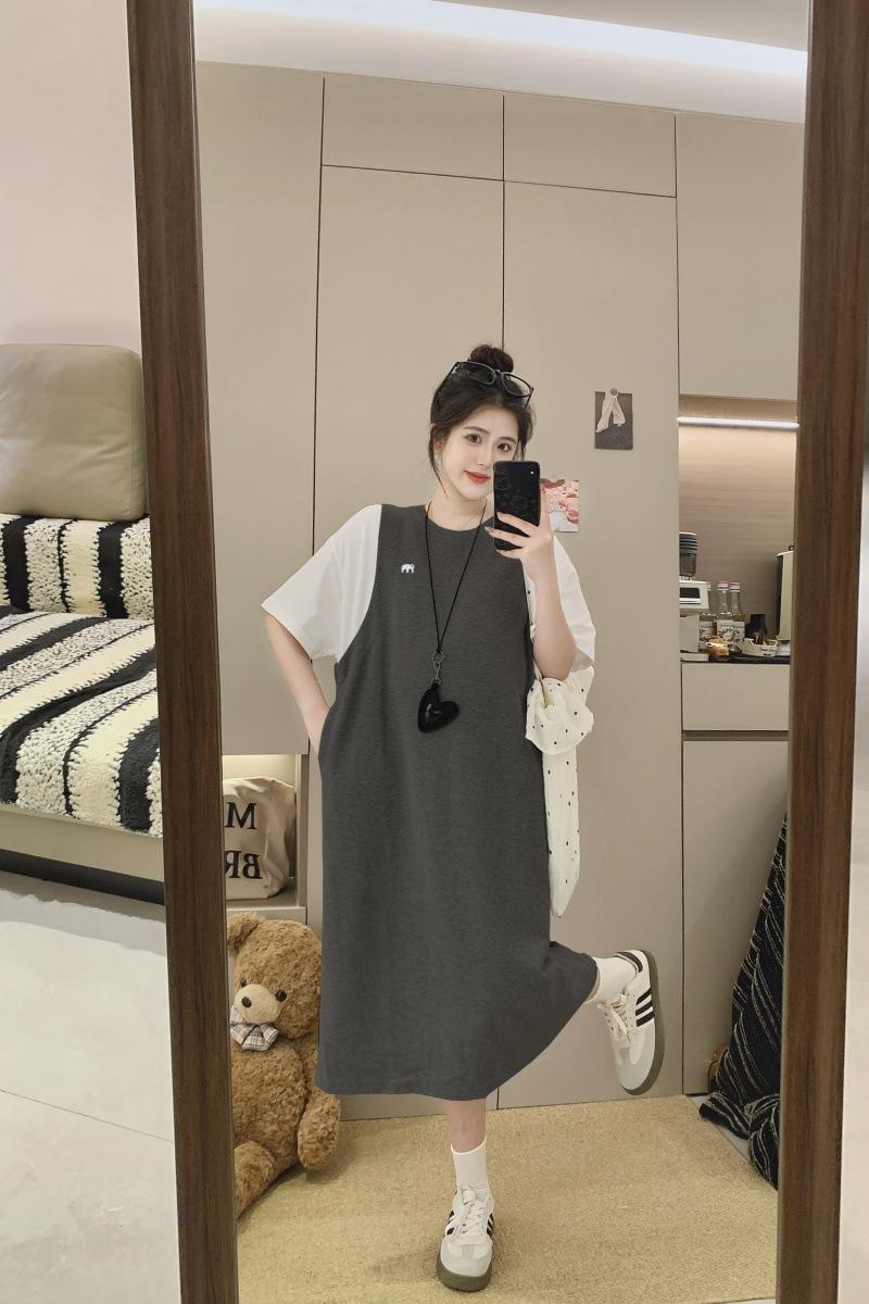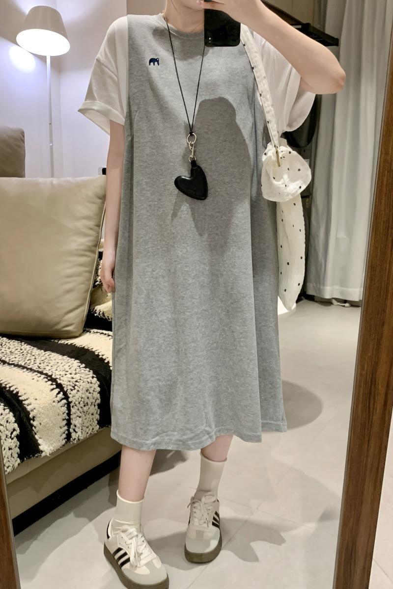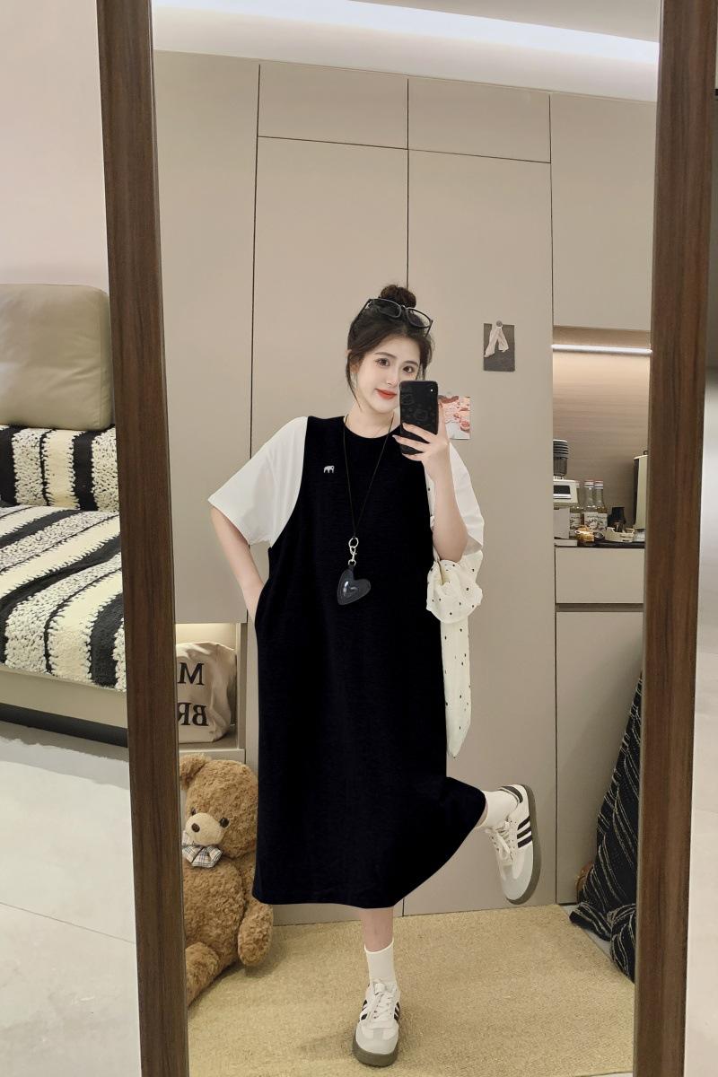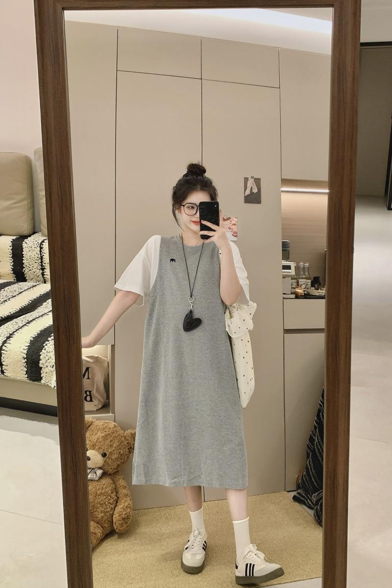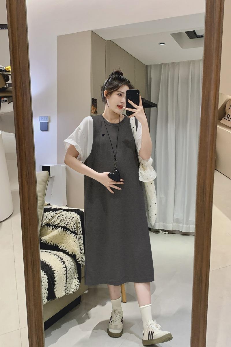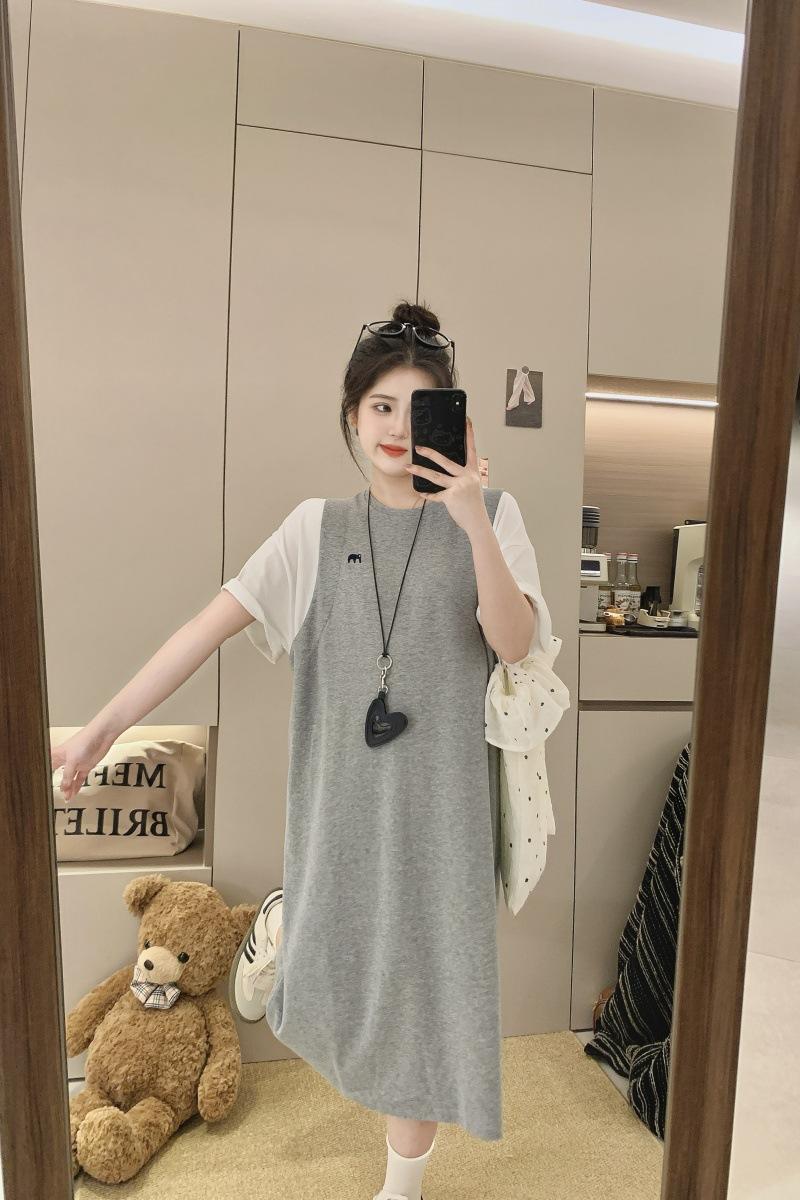 Ropa de Maternidad 2025 Verano Nuevo Estilo Coreano Moda Falso Dos Piezas Bordado Simple Look Adelgazante Talla Grande Vestido de Maternidad