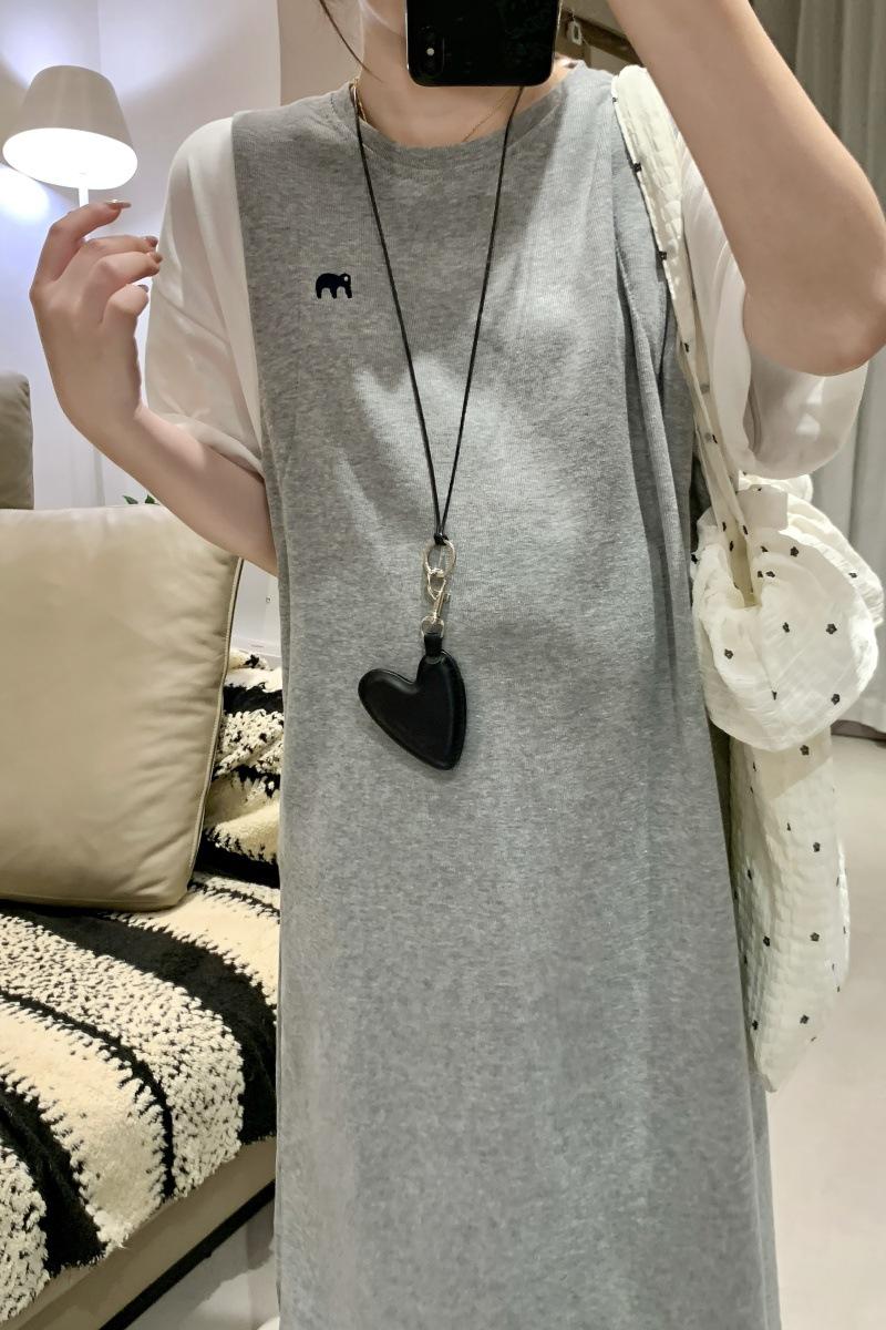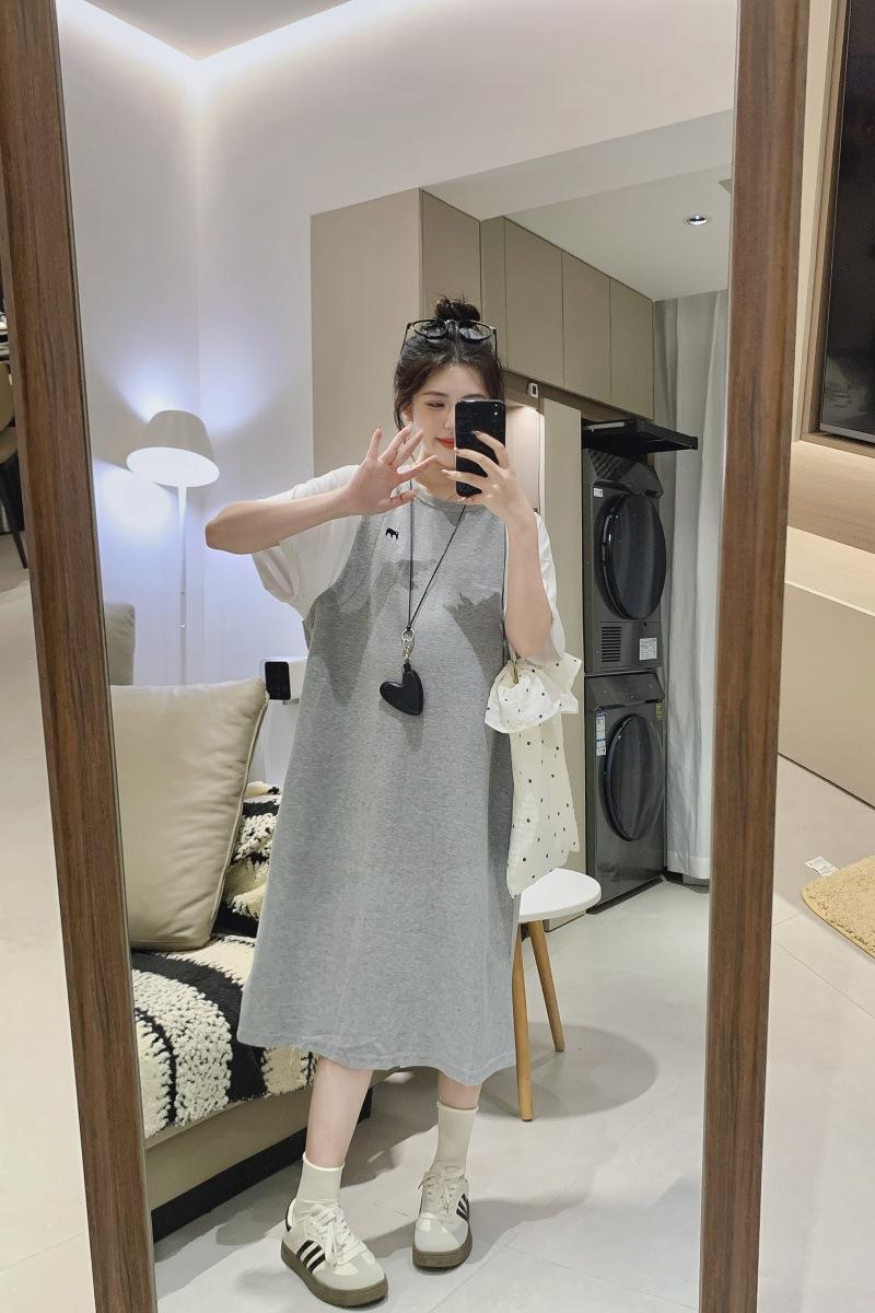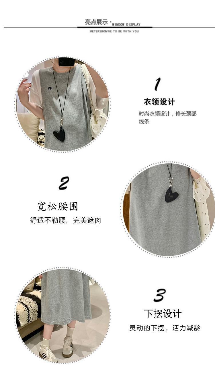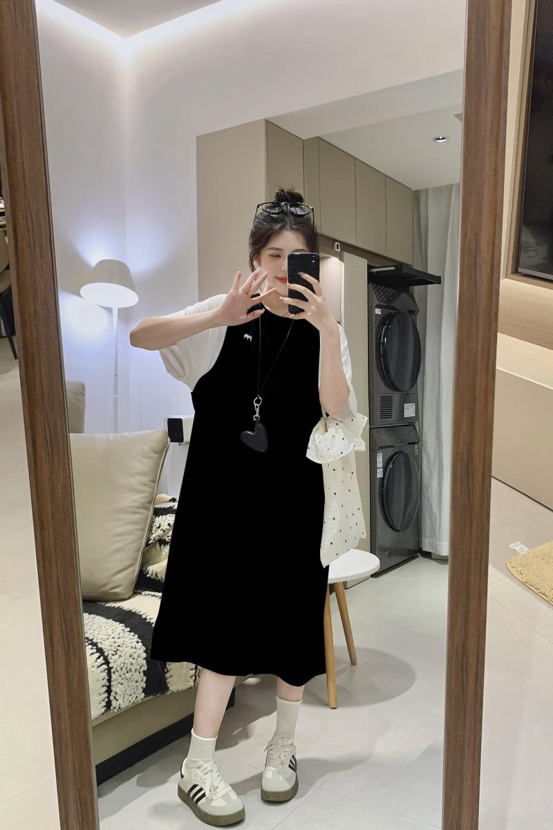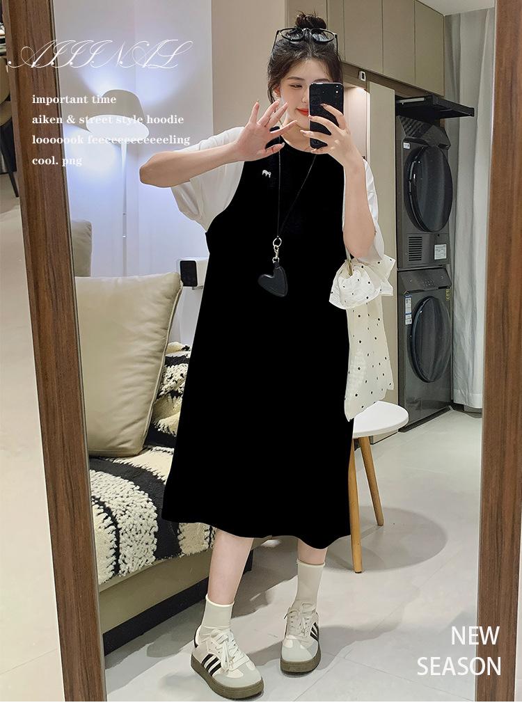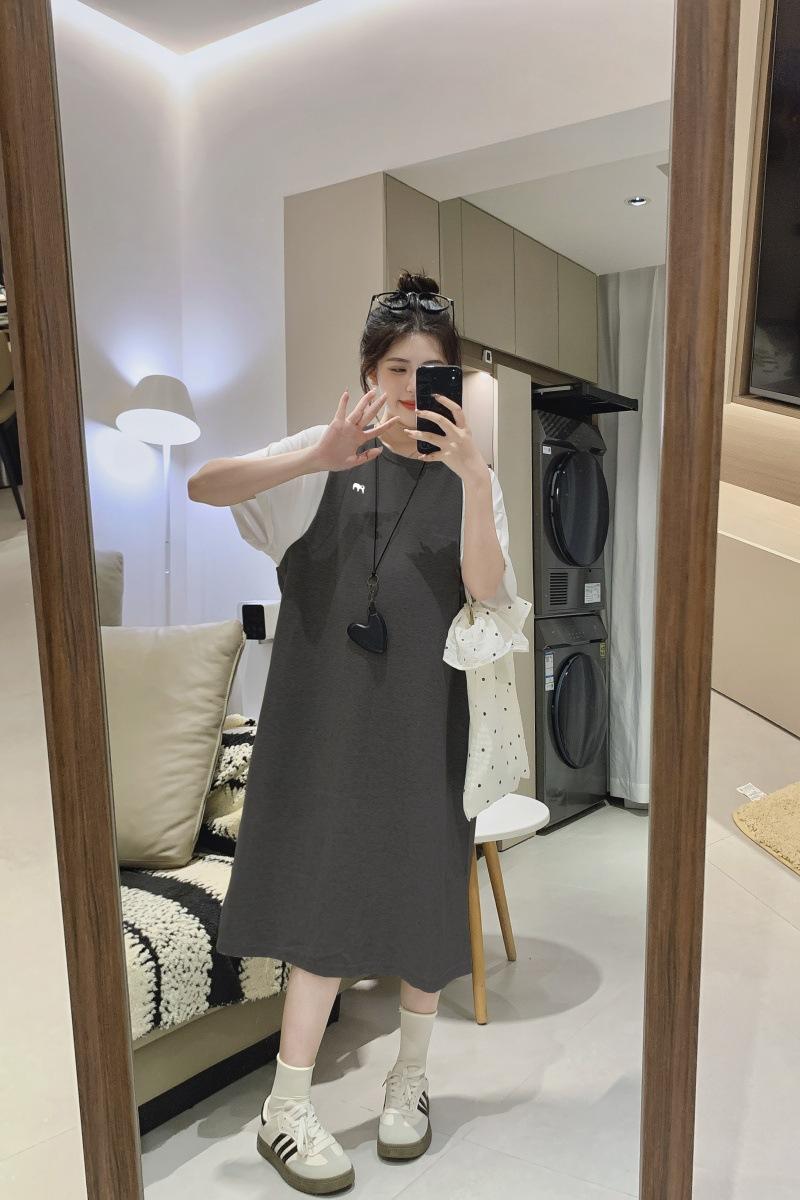 Ropa de Maternidad 2025 Verano Nuevo Estilo Coreano Moda Falso Dos Piezas Bordado Simple Look Adelgazante Talla Grande Vestido de Maternidad