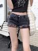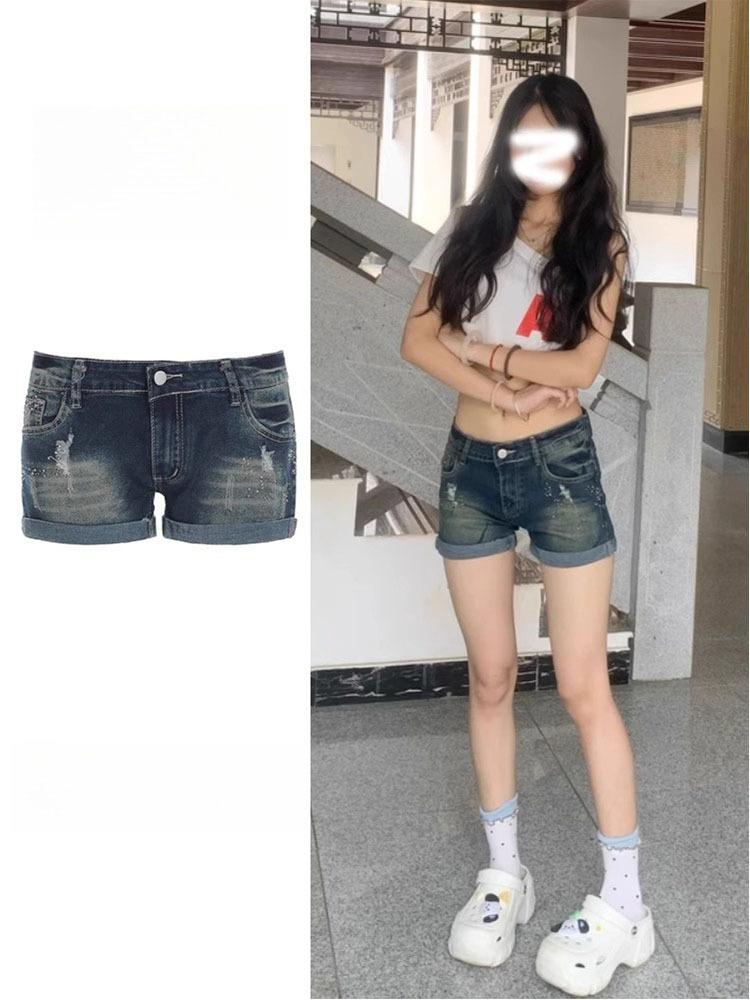 Shorts de mezclilla deslavados con pedrería de tiro bajo a la moda para mujer, verano talla grande, pantalones cortos ajustados con puño que realzan la cadera