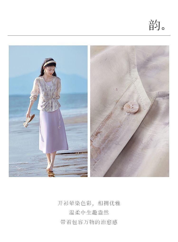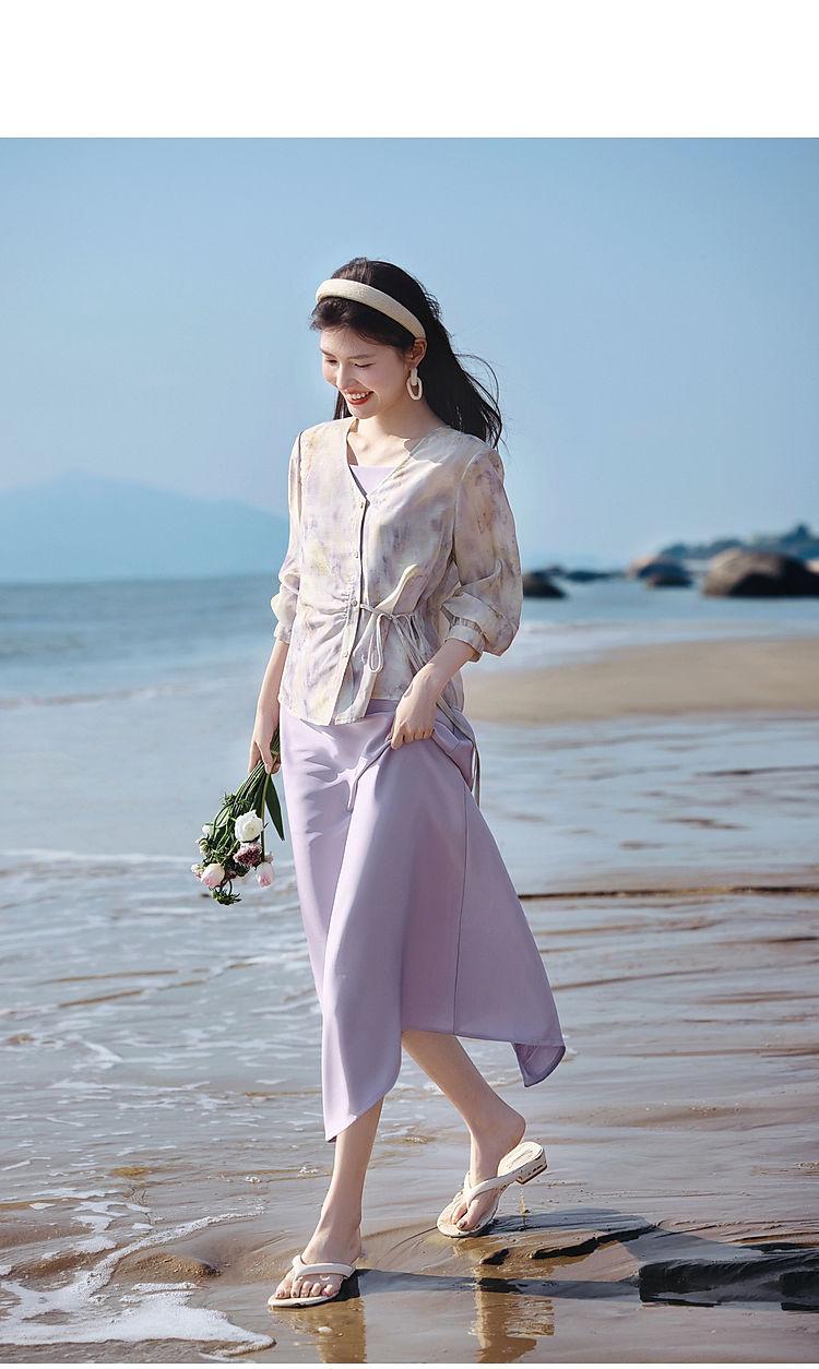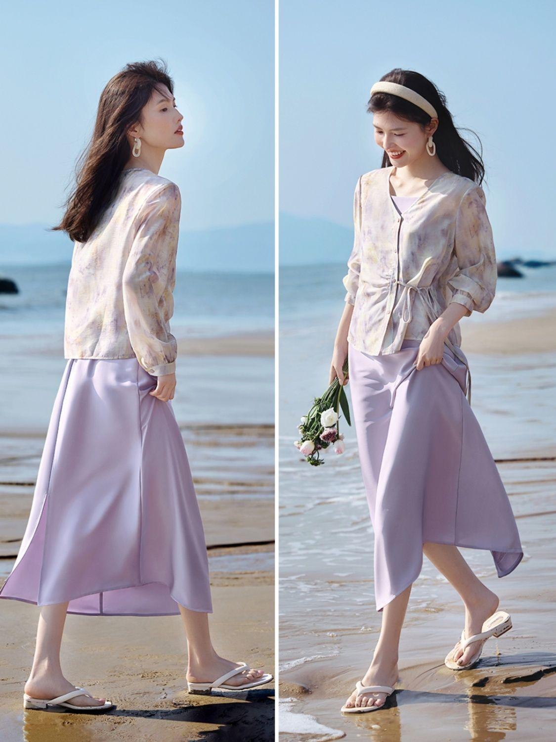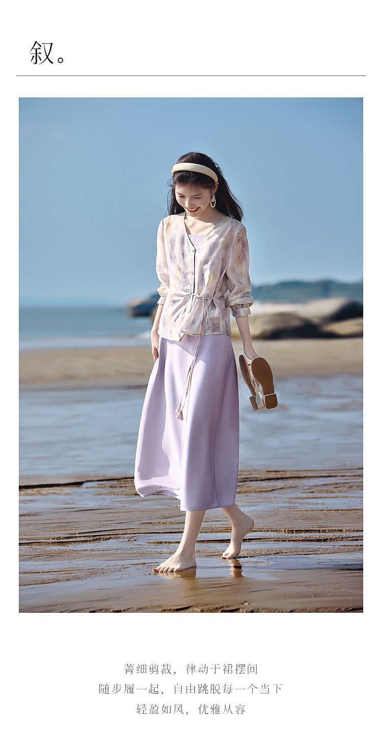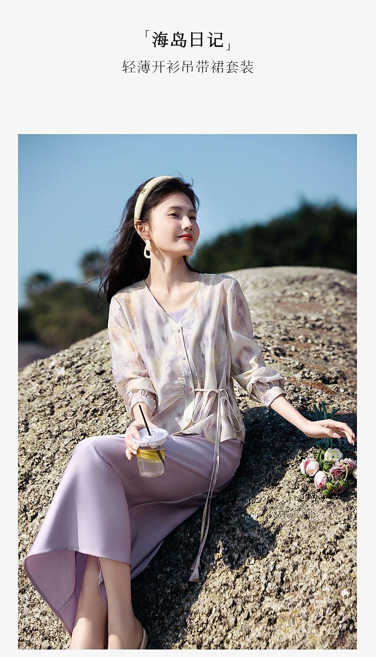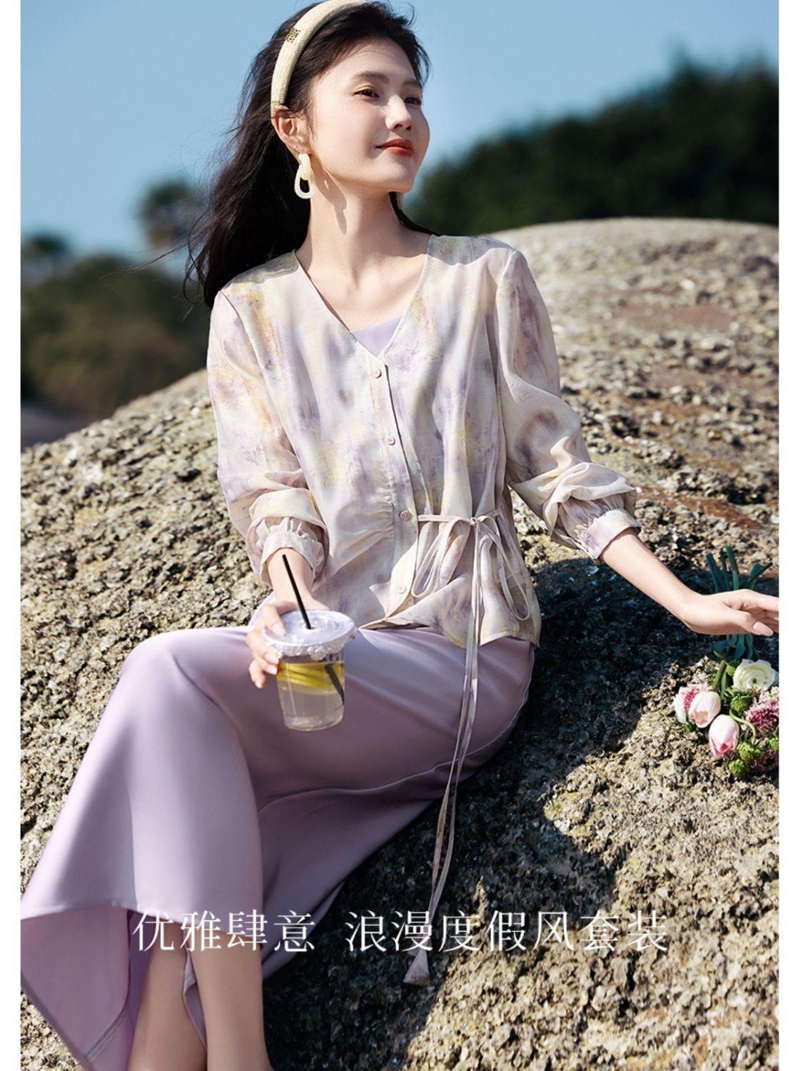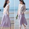 Elegante Elegante Estilo Vacacional Teñido Cárdigan Ligero Traje Falda Slip 2025 Verano Traje de Dos Piezas