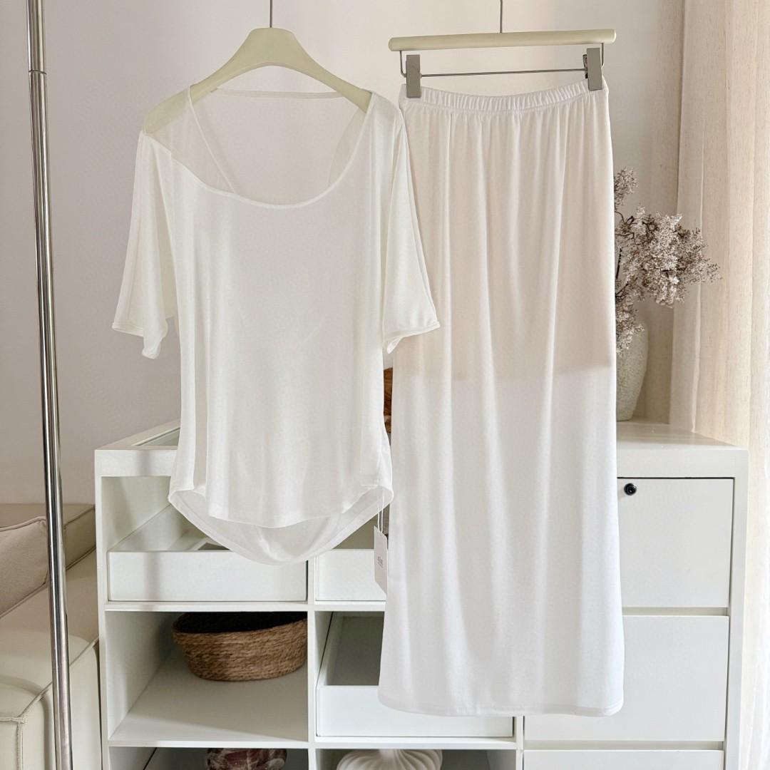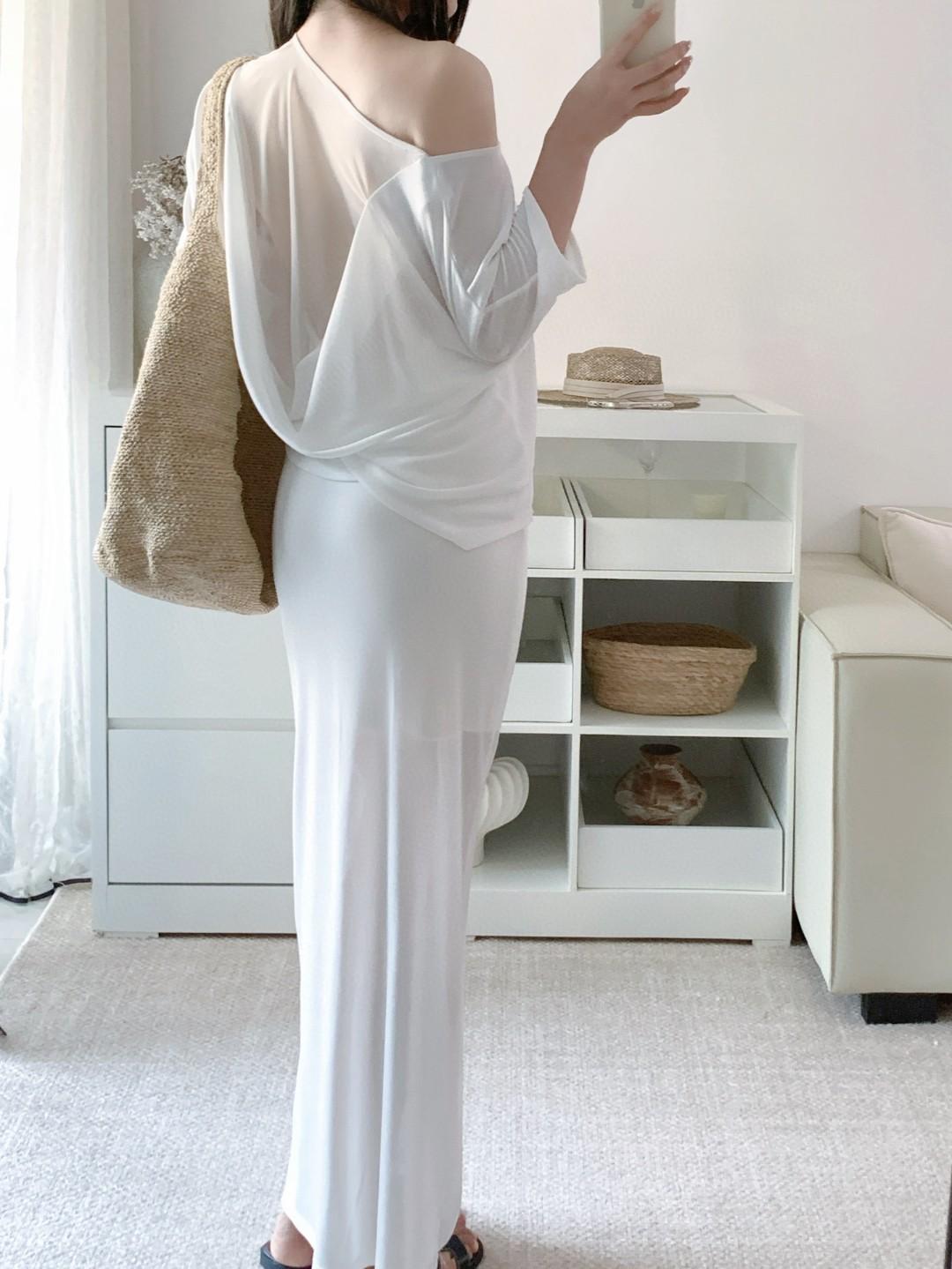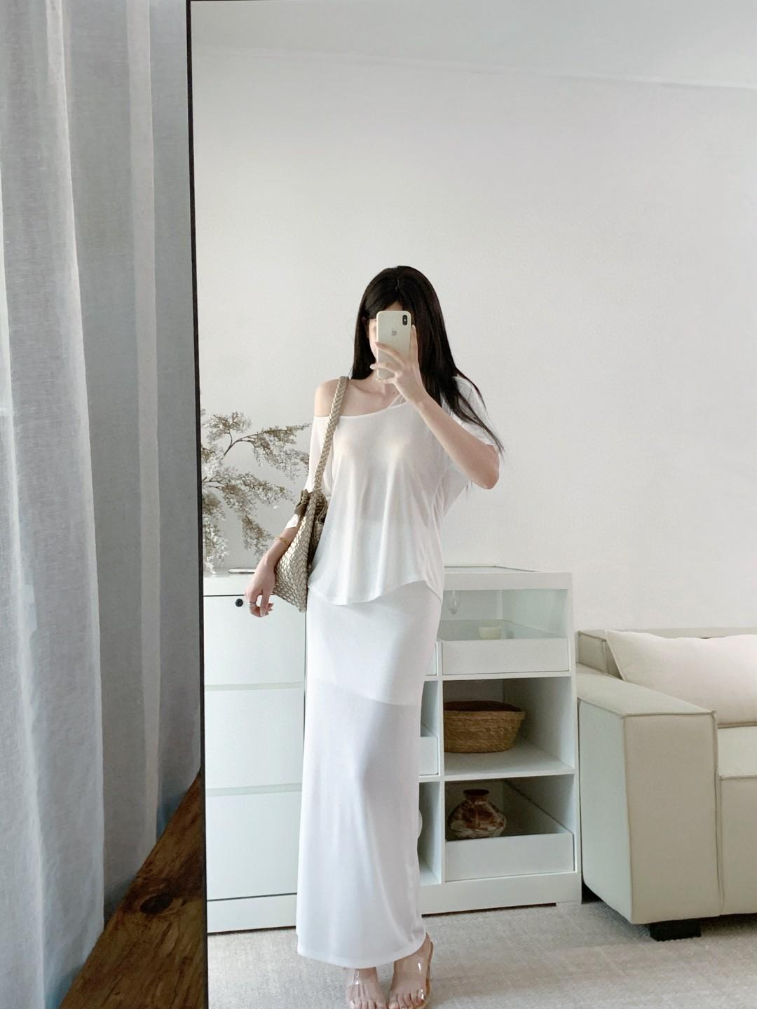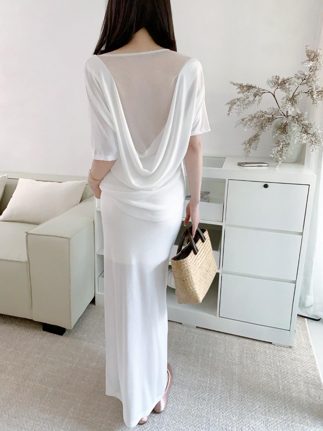 Estilo Veraniego Lujurioso Puro Falda Tejida de Manga Corta Holgada y Slim Diosa Traje Blanco Relajado