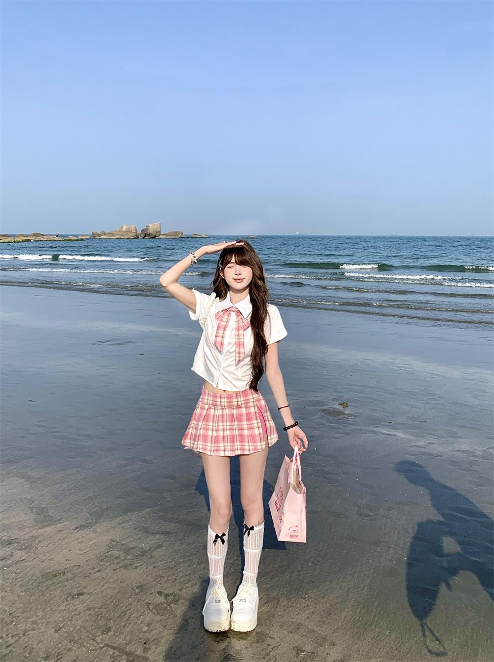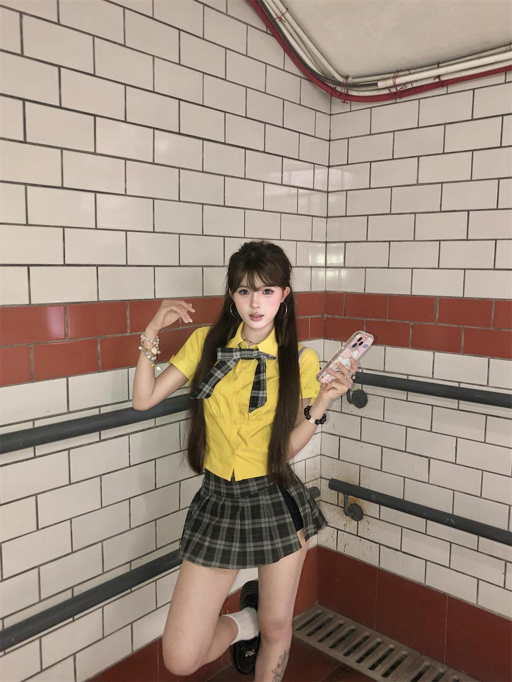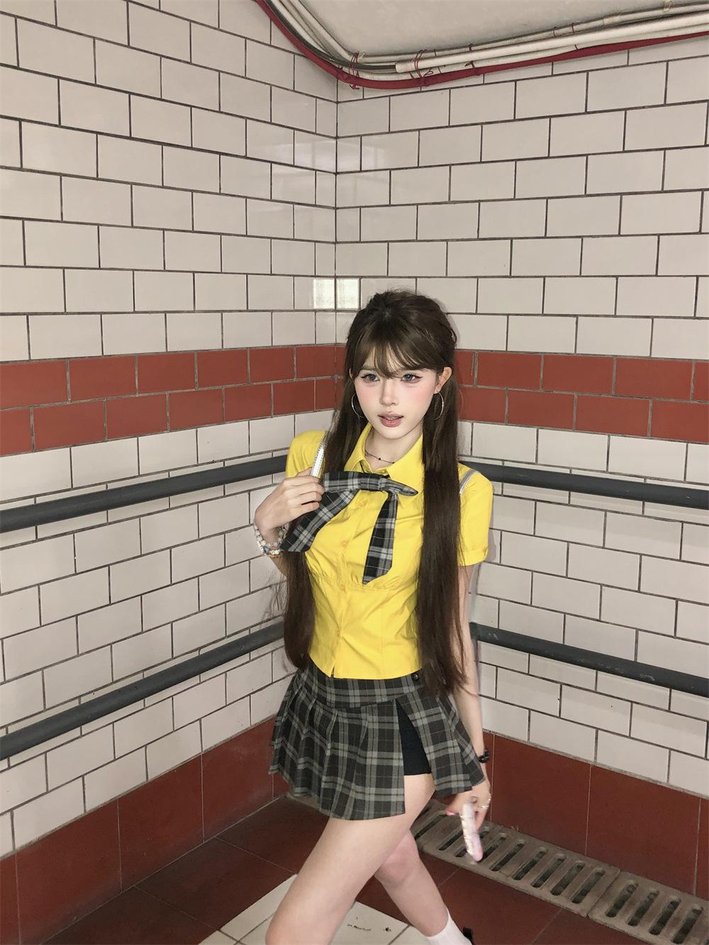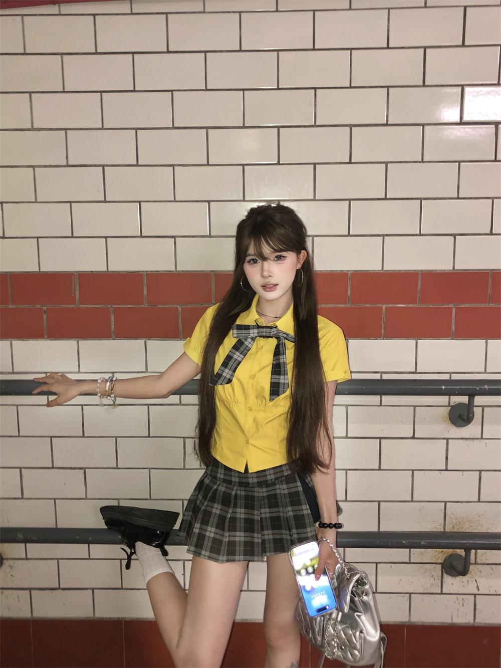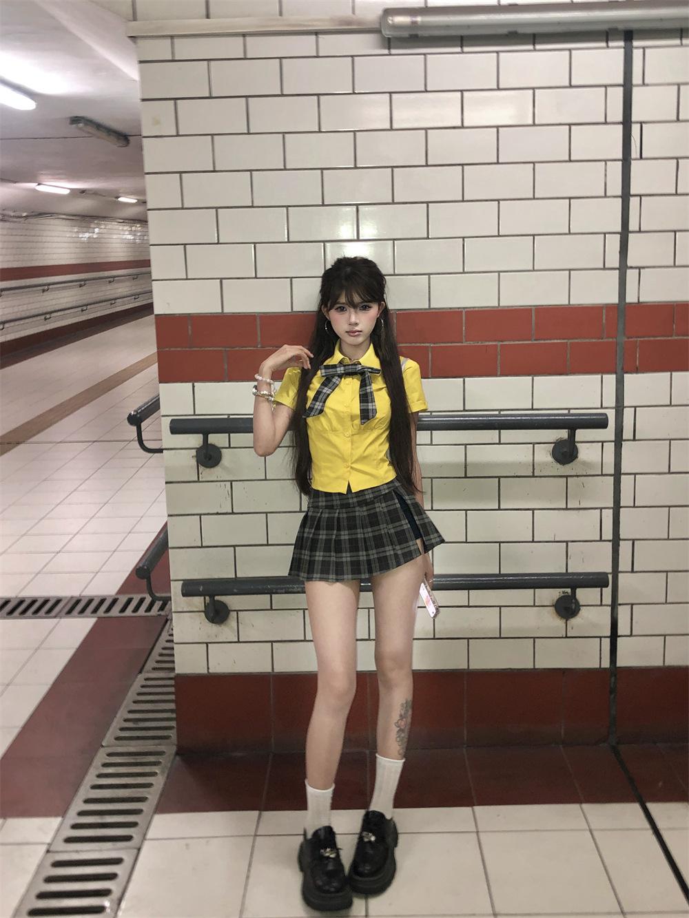 PD: La falda midi tiene forro de shorts, la camisa se combina con un moño a cuadros.