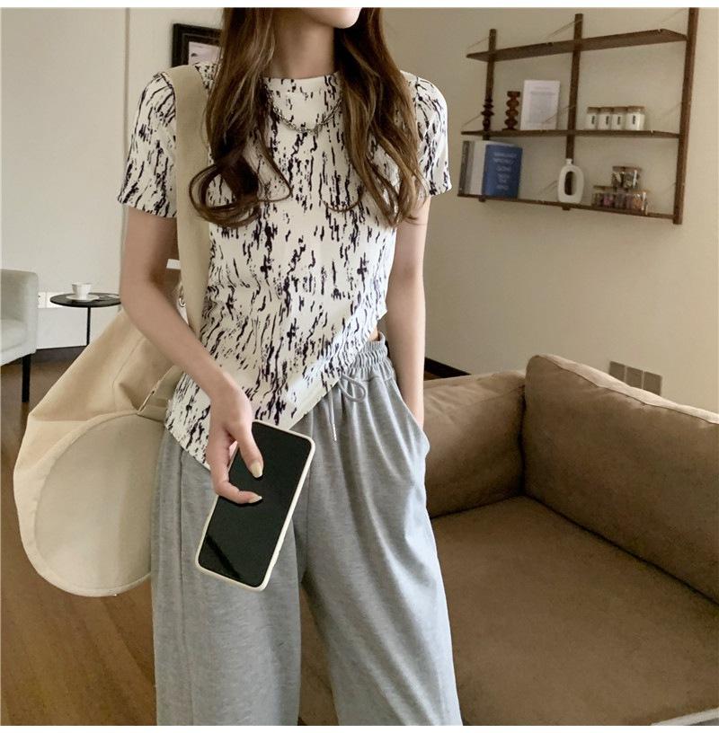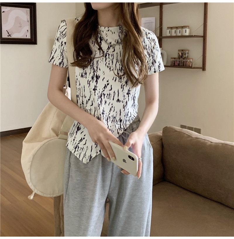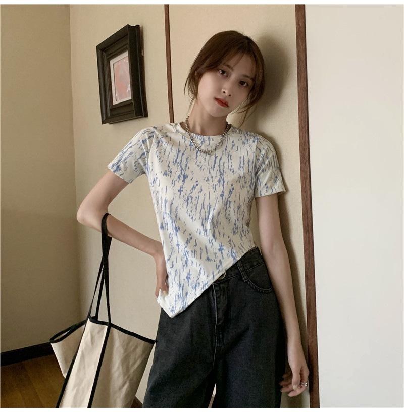 Verano 2025 Nuevo Estilo Coreano Look Adelgazante Tie-Dye Top Asimétrico Inclinado Camiseta de Manga Corta para Mujer Tendencia Ins