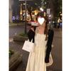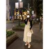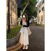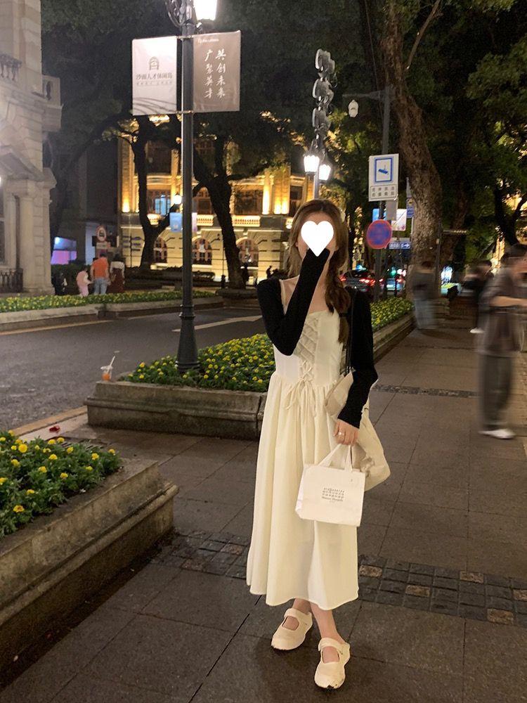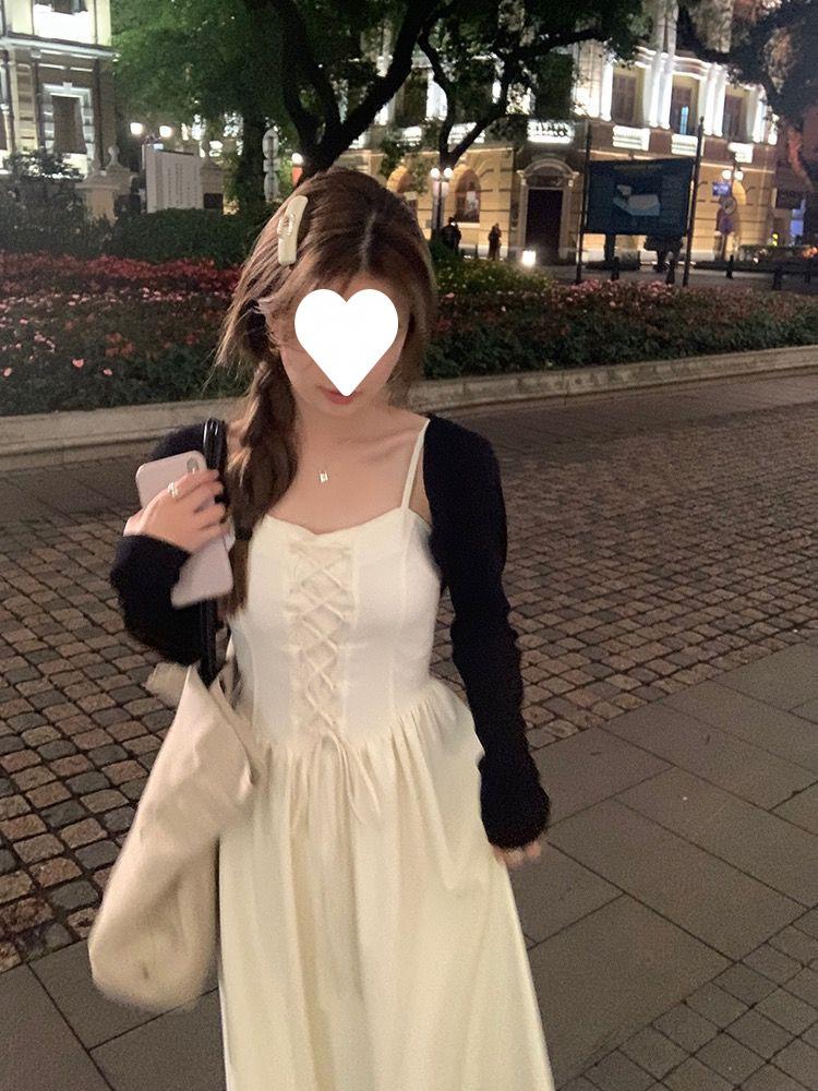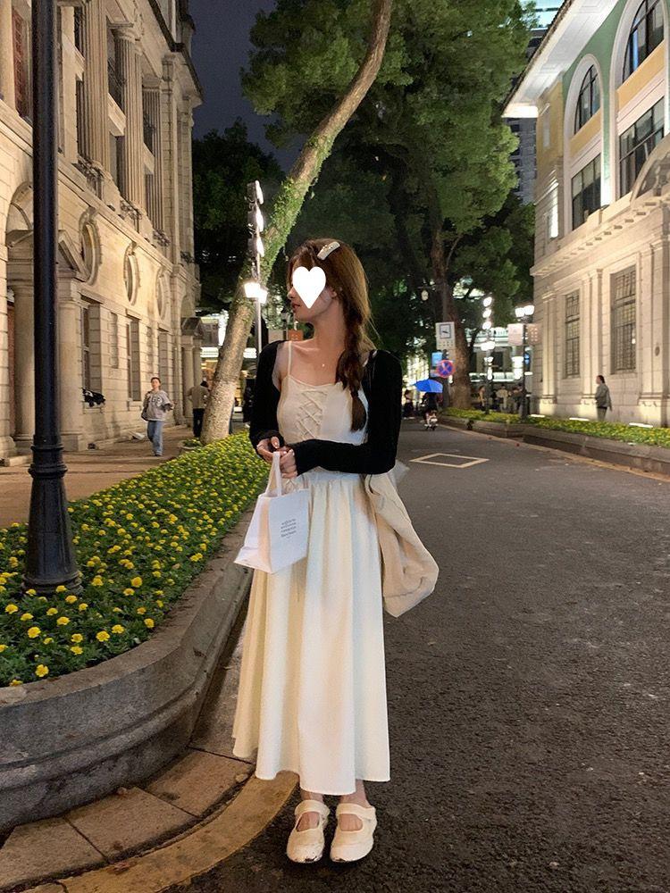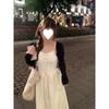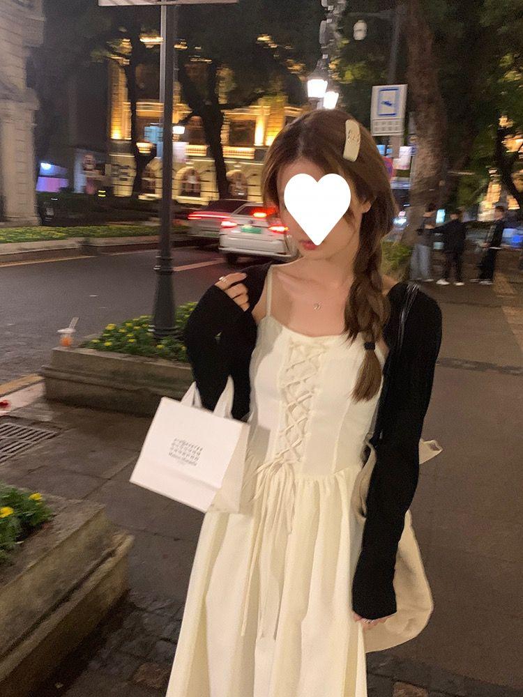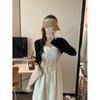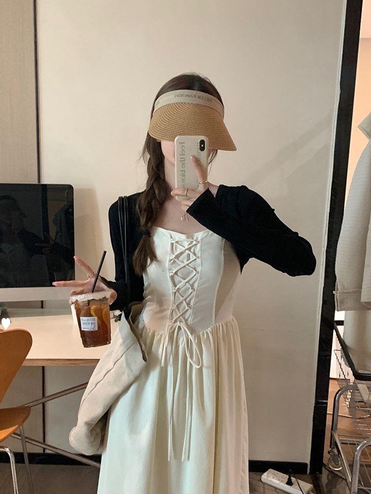 Conjunto de temperamento suave estilo francés color té con corbata, vestido largo de tirantes spaghetti texturizado de corte slim-fit, capa pequeña y cárdigan de dos piezas protector solar