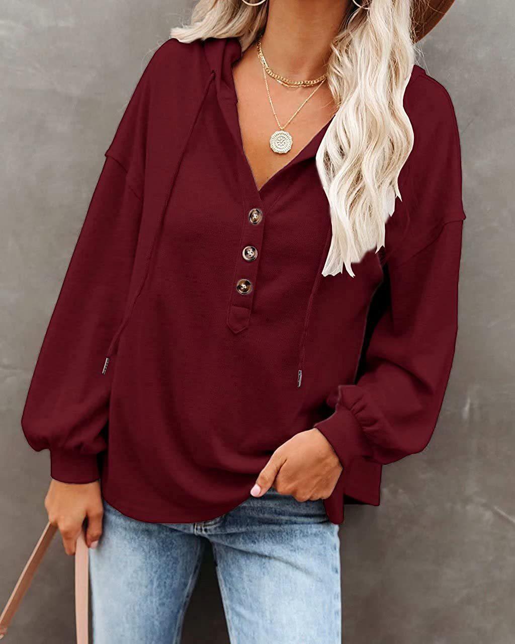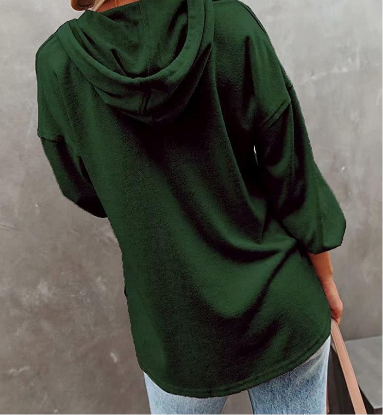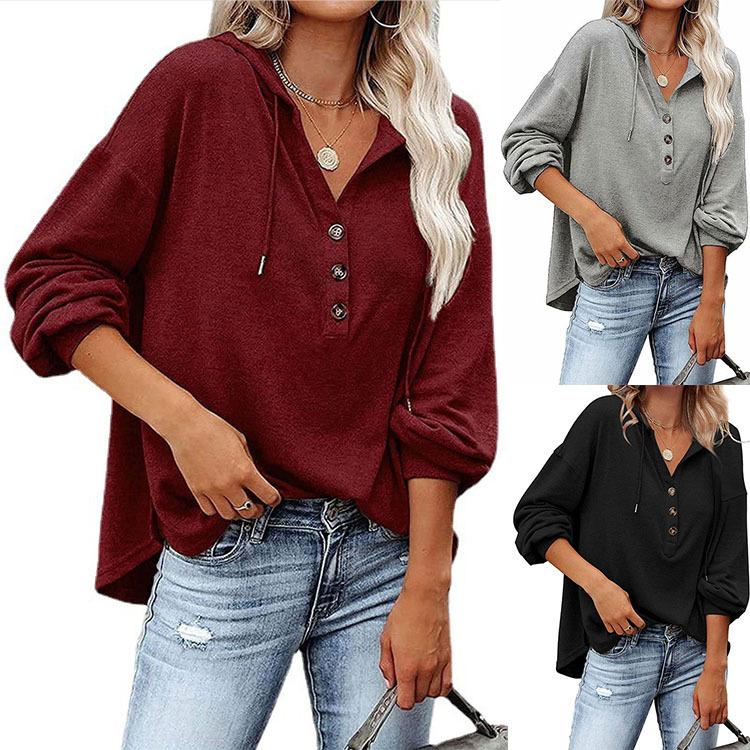 Sudadera con capucha europea y americana transfronteriza de comercio exterior, suéter con botones, holgada, de color sólido, manga larga, top deportivo casual, ropa de mujer de Amazon
