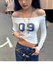 Camiseta de Manga Larga con Hombro Descubierto Estilo Americano para Chica Sexy con Estampado de Letras, Rayas, Costuras en Contraste, Corte Slim y Corta