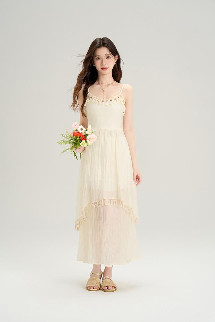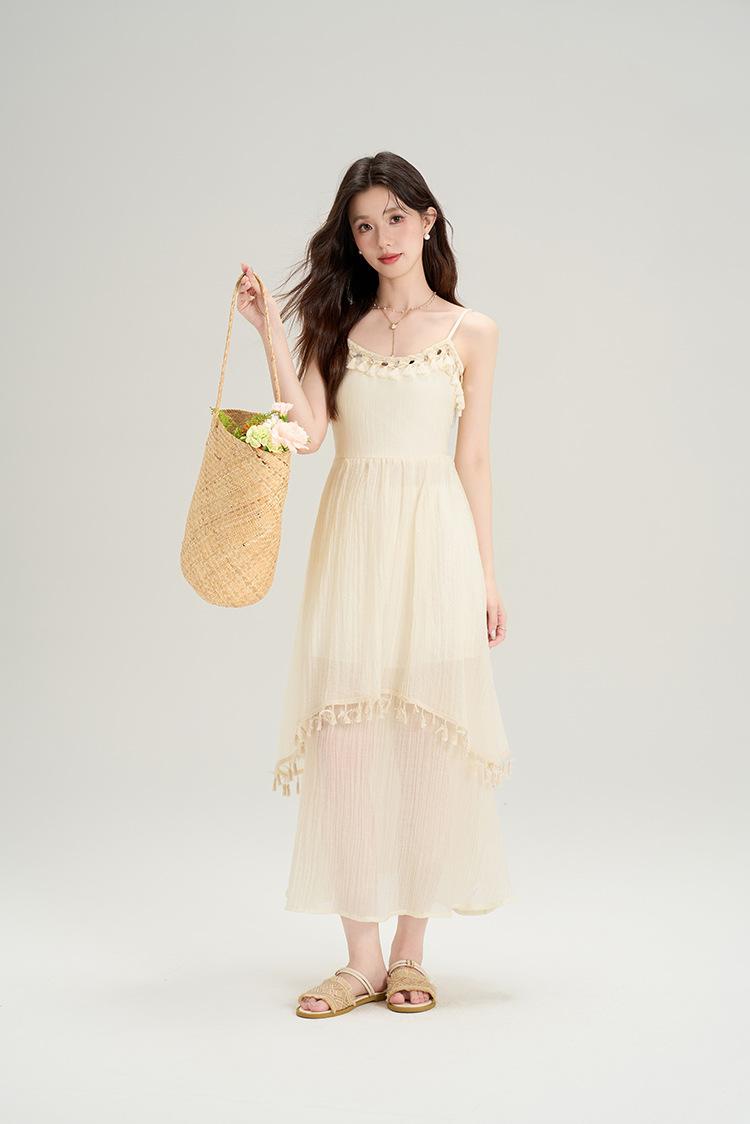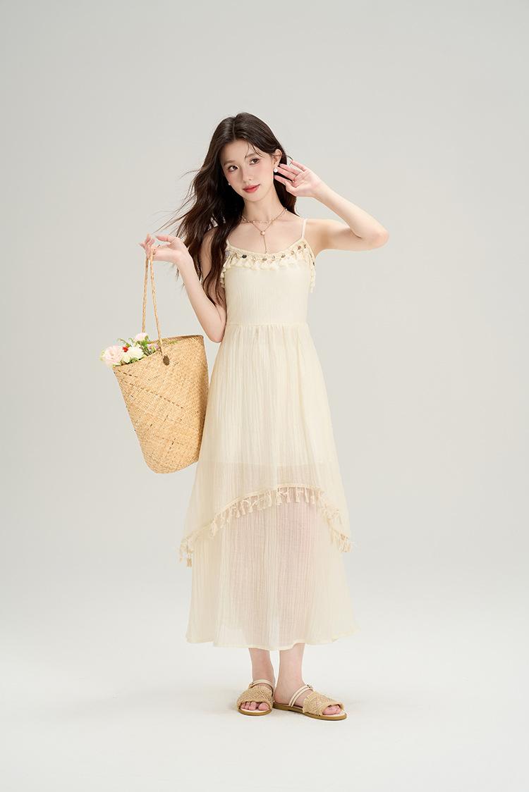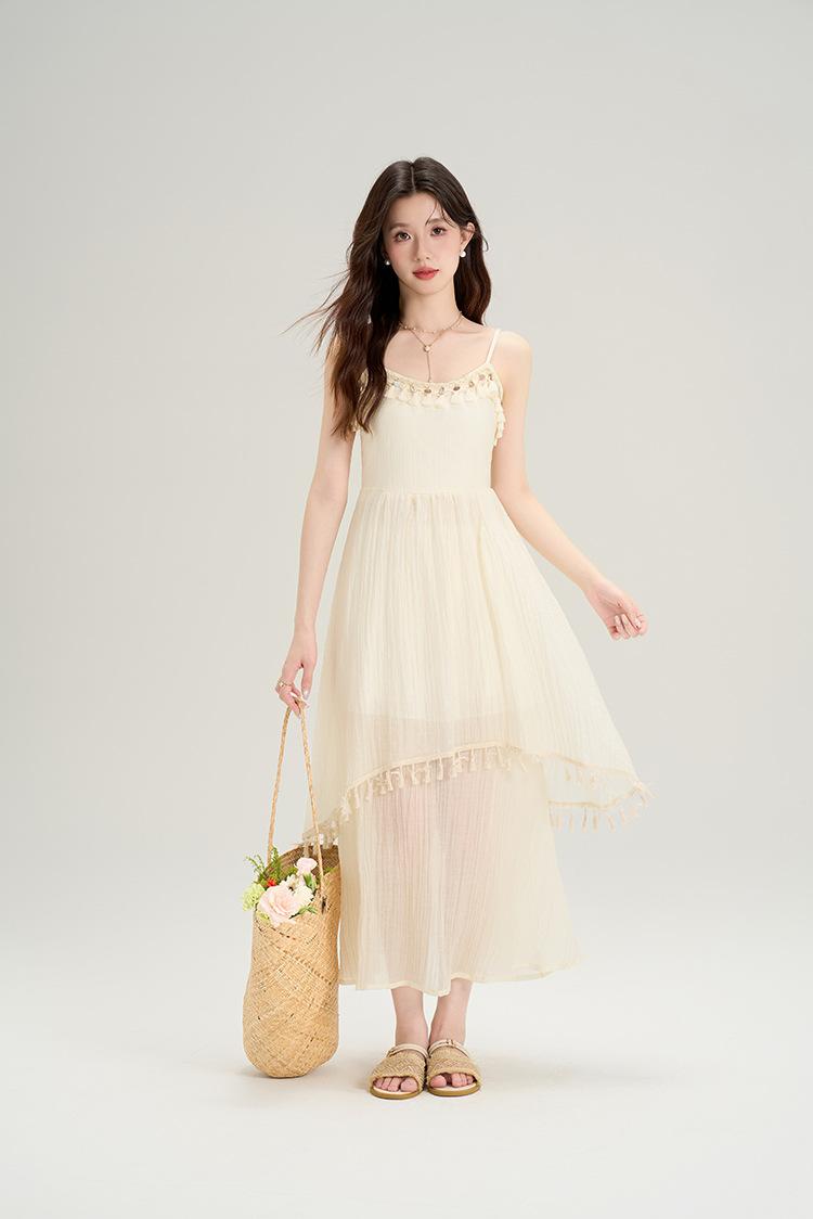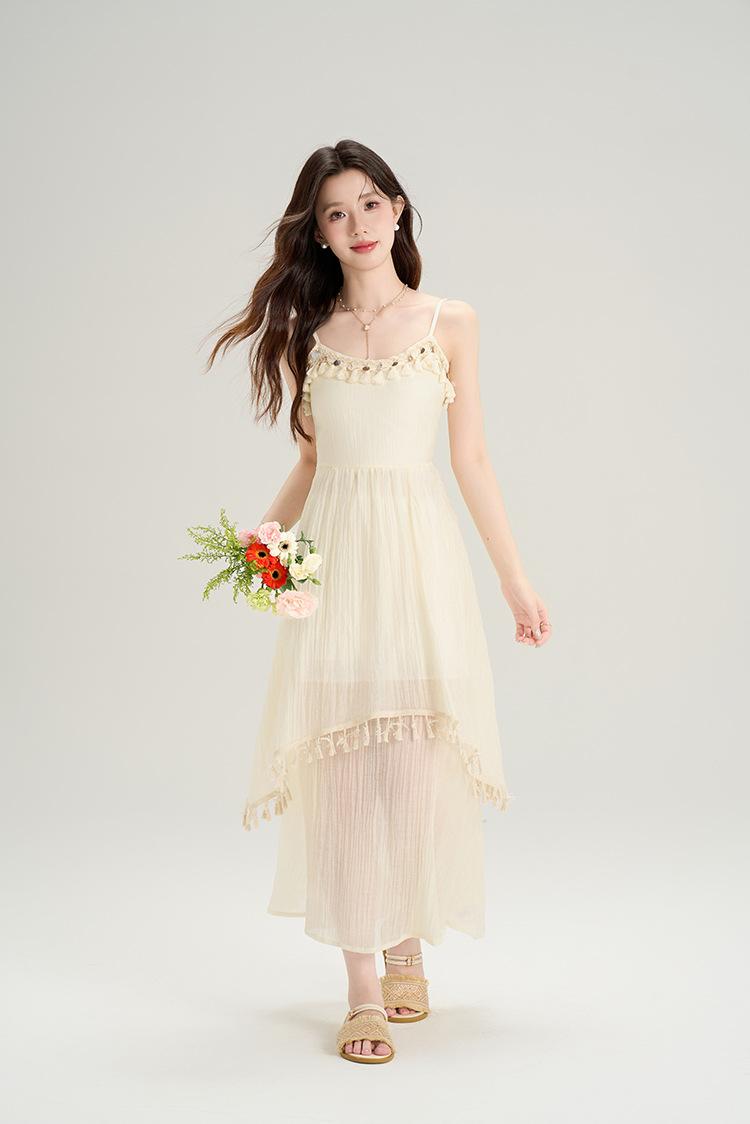 2025 Nuevo Estilo de Verano Retro Francés Estilo Vacacional Falda de Tirantes con Borlas para Mujer con Cintura Pequeña y Aspecto Adelgazante Vestido Línea A