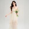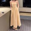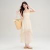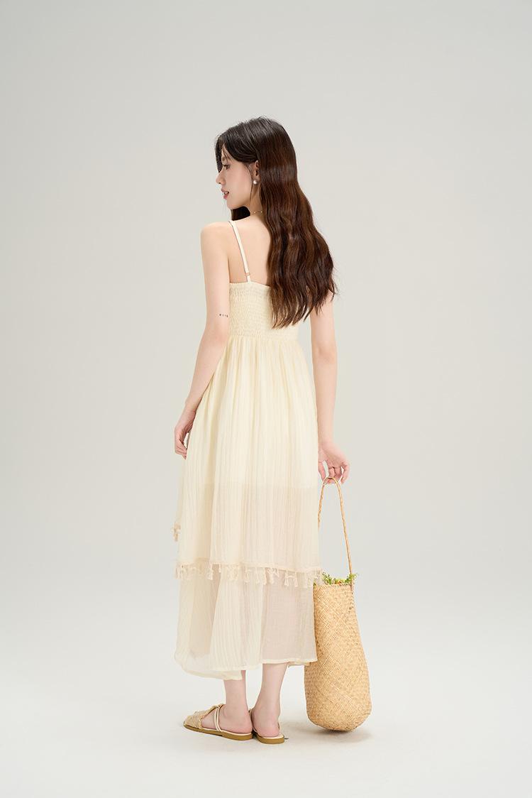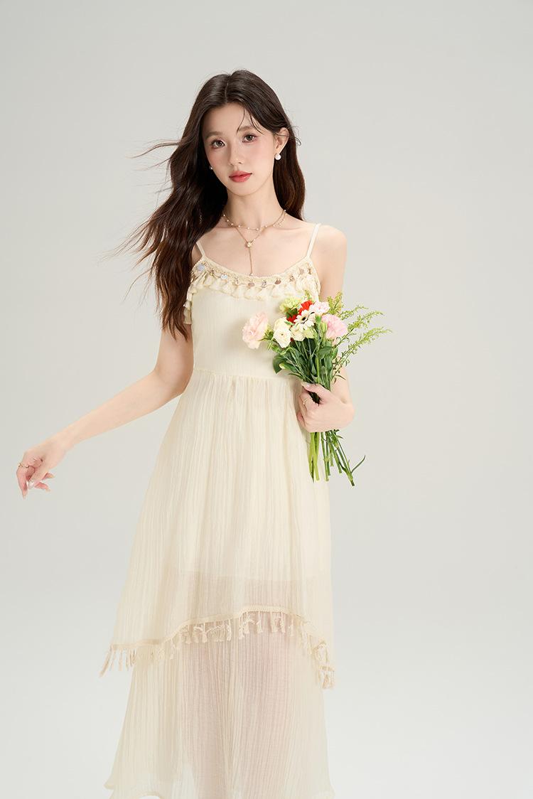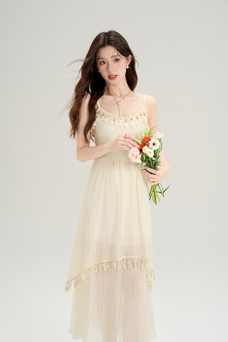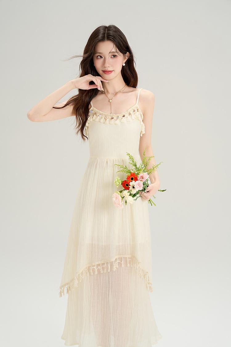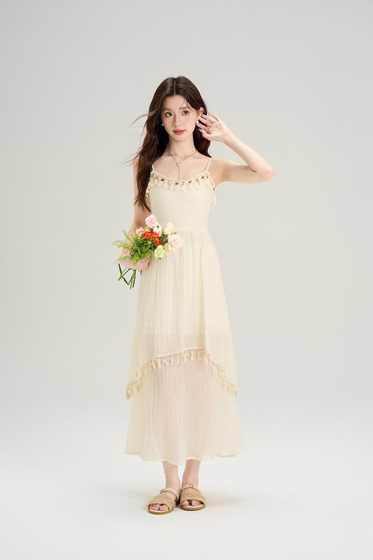 2025 Nuevo Estilo de Verano Retro Francés Estilo Vacacional Falda de Tirantes con Borlas para Mujer con Cintura Pequeña y Aspecto Adelgazante Vestido Línea A