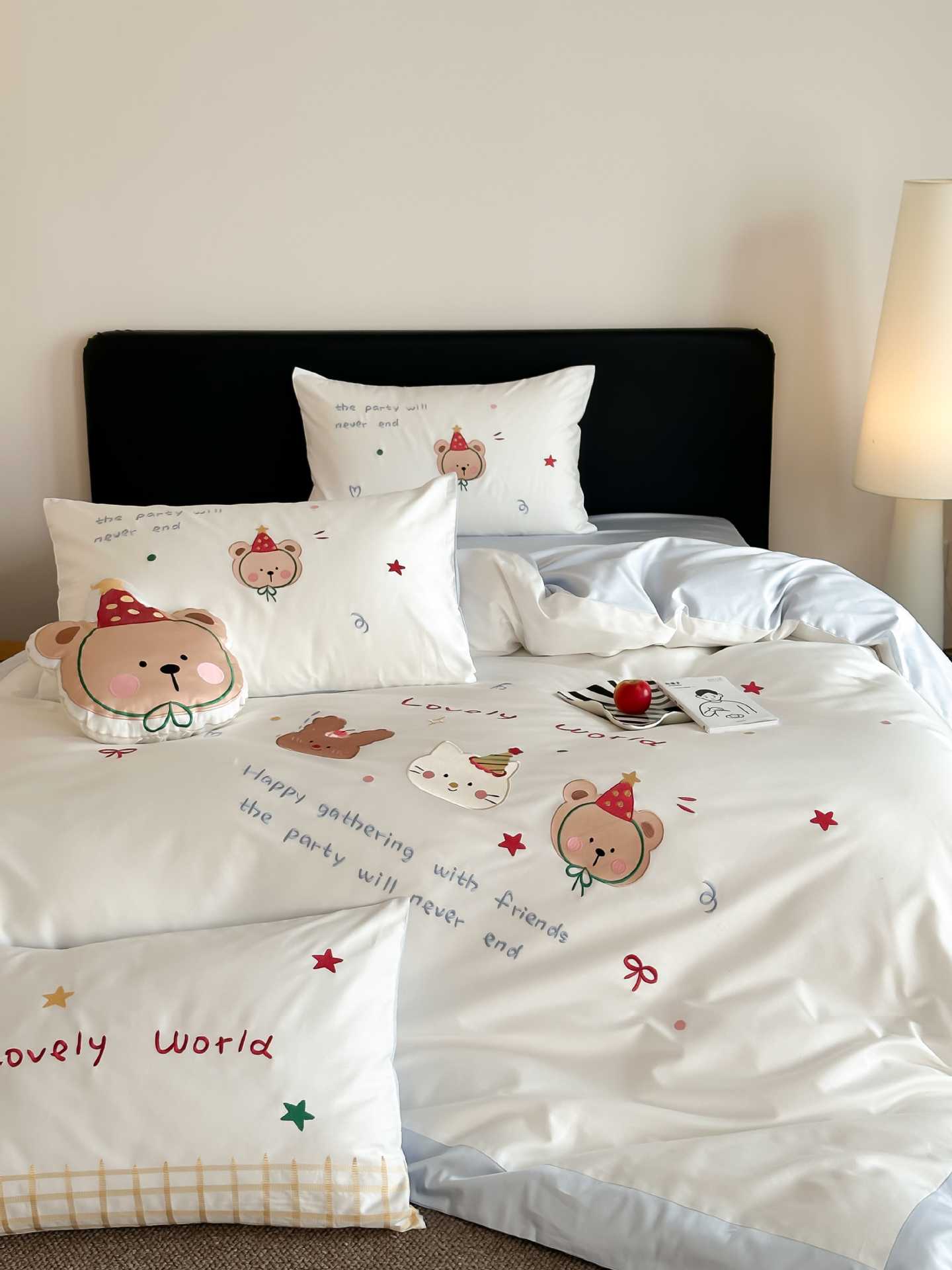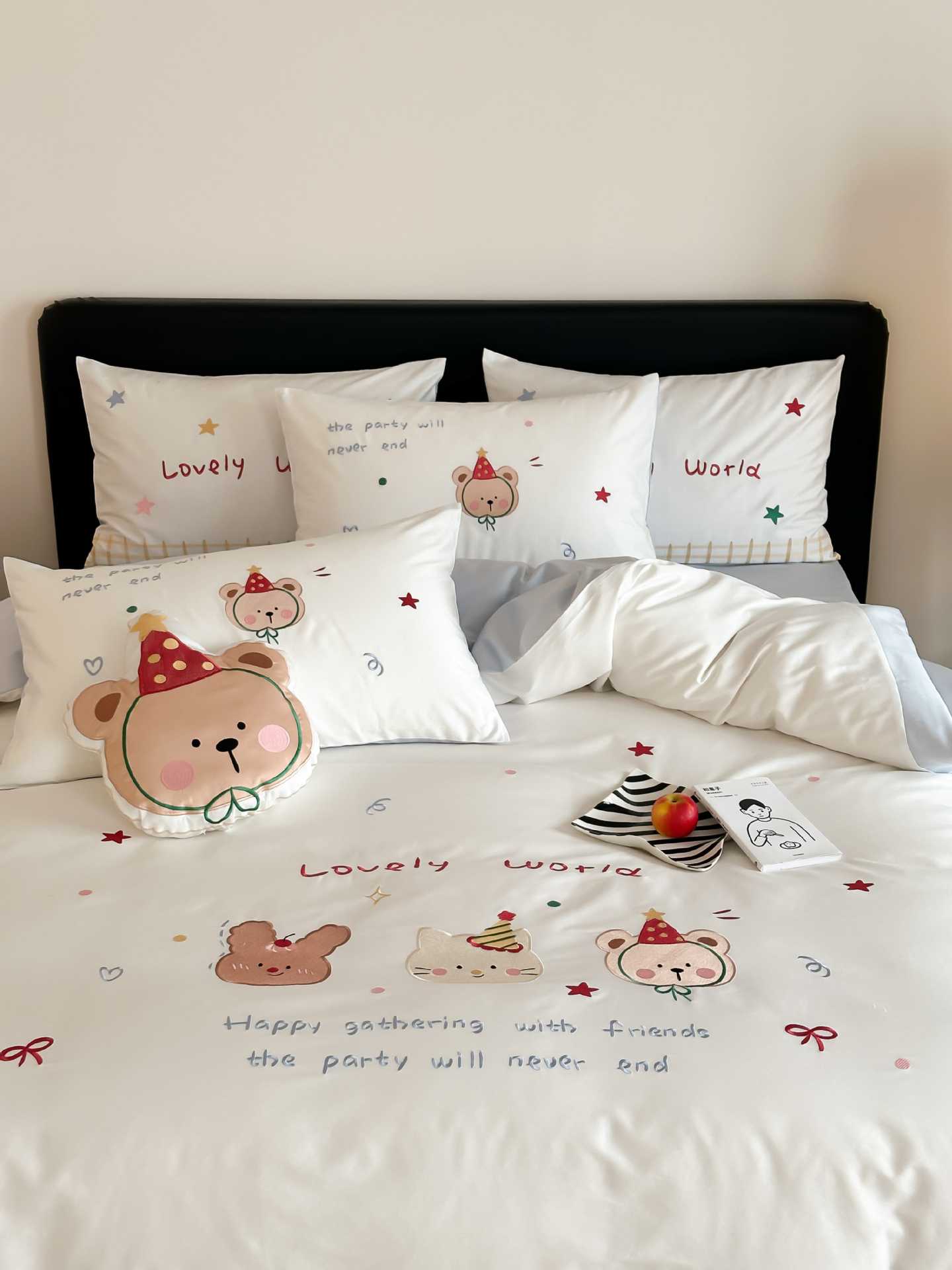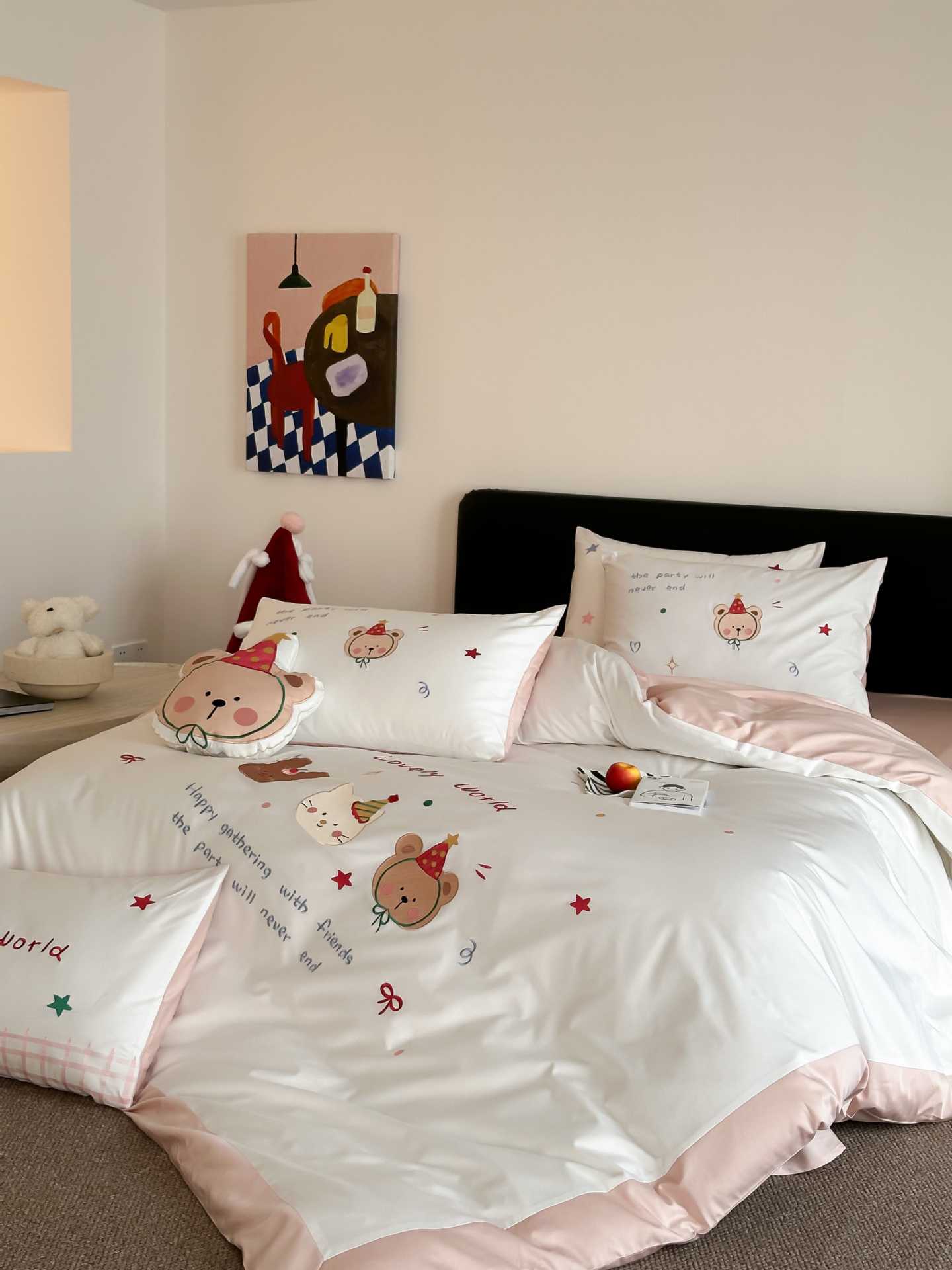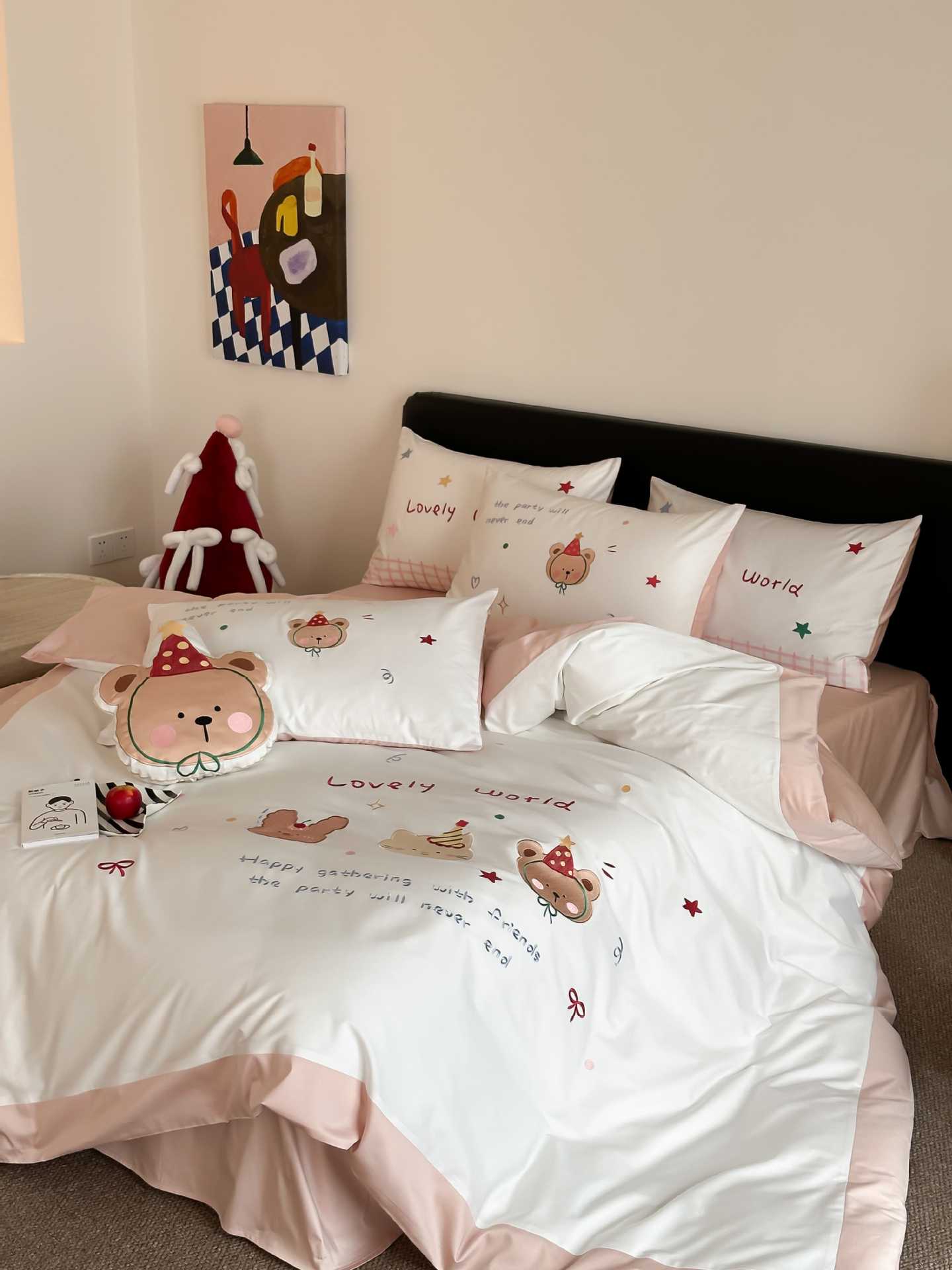 En este pequeño mundo, un lindo osito con un sombrero de fiesta juguetón 🎉 baila con estrellas y corazones.