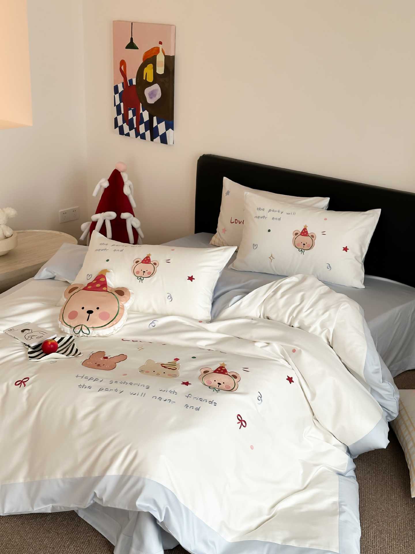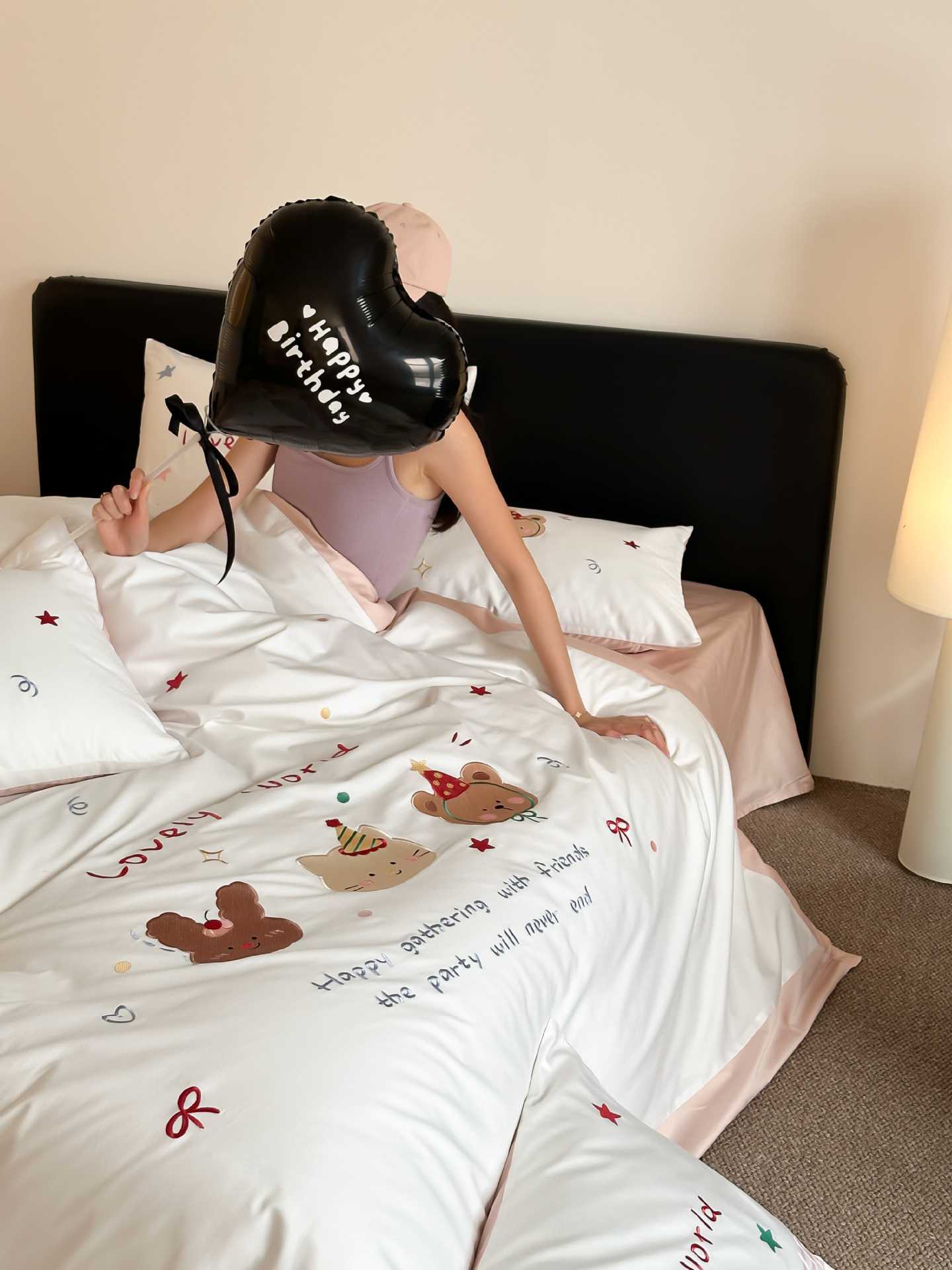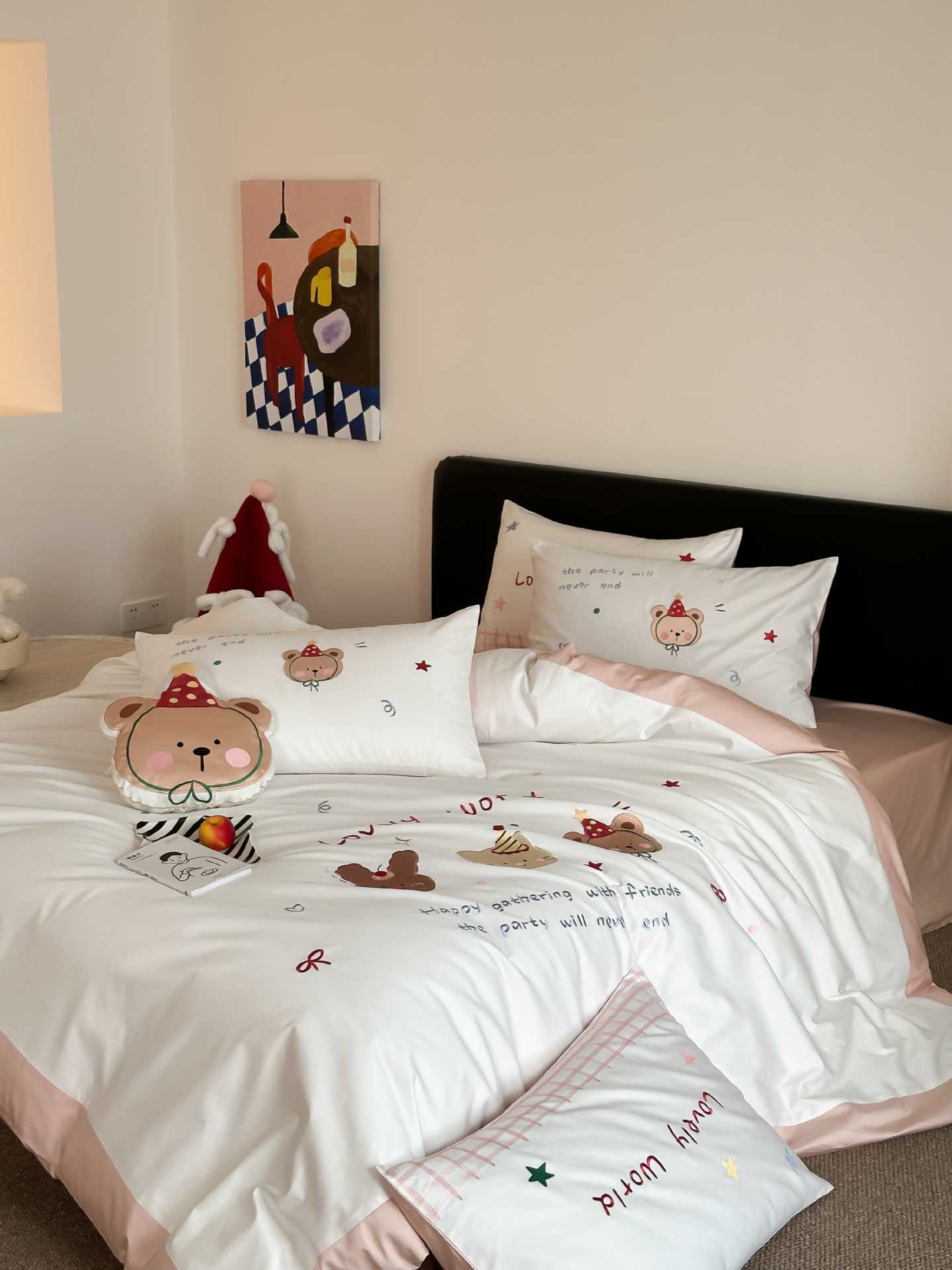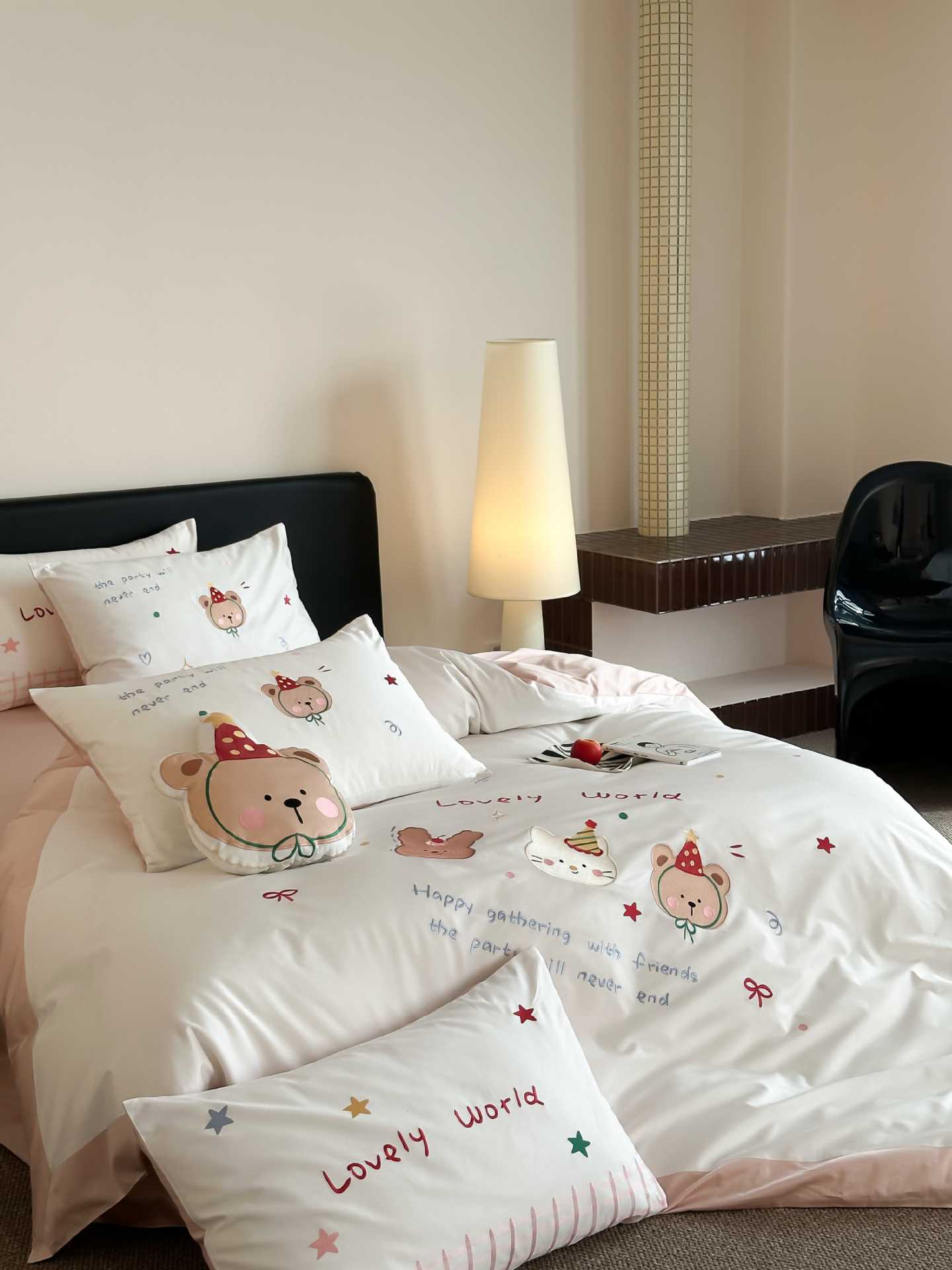 En este pequeño mundo, un lindo osito con un sombrero de fiesta juguetón 🎉 baila con estrellas y corazones.