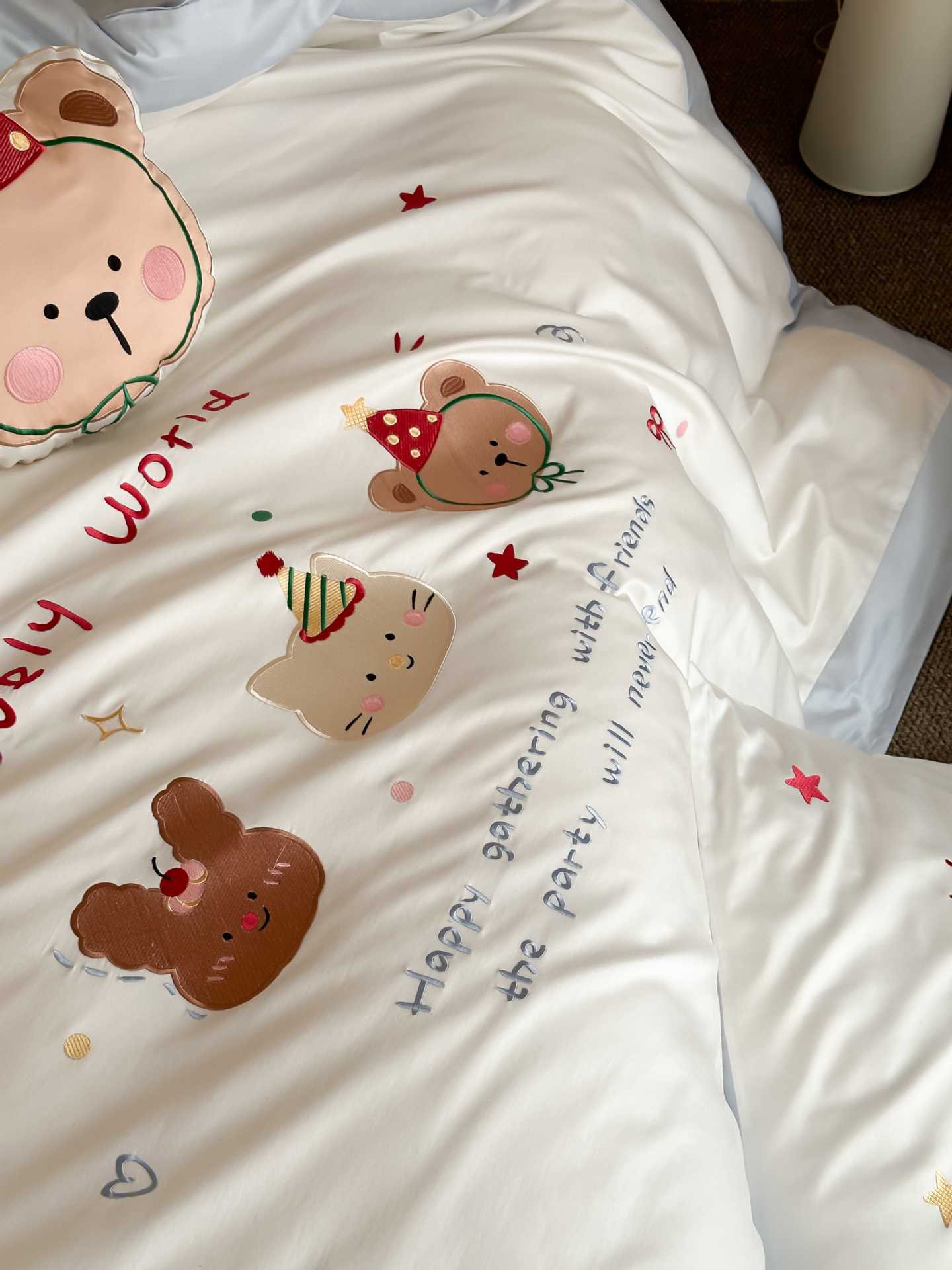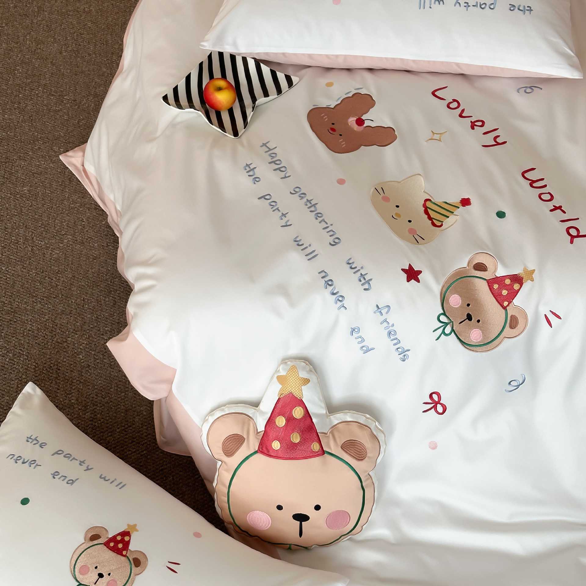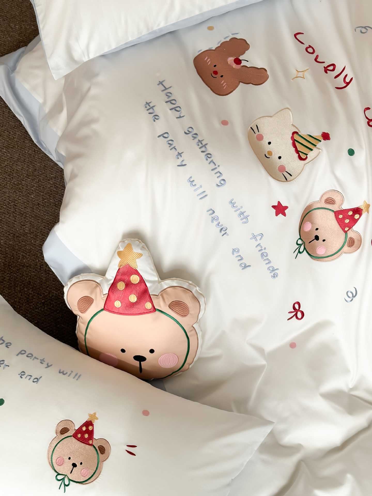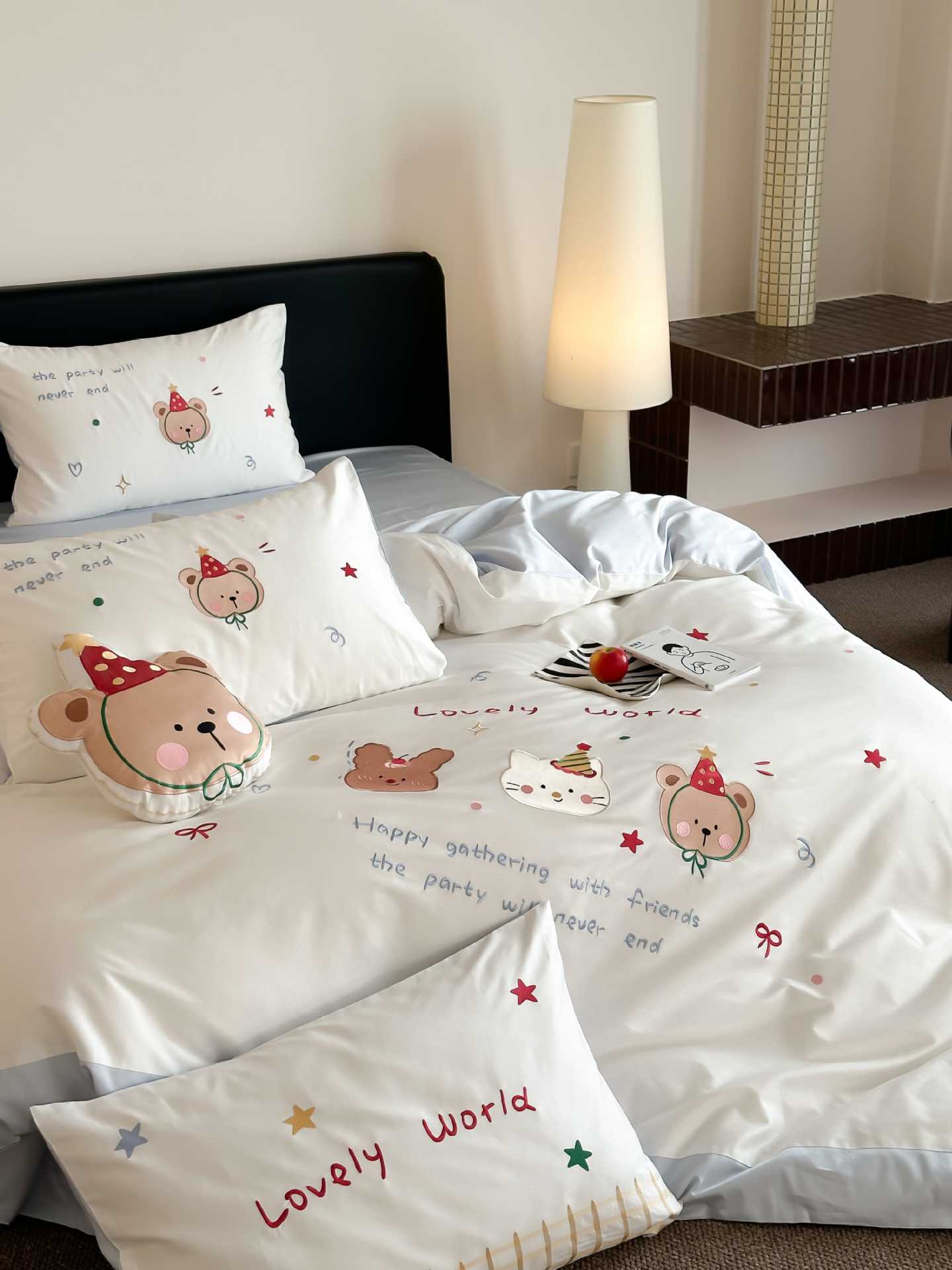 En este pequeño mundo, un lindo osito con un sombrero de fiesta juguetón 🎉 baila con estrellas y corazones.