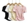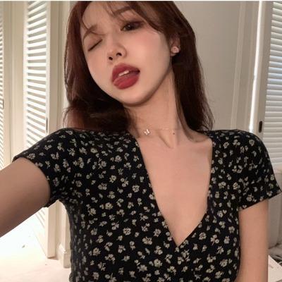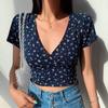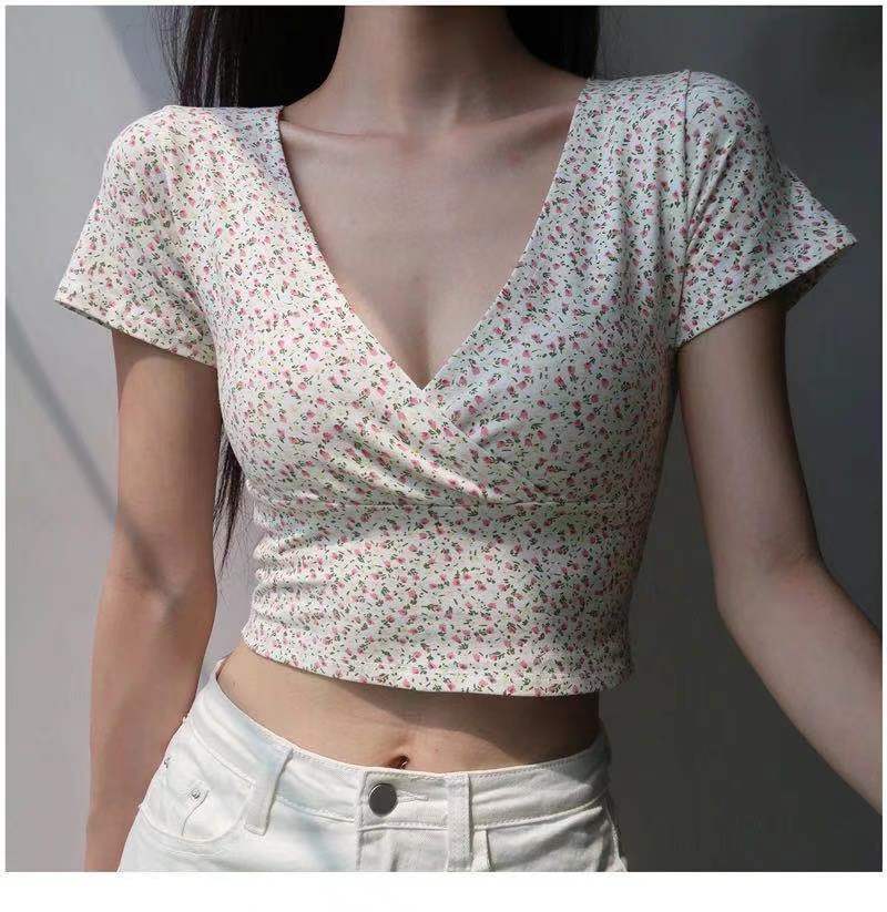 Nuevo Top Elegante Floral Corto Descubriendo el Ombligo para Mujer Verano Look Adelgazante Cuello en V Manga Corta Camiseta Estilo Coreano para Mujer Trendy