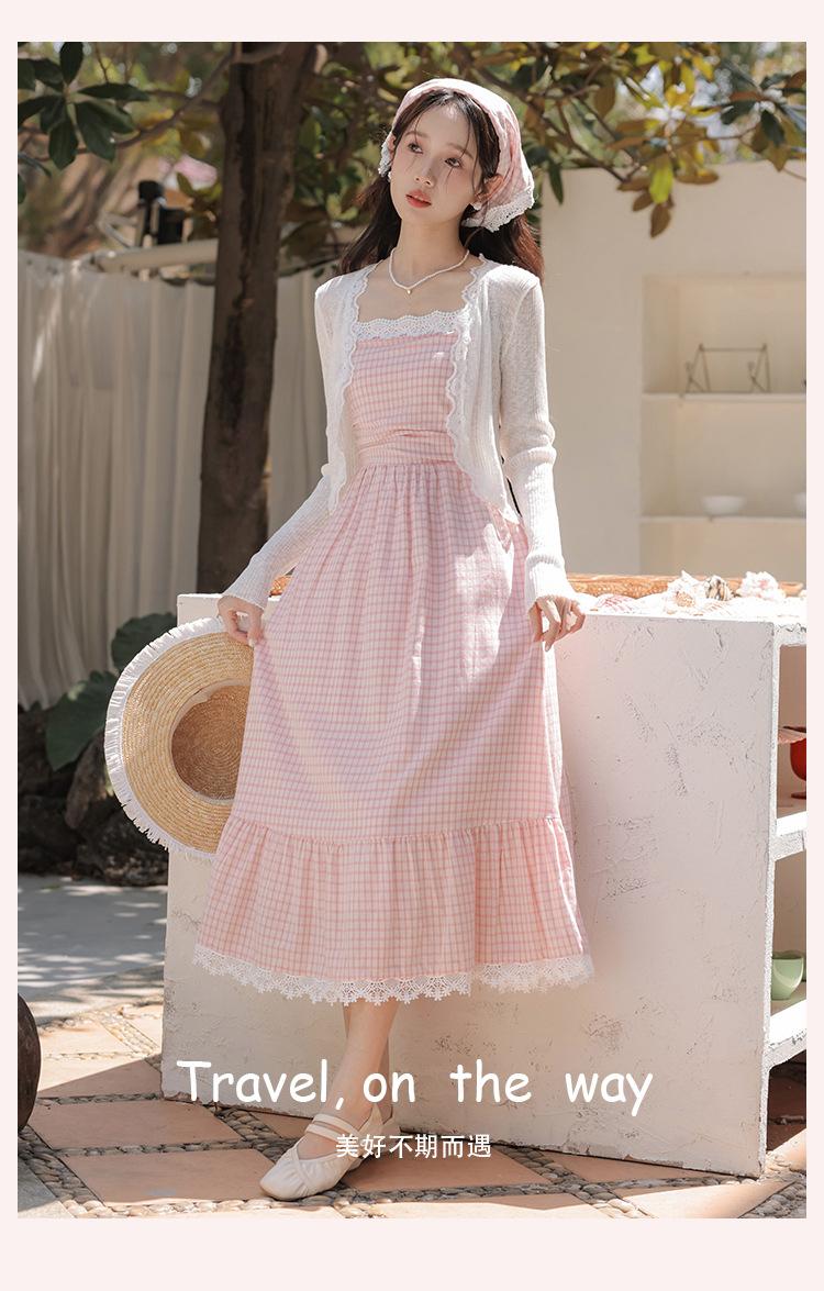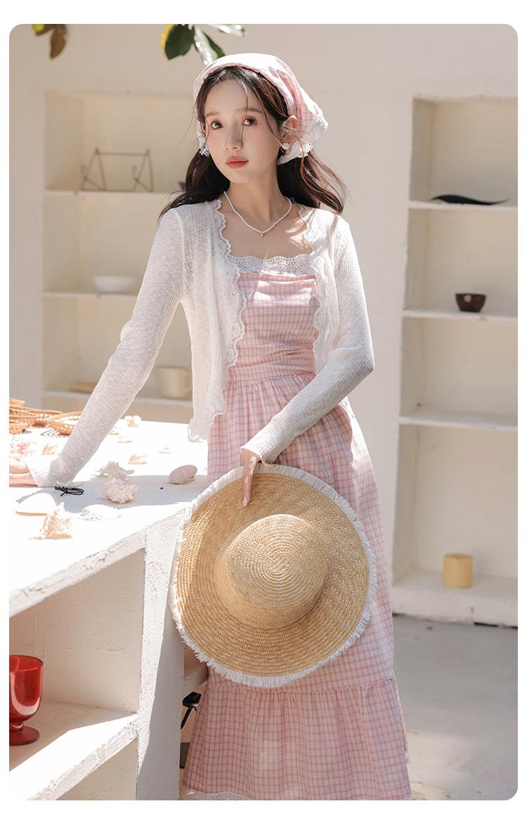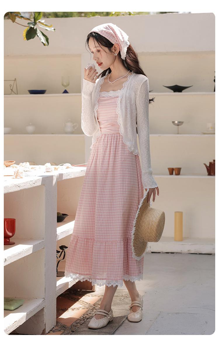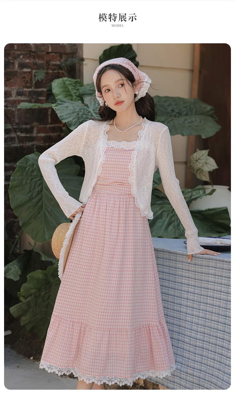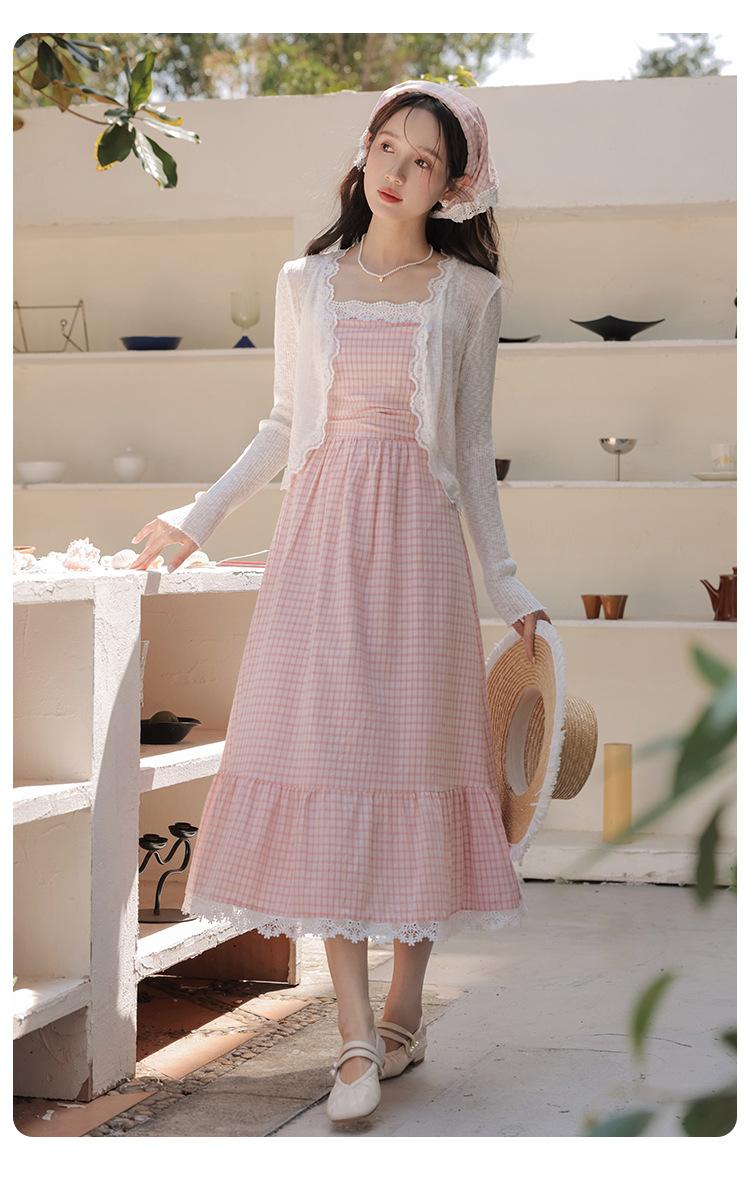 Vestido Vintage de Estilo Suave con Sensación de Alta Gama Adelgazante Vacaciones Cuadros Tirantes Falda A Línea Cárdigan de Encaje Conjunto de Dos Piezas