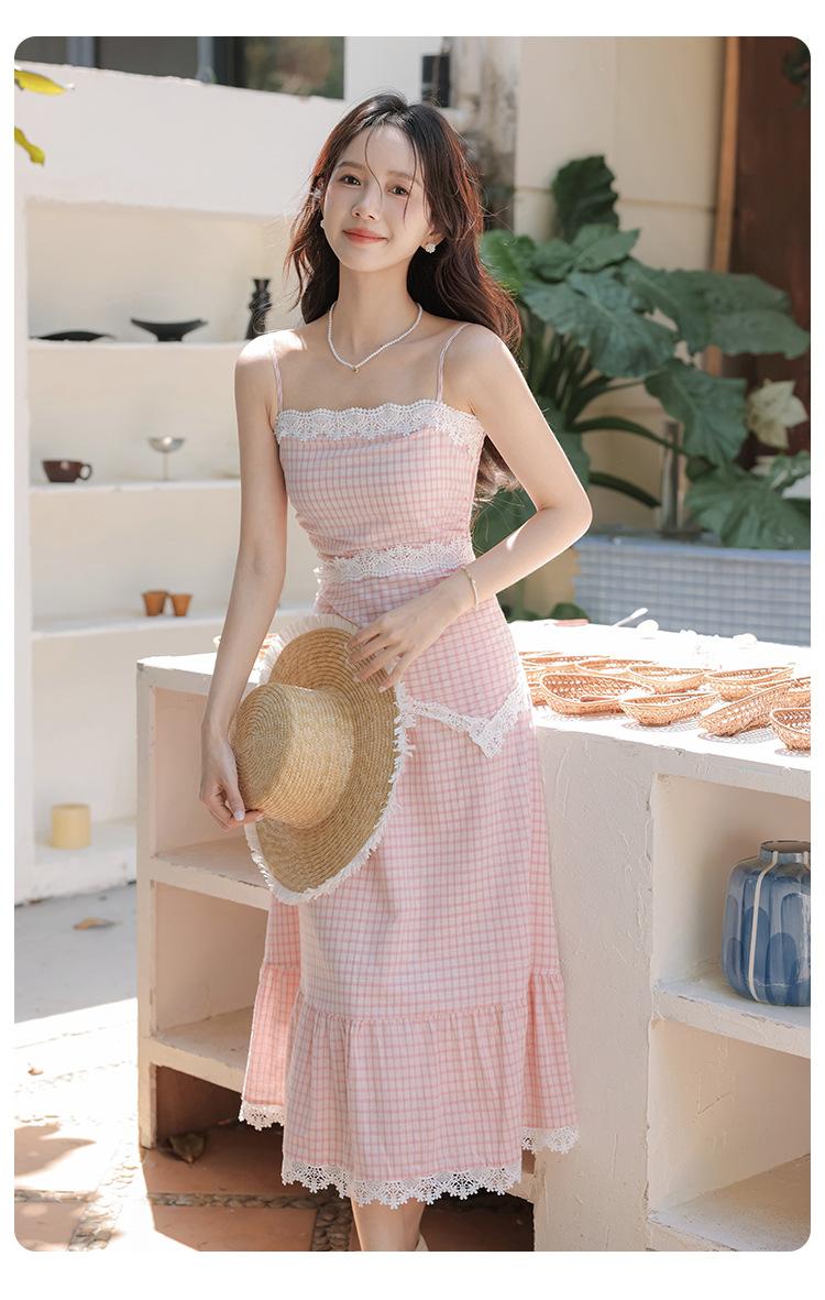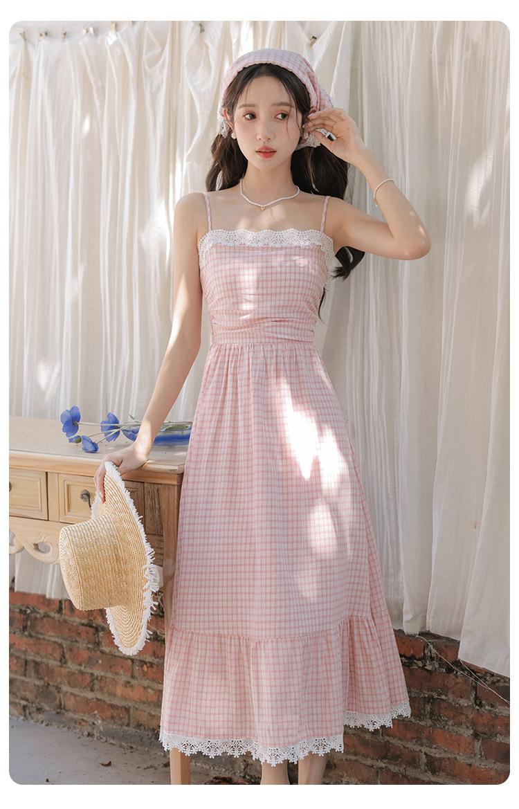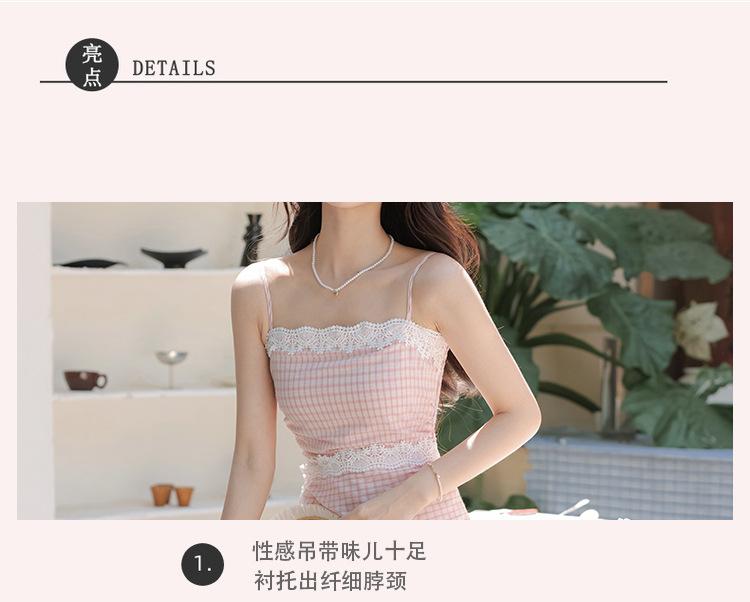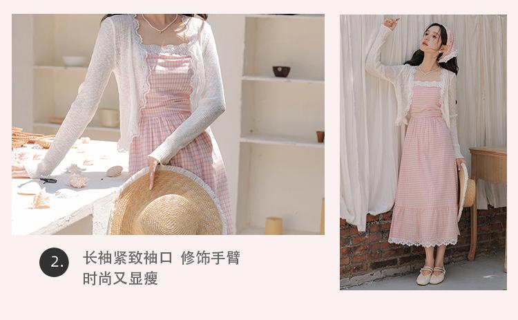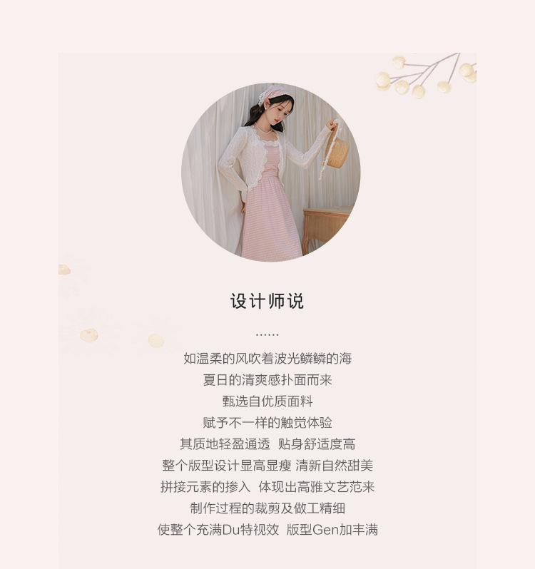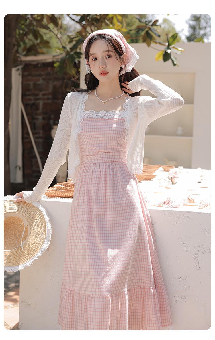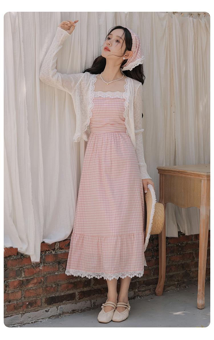 Vestido Vintage de Estilo Suave con Sensación de Alta Gama Adelgazante Vacaciones Cuadros Tirantes Falda A Línea Cárdigan de Encaje Conjunto de Dos Piezas