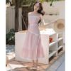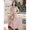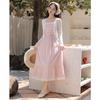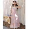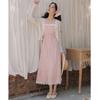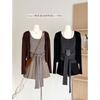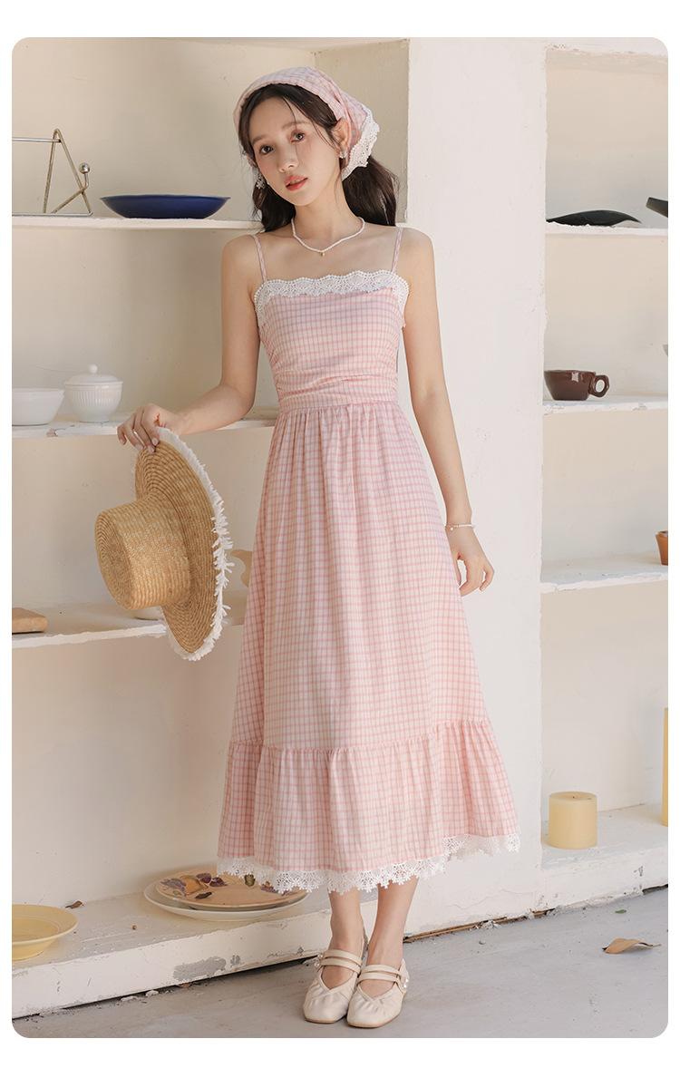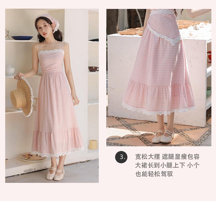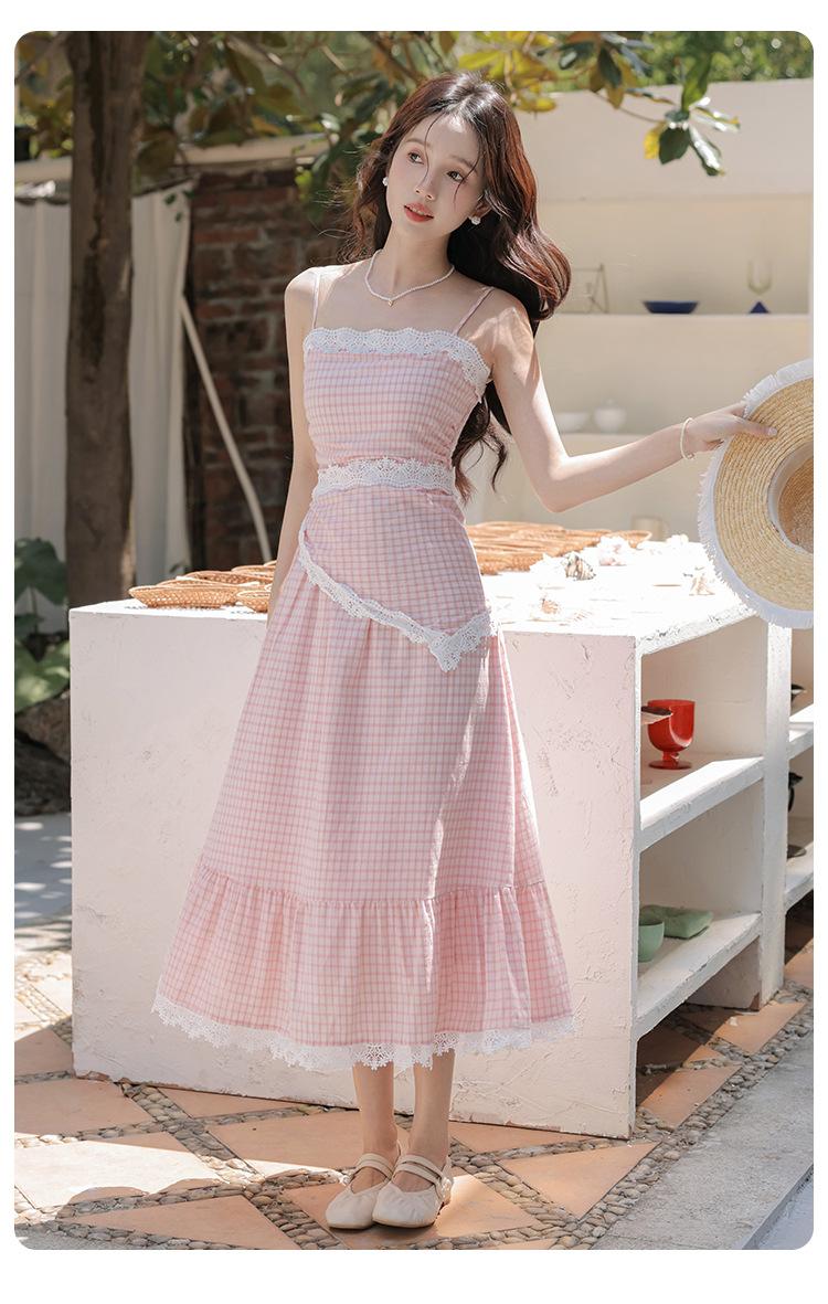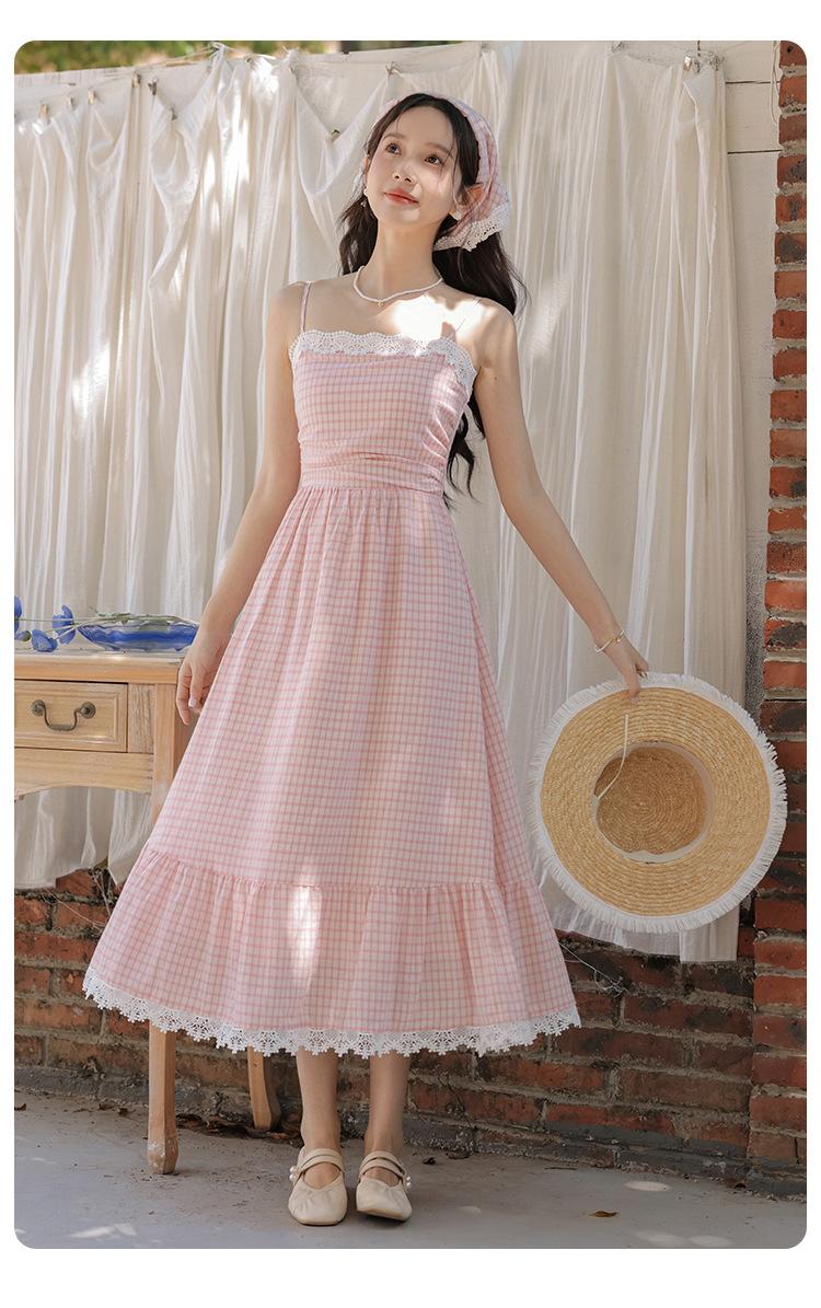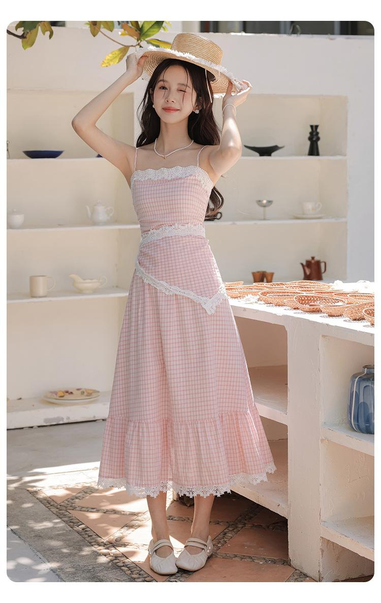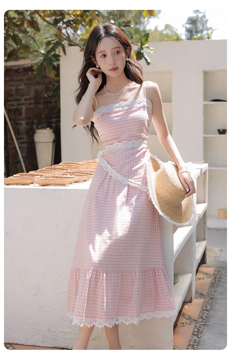 Vestido Vintage de Estilo Suave con Sensación de Alta Gama Adelgazante Vacaciones Cuadros Tirantes Falda A Línea Cárdigan de Encaje Conjunto de Dos Piezas