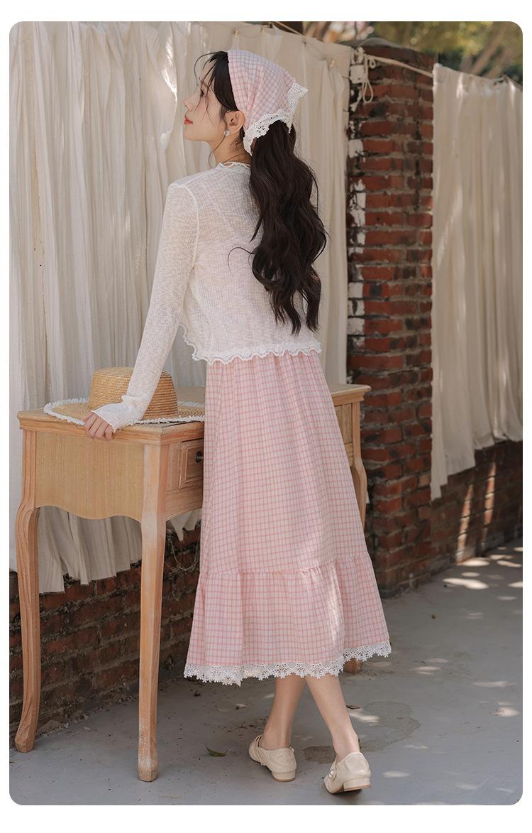 Pink plaid skirt comes with headscarf, Pink plaid + white lace cardigan