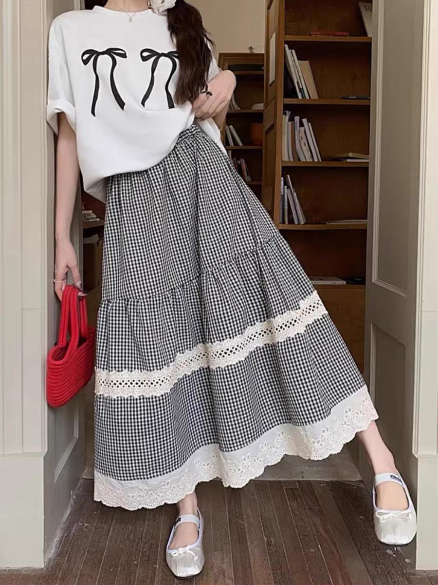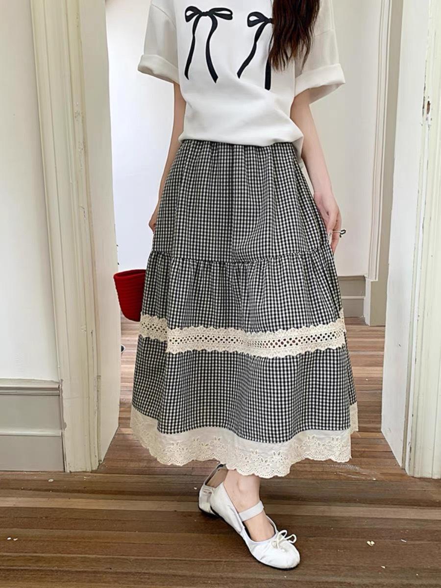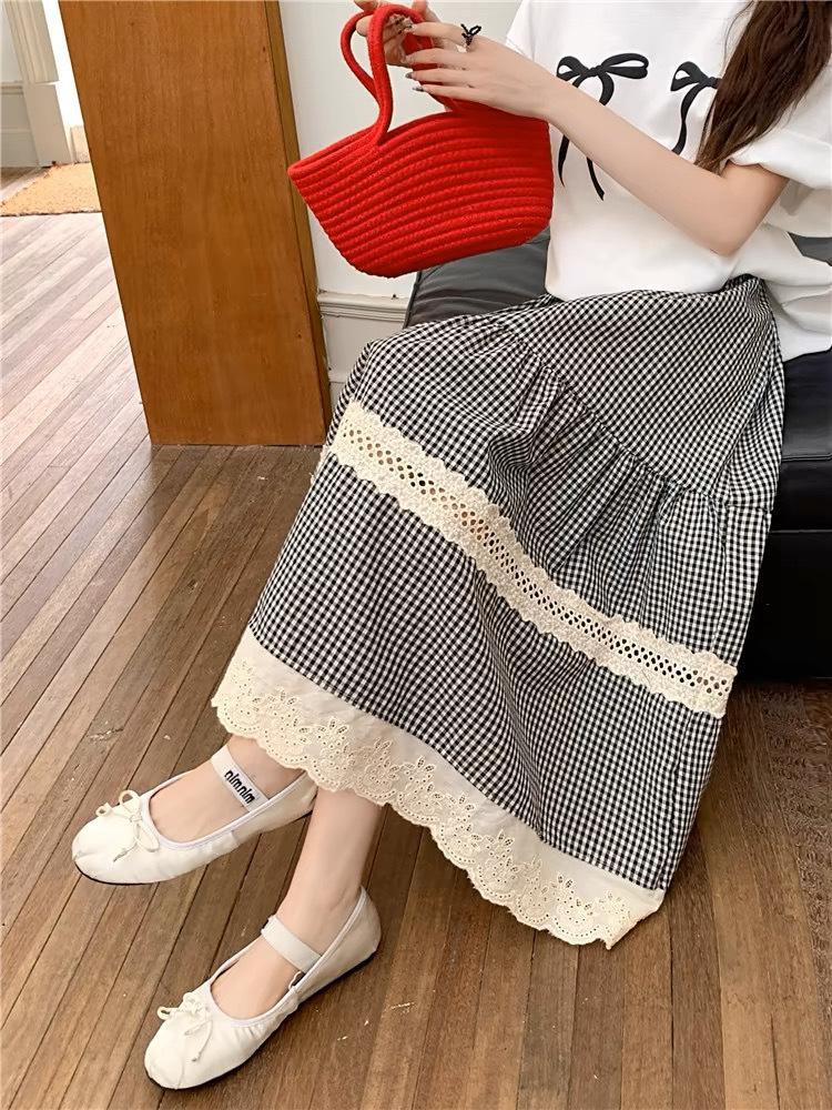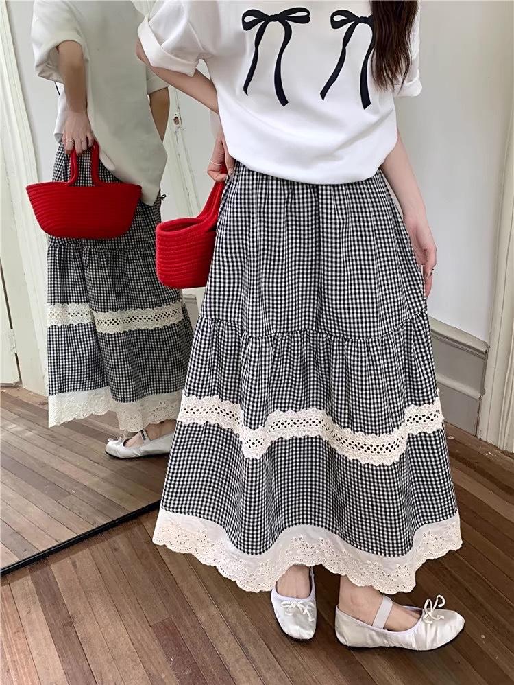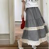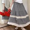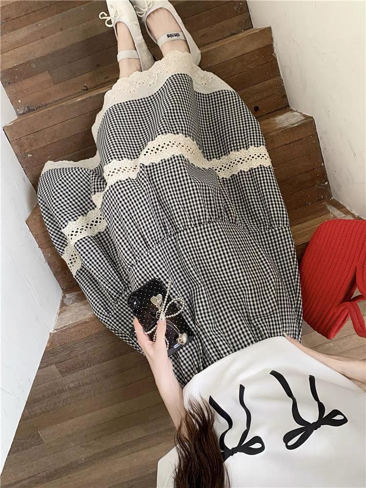 Falda Escocesa Retro para Mujer Primavera y Verano Nueva Falda Versátil A-Line de Cintura Alta Elástica Empalme de Encaje en Contraste Falda Midi