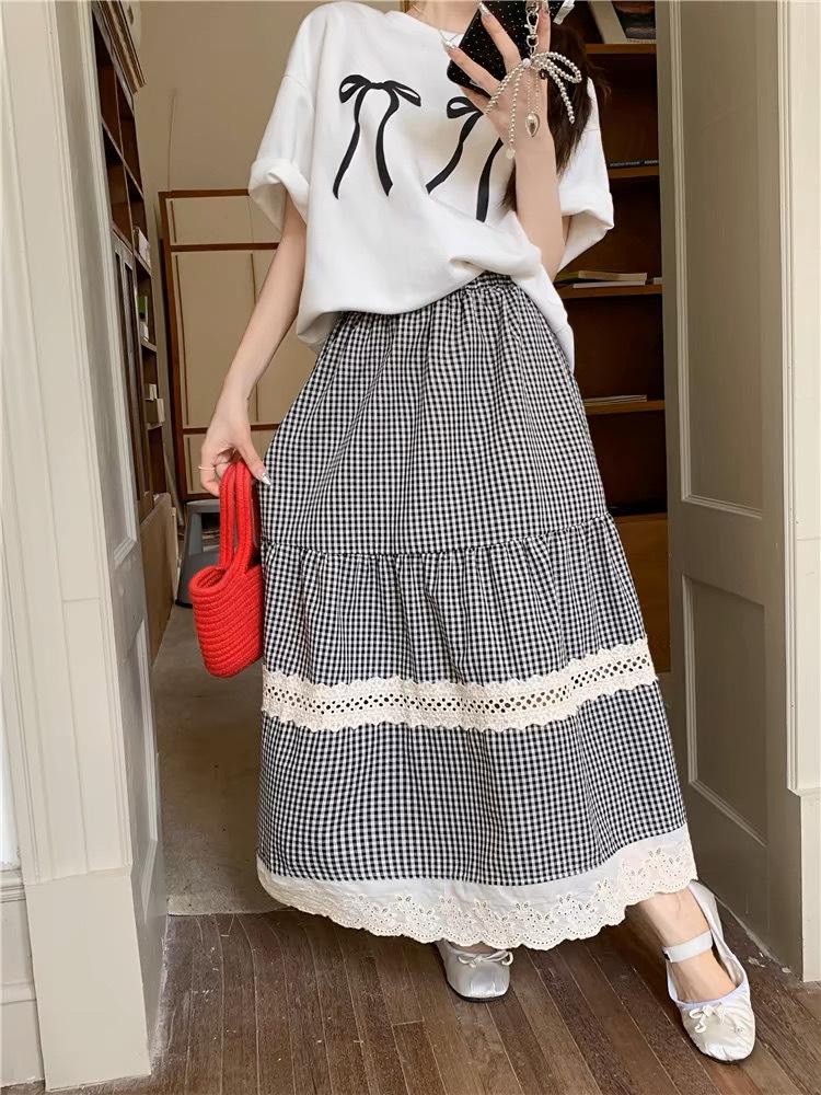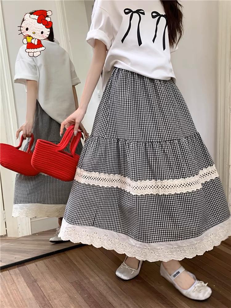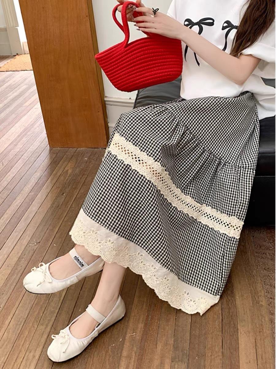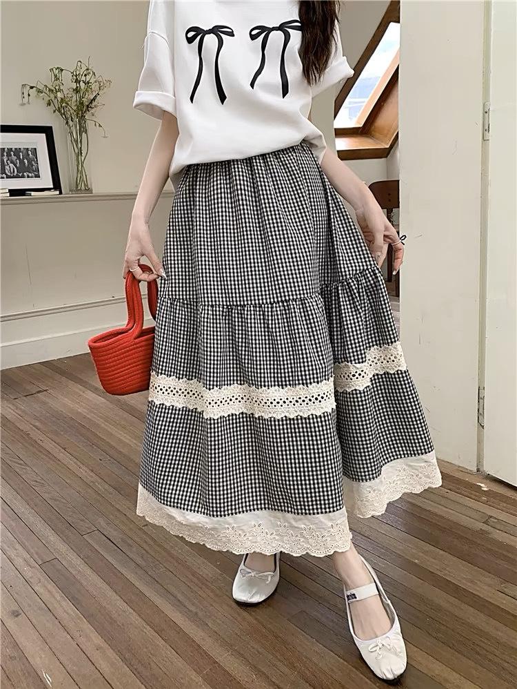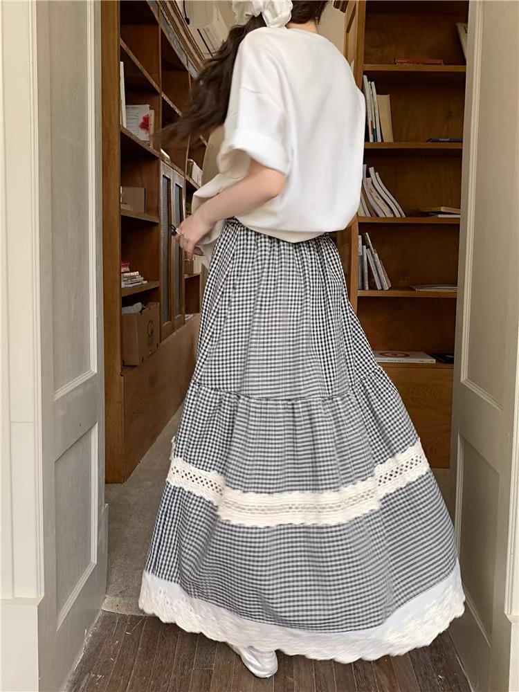 Falda Escocesa Retro para Mujer Primavera y Verano Nueva Falda Versátil A-Line de Cintura Alta Elástica Empalme de Encaje en Contraste Falda Midi